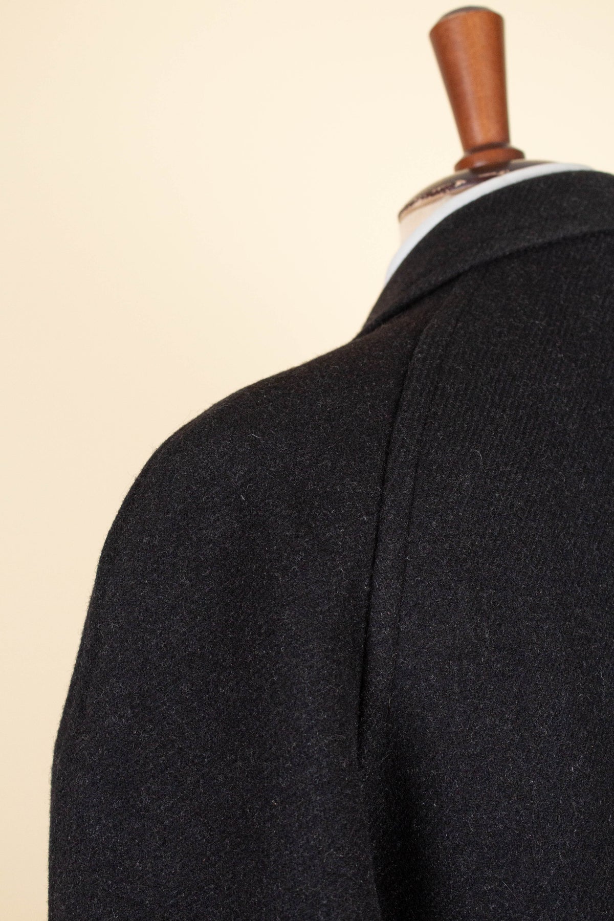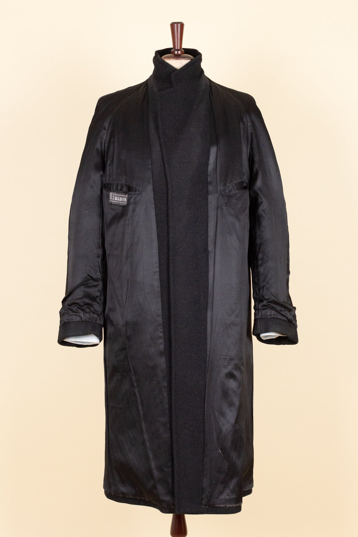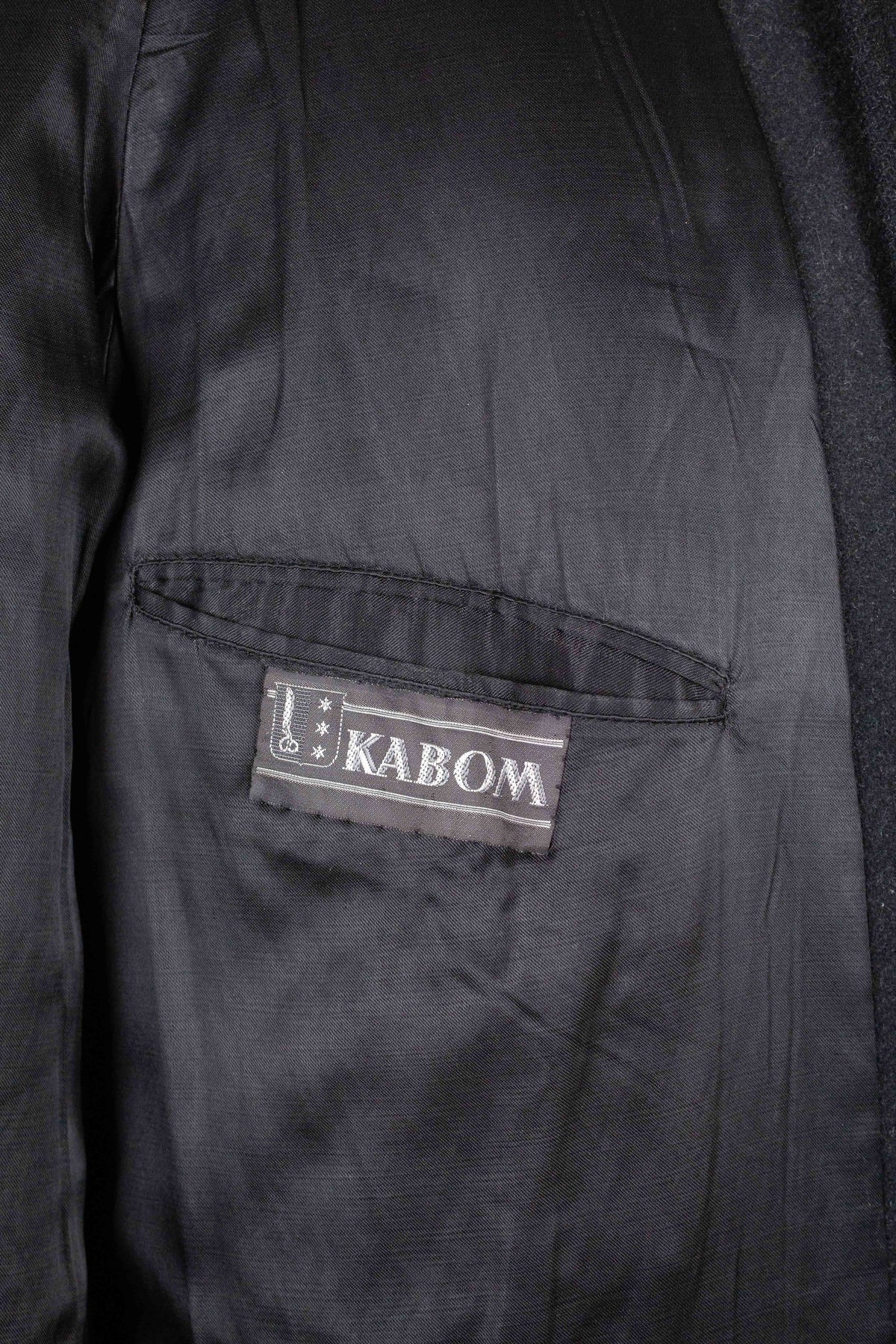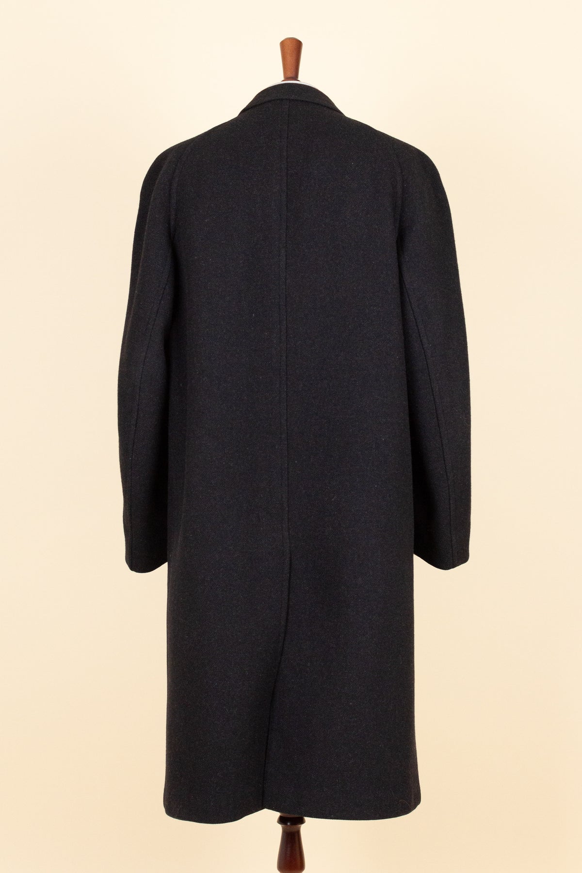 This raglan coat is of Swedish origin, made by Kabom, a well-known Swedish ready-to-wear brand. It was most likely produced sometime during the 1940s, or possibly slightly earlier. The coat is crafted from a heavy dark grey wool fabric with a subtle twill texture.