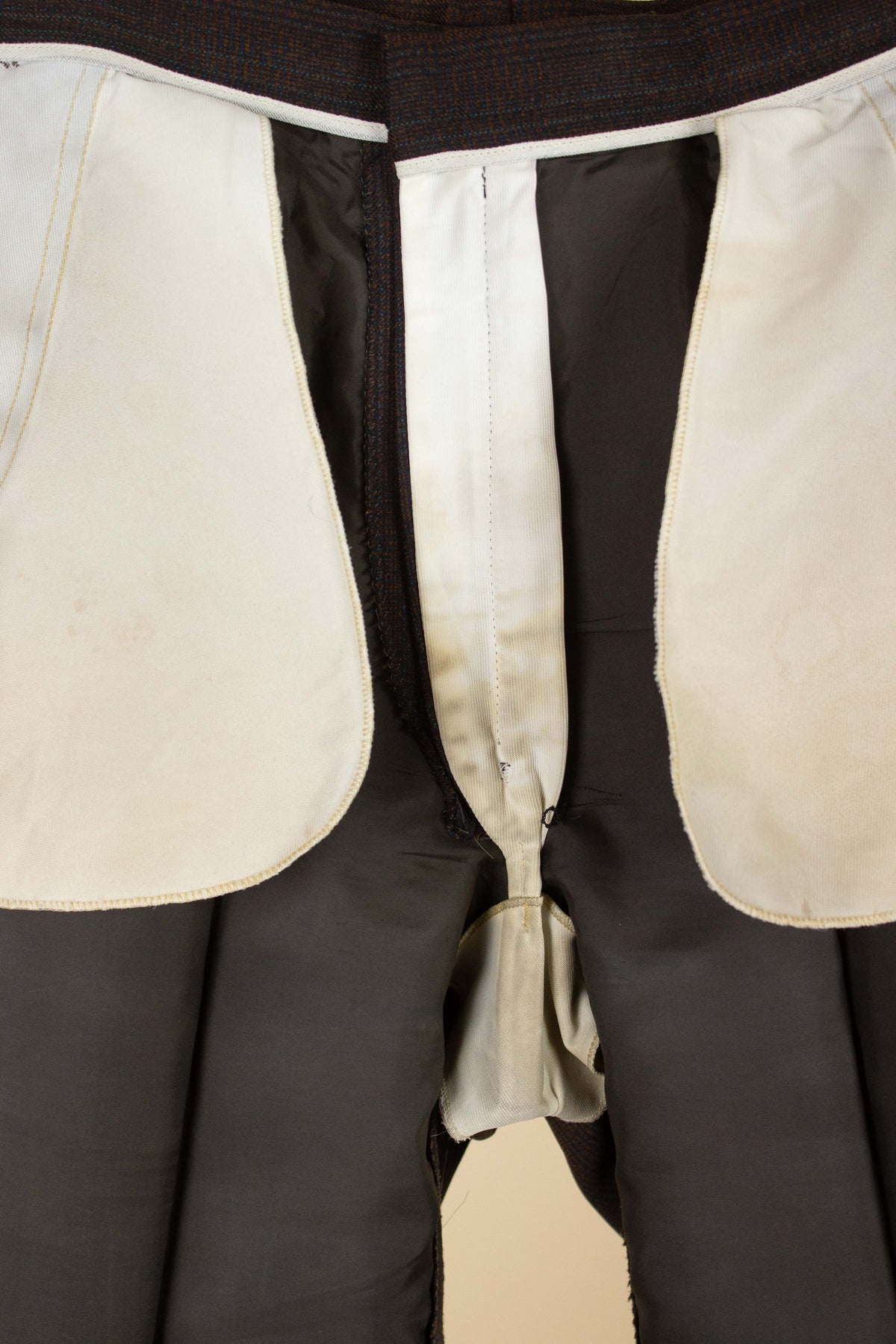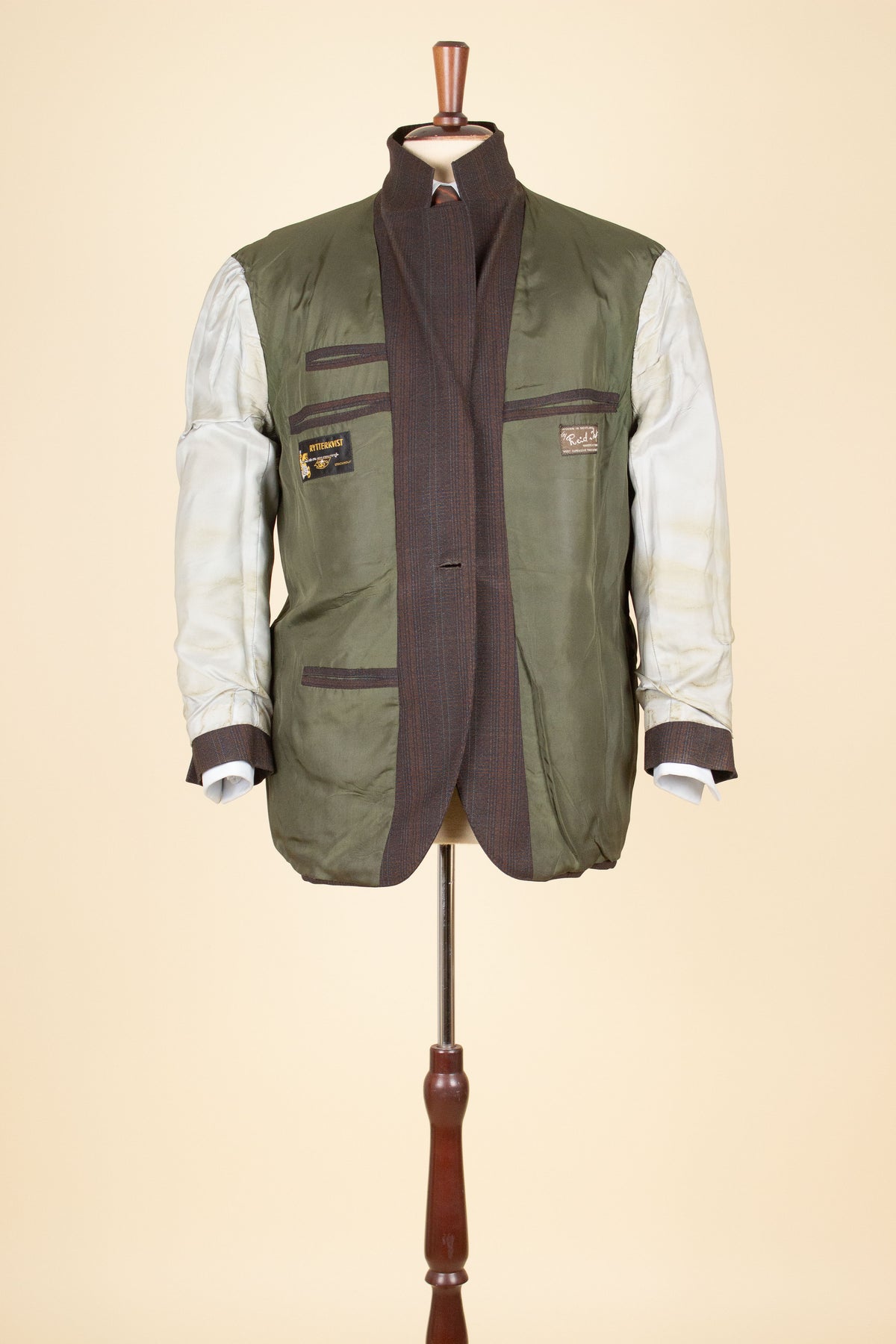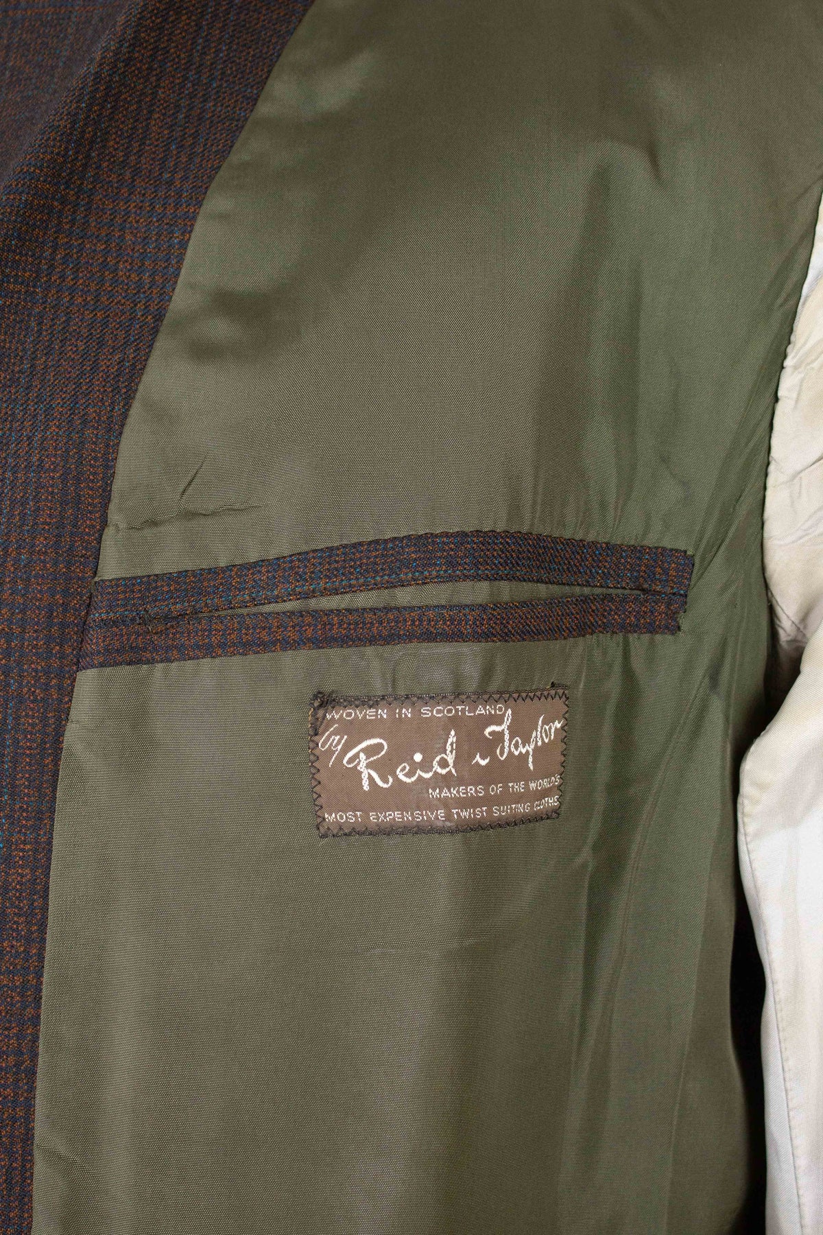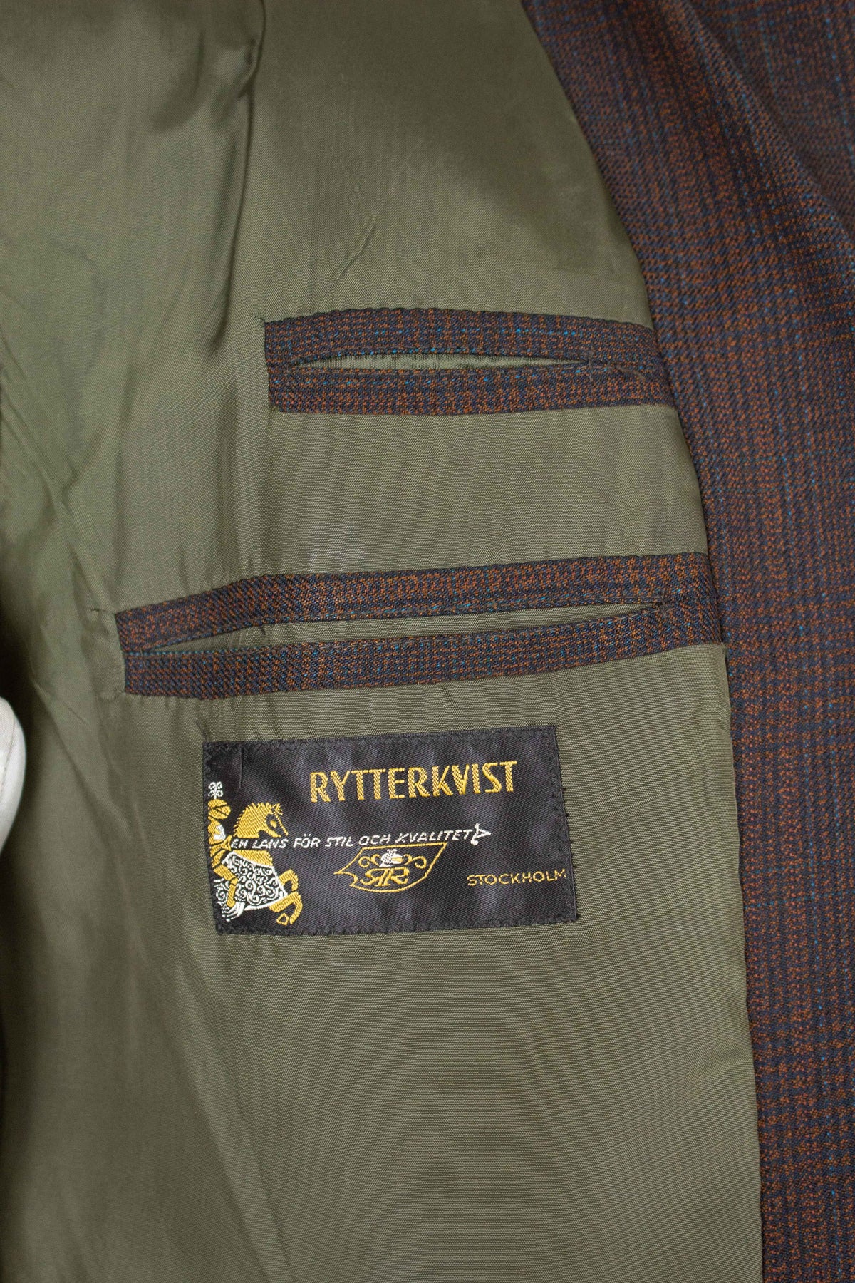 This suit dates back to the 1950s and is of Swedish origin, produced by Rytterqvist. The cloth is British, from Reid & Taylor. The jacket has a three button single breasted closure, horizontal pockets with flaps and one breast pocket. It has a plain back with no vent. It is fully lined and has four inner pockets, one large on each side plus two smaller one on the left side. The trousers are single pleated and has diagonal front pockets. They have zipper fly with hook closure in top. The suit is perfectly wearable, but the condition is far from perfect. There are discolorations in the lining, especially in the pockets. There is also a repair to the trousers on the backside, not very noticeable from the outside though. Please have a look at the images and evaluate the condition.