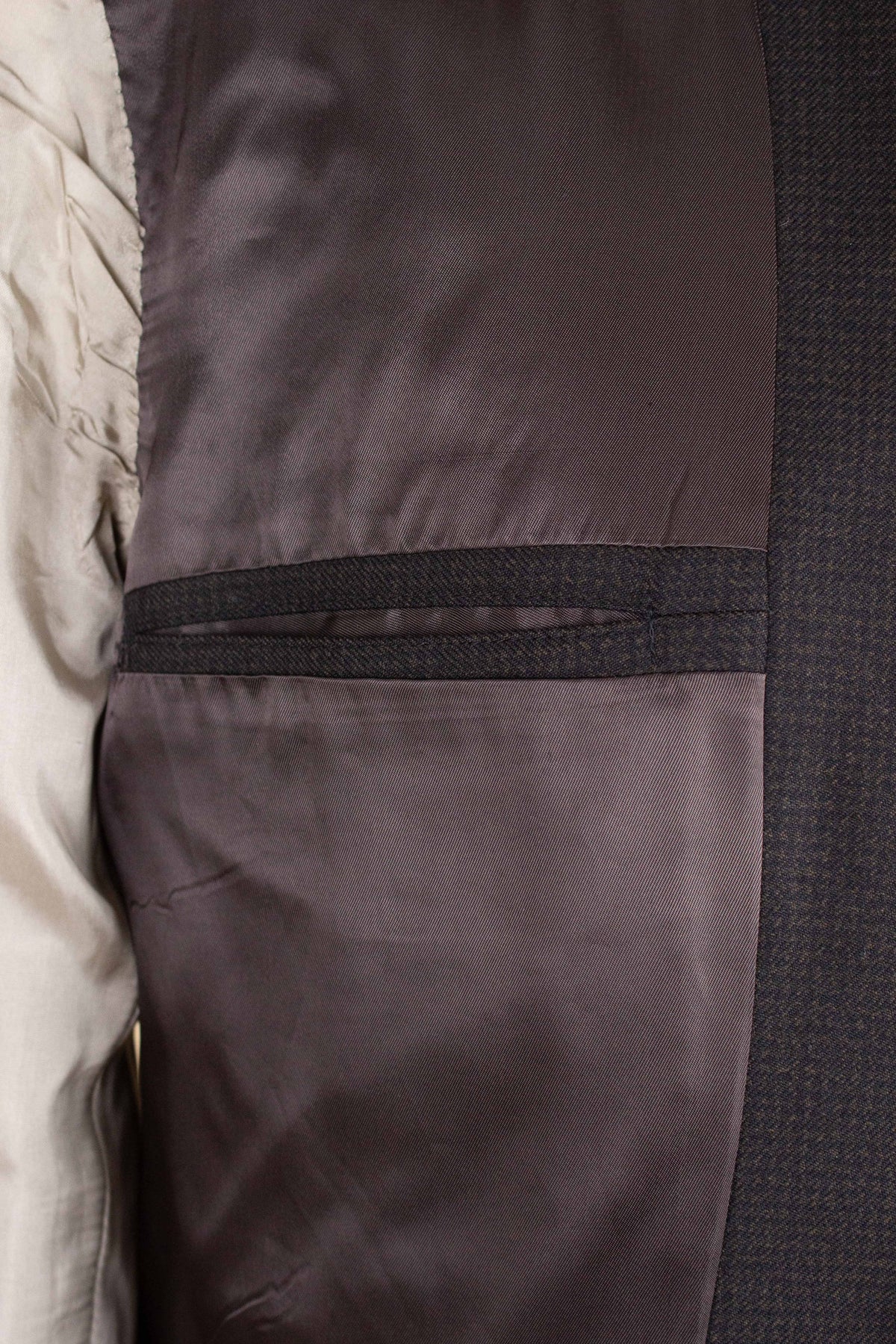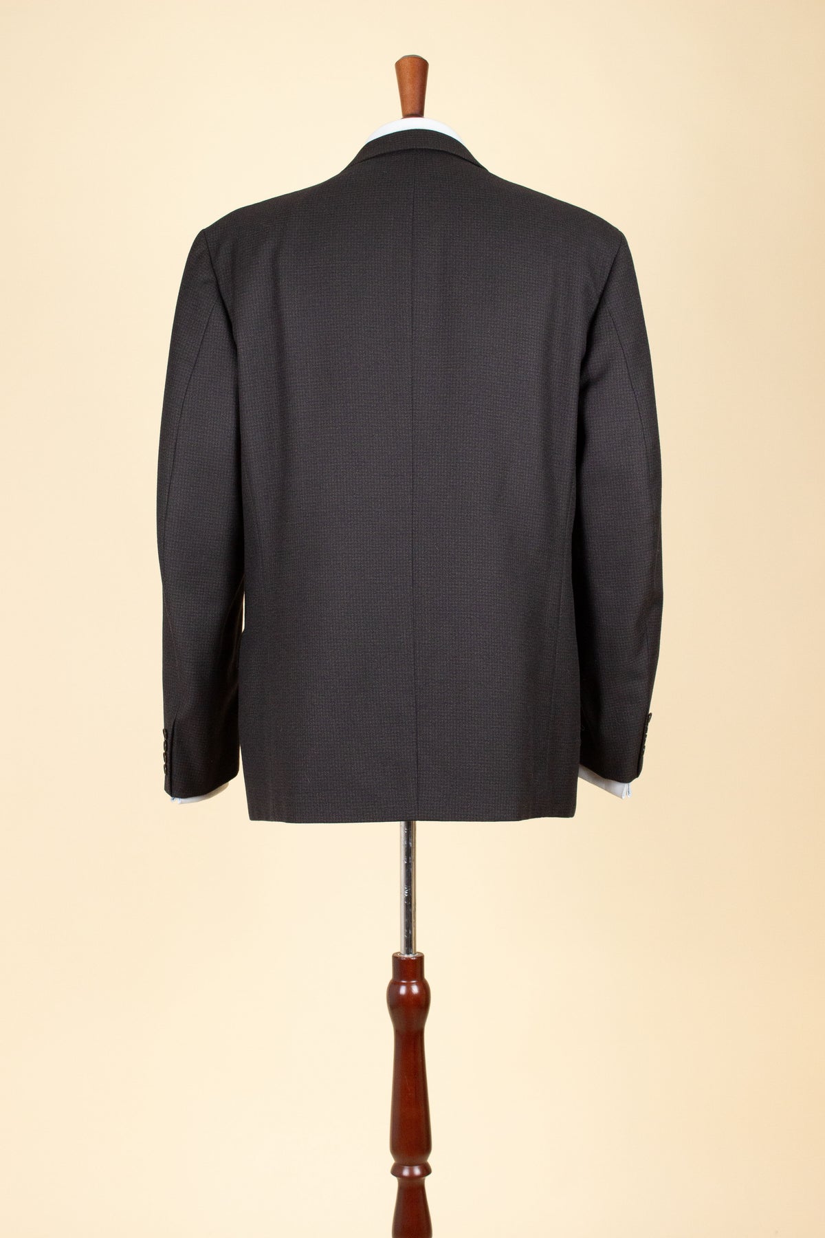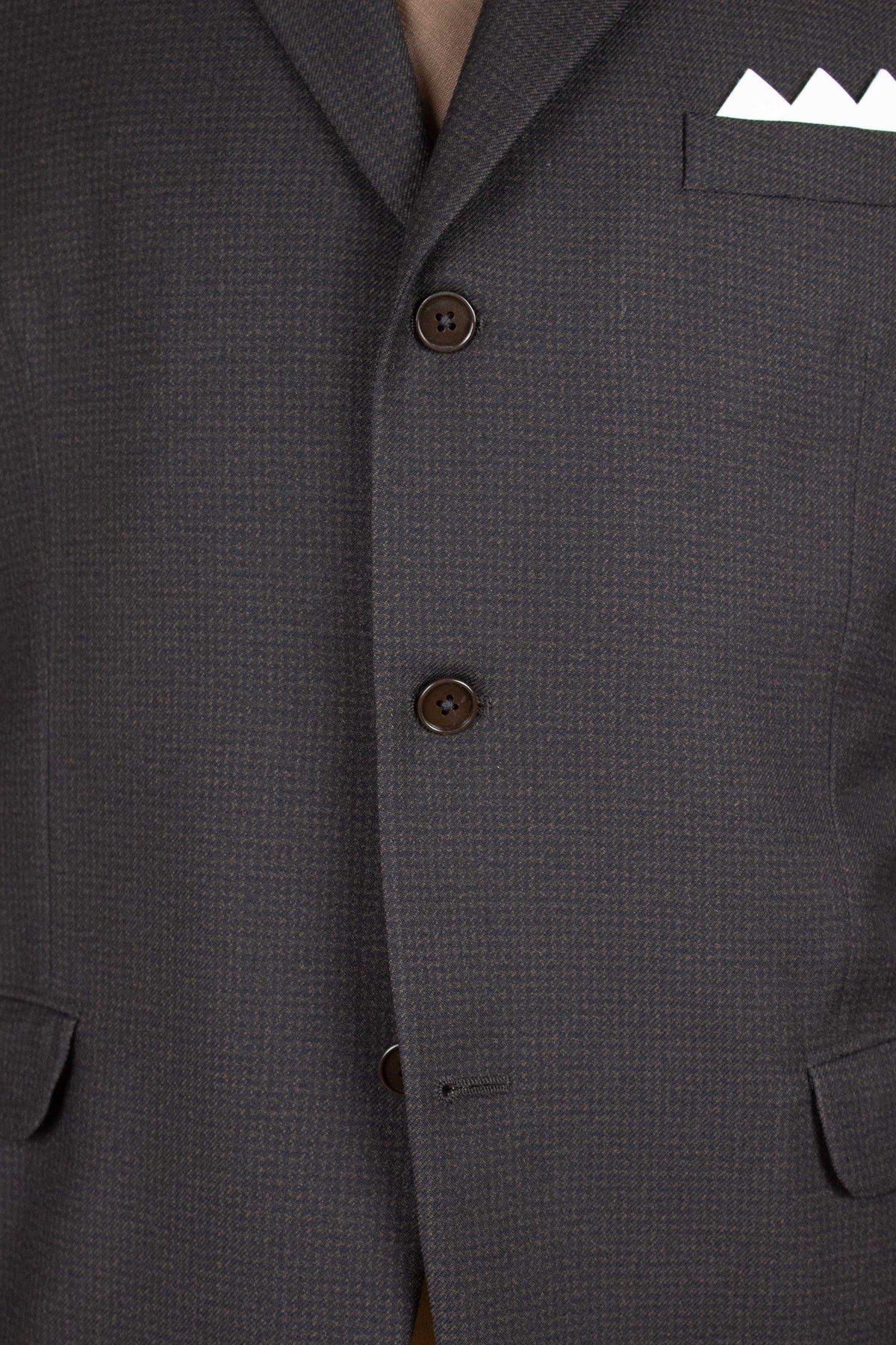 The suit is tailored in a dark grey fabric featuring a subtle brown houndstooth pattern. While the pattern isn’t overly bold, it’s still clearly visible even from a distance, giving the suit a distinct texture and appearance that sets it apart from a solid-colour fabric.