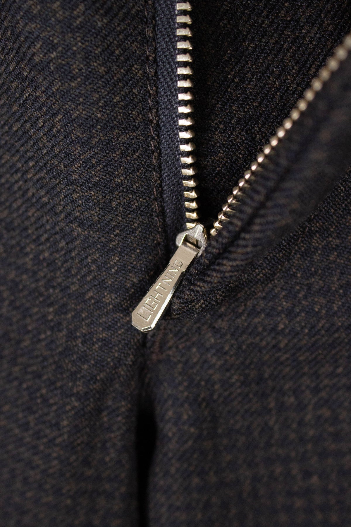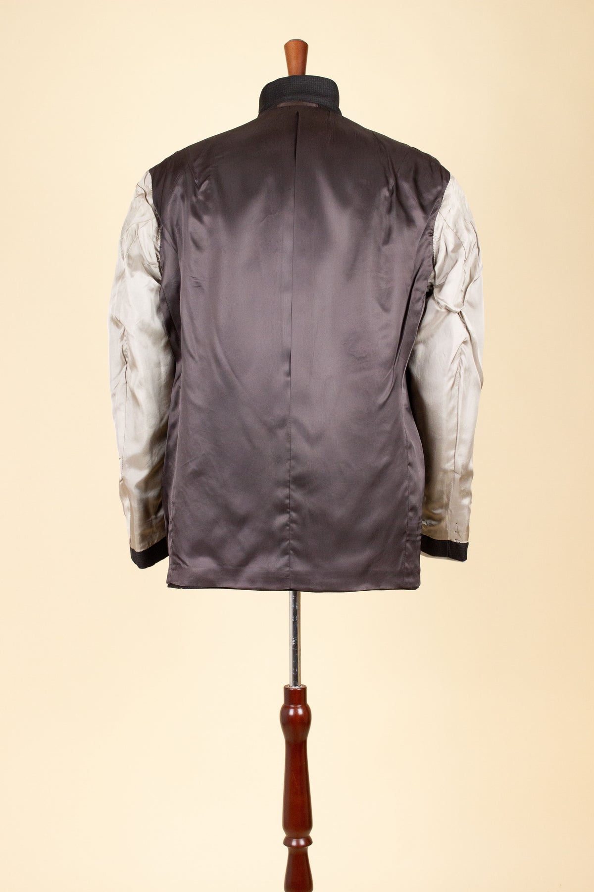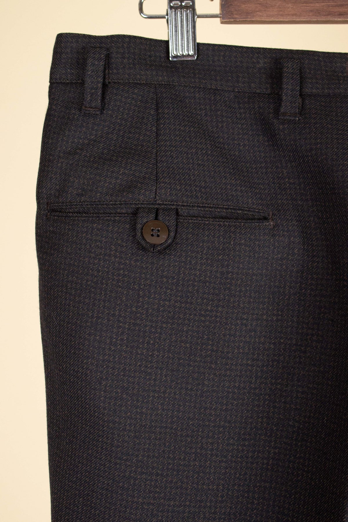 The suit is tailored in a dark grey fabric featuring a subtle brown houndstooth pattern. While the pattern isn’t overly bold, it’s still clearly visible even from a distance, giving the suit a distinct texture and appearance that sets it apart from a solid-colour fabric.