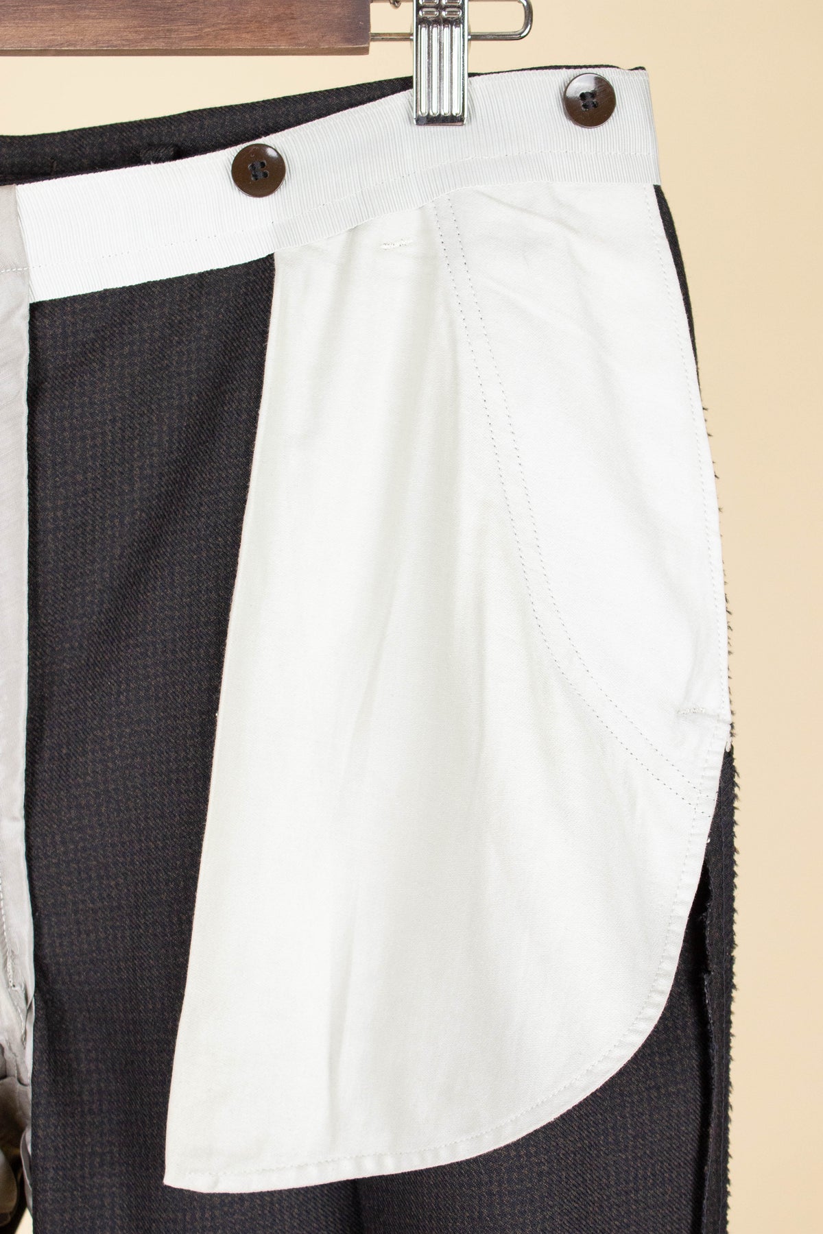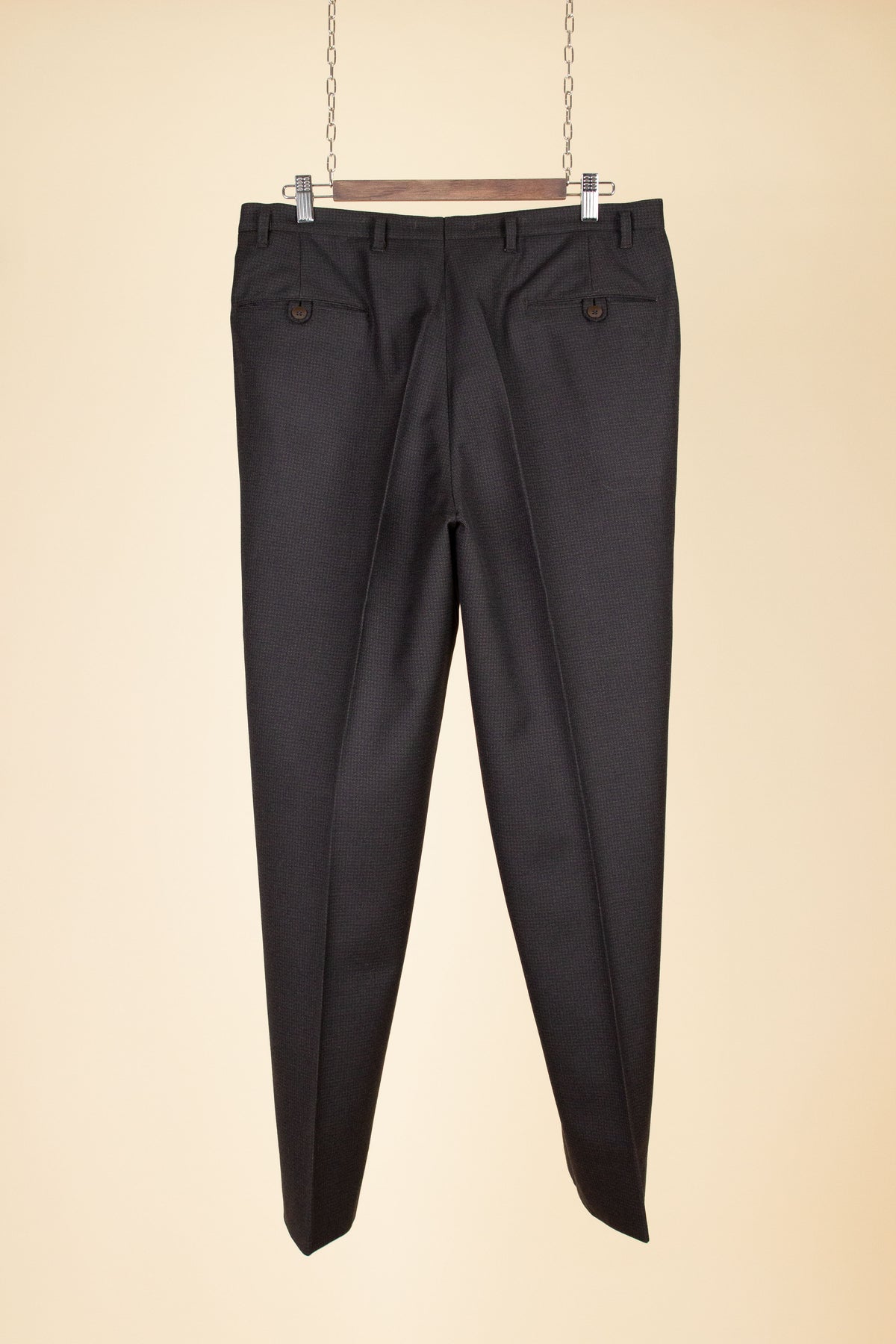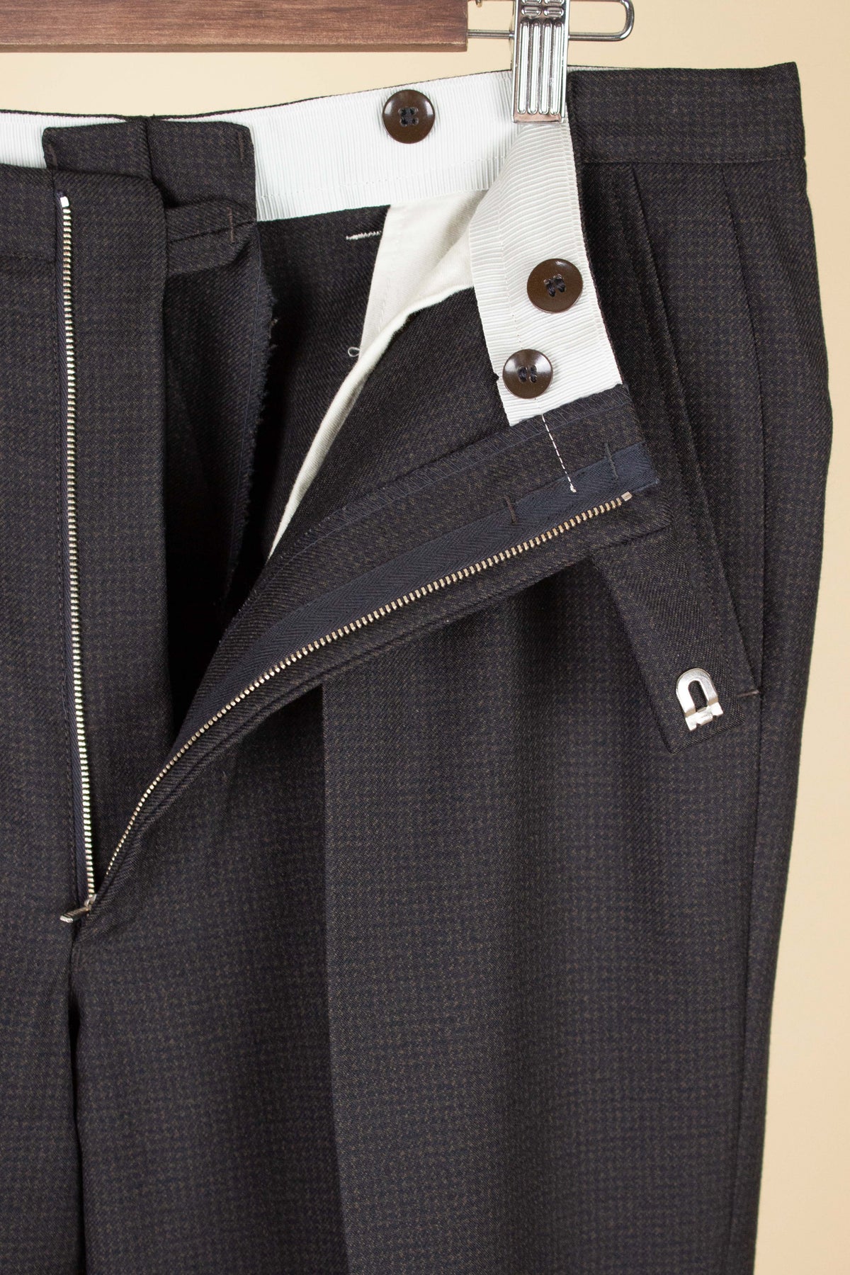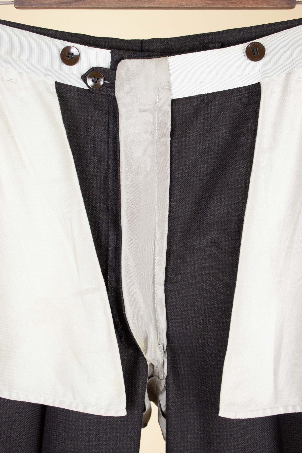 The trousers have a single pleat, belt loops, and slightly slanted front pockets. The fly is zippered, and there are buttons on the inner waistband for suspenders. At the back, there is one pocket on each side, both with button closures. The condition is excellent, with no visible damage or obvious signs of wear. Please refer to the photos to form your own impression of the condition.