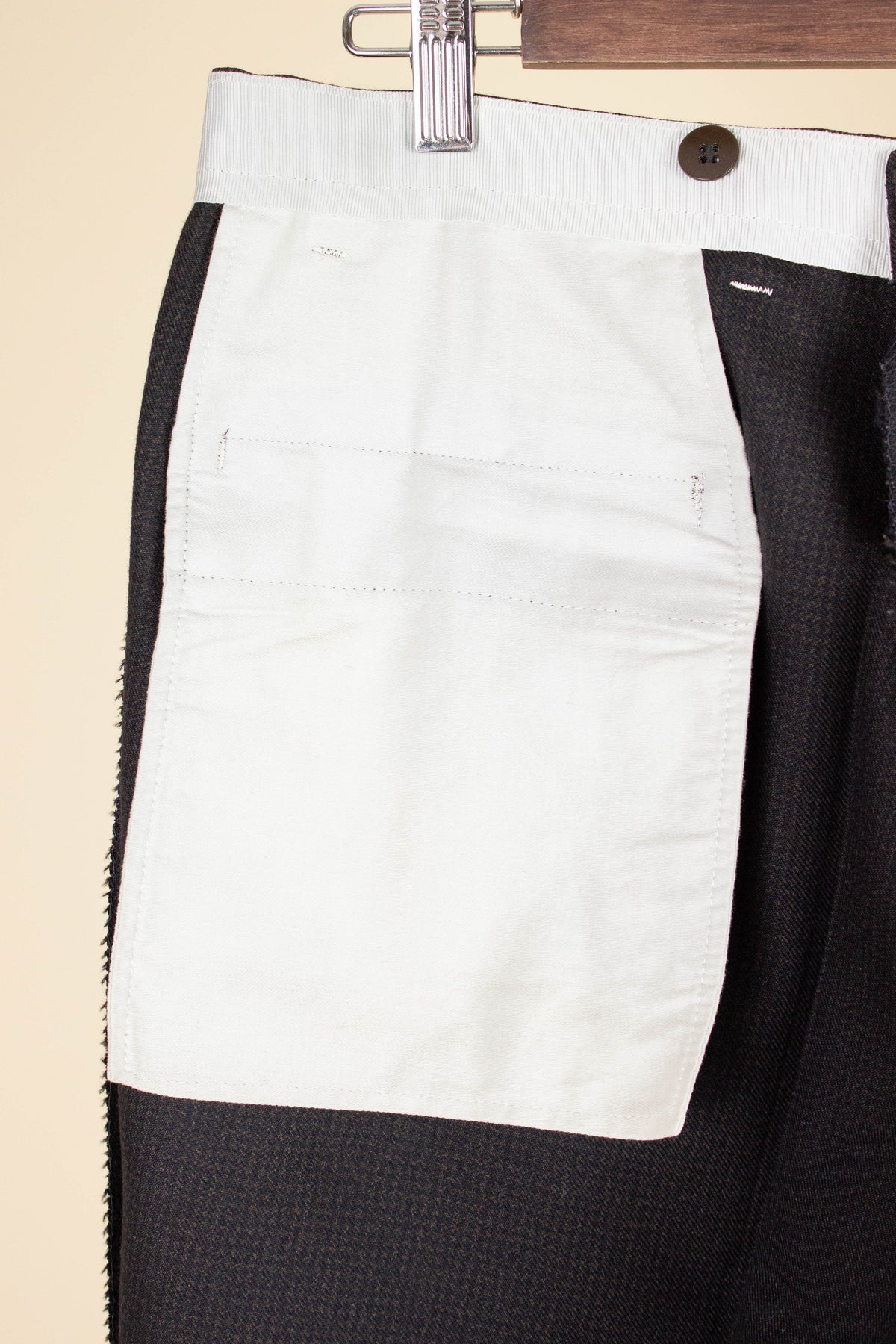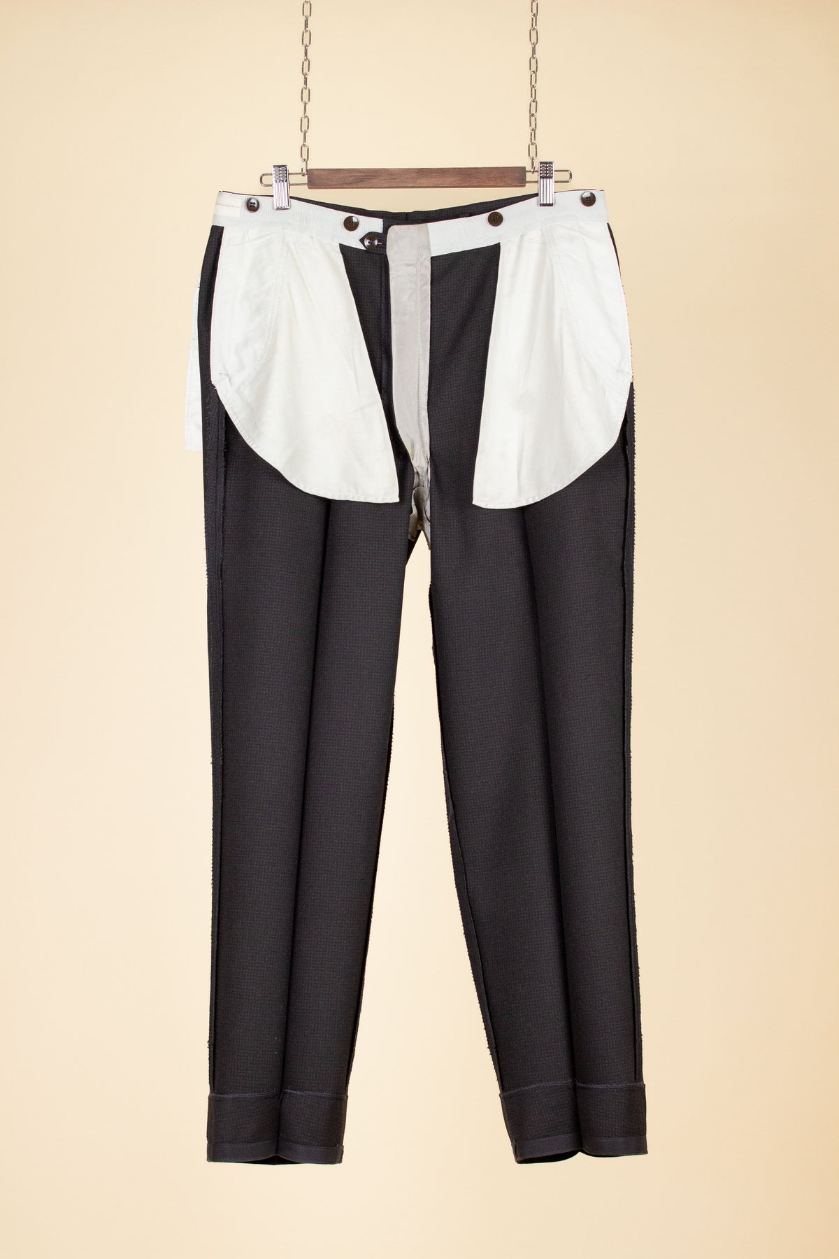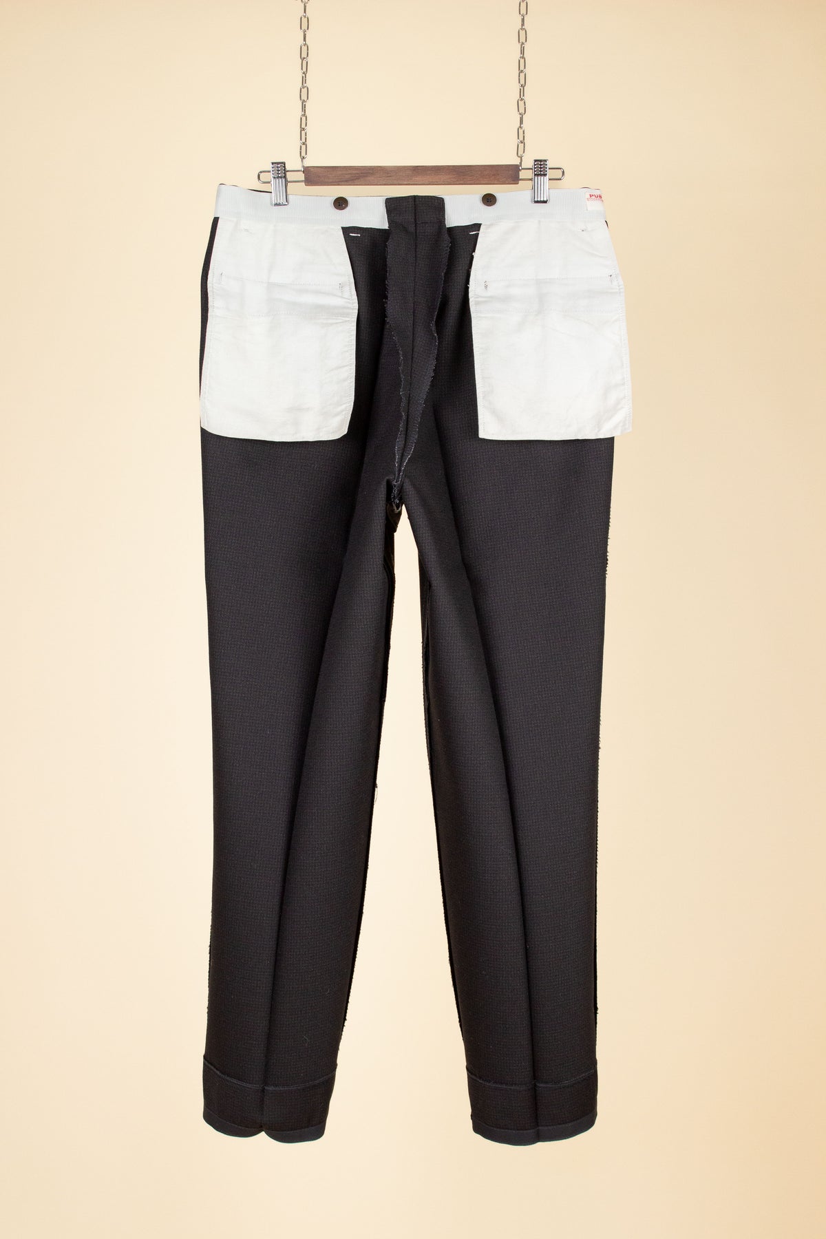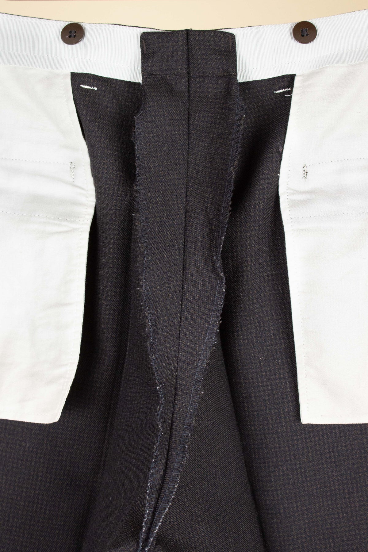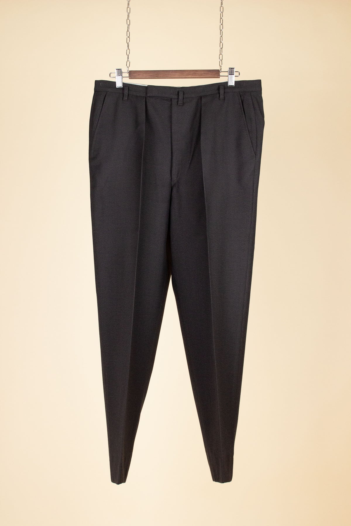 The trousers have a single pleat, belt loops, and slightly slanted front pockets. The fly is zippered, and there are buttons on the inner waistband for suspenders. At the back, there is one pocket on each side, both with button closures. The condition is excellent, with no visible damage or obvious signs of wear. Please refer to the photos to form your own impression of the condition.