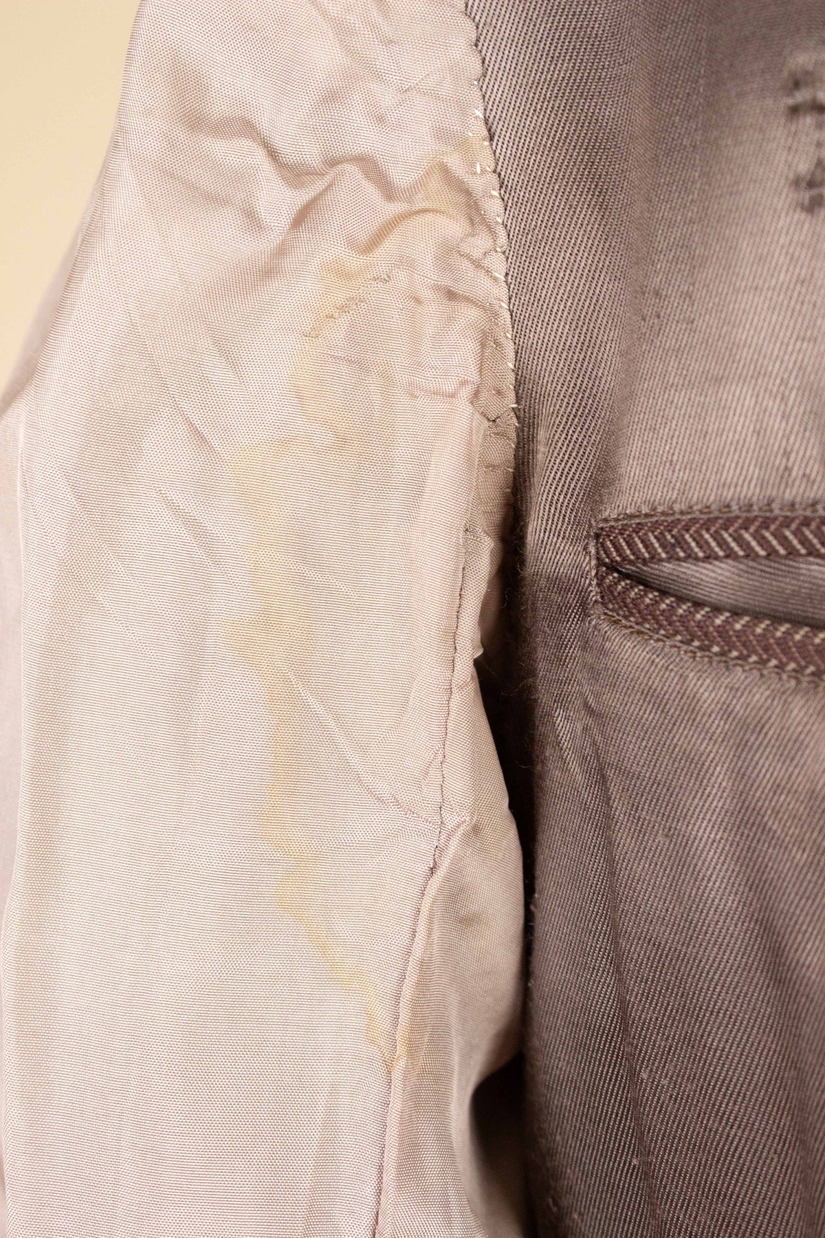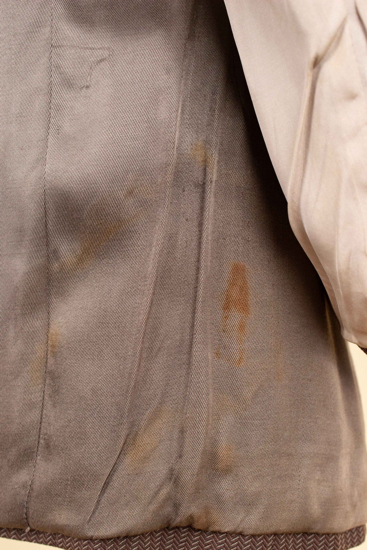 The most notable wear is found under the arms, where the fabric has developed a kind of felting – an uncommon but visible form of wear. Due to the placement, however, it only becomes visible when the arms are raised straight up. There is also some typical wear, such as light fraying around one of the buttonholes, and a fair amount of staining in the lining, both in the jacket and the trousers.