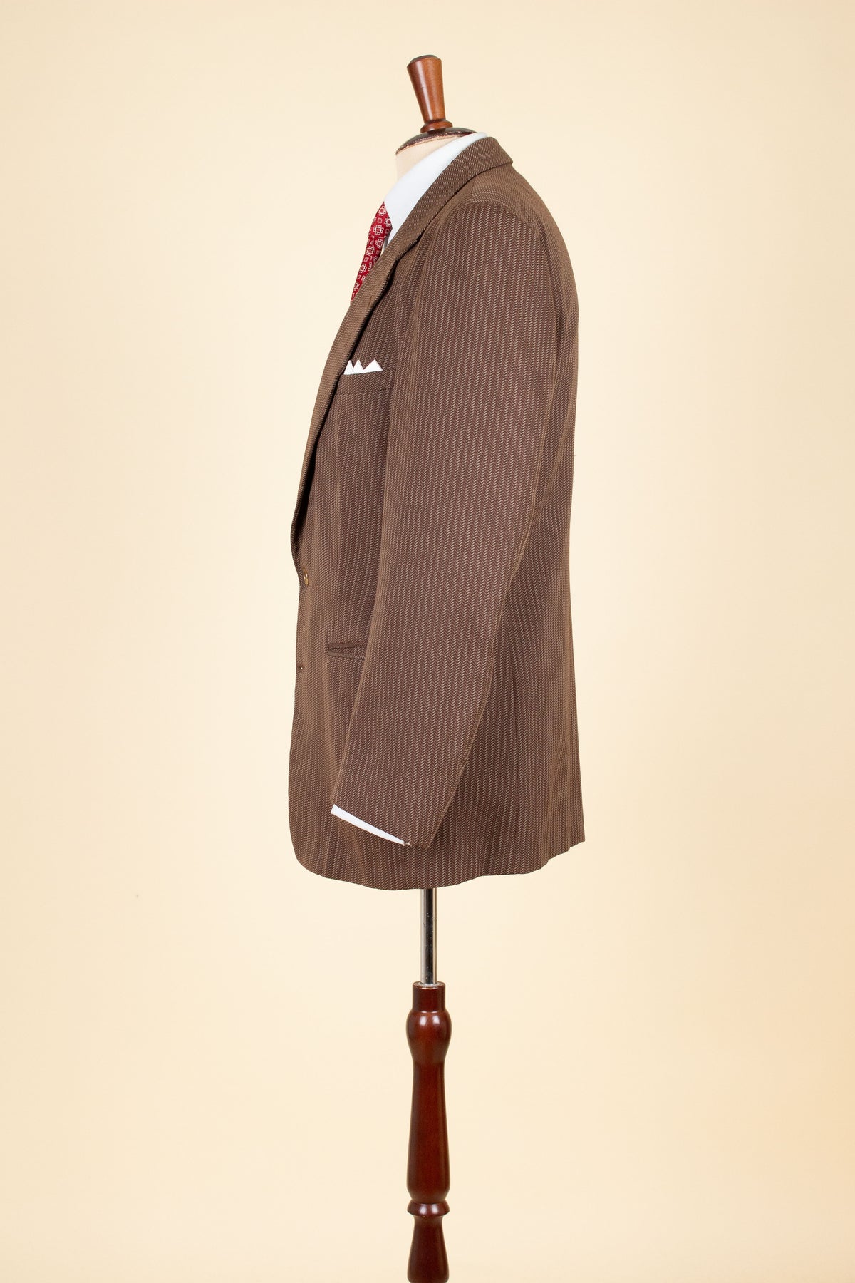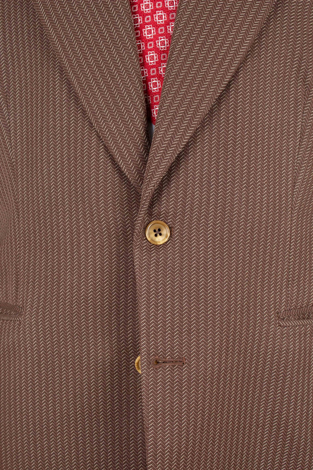 A hallmark of this period is the wide lapels and low button stance. Unlike the more common three-button front of the time, this jacket is two-buttoned. It features horizontal welted front pockets, a chest pocket, and a buttonhole on the left lapel. The back is straight and unvented. The jacket is fully lined, with two inner pockets, one on each side.