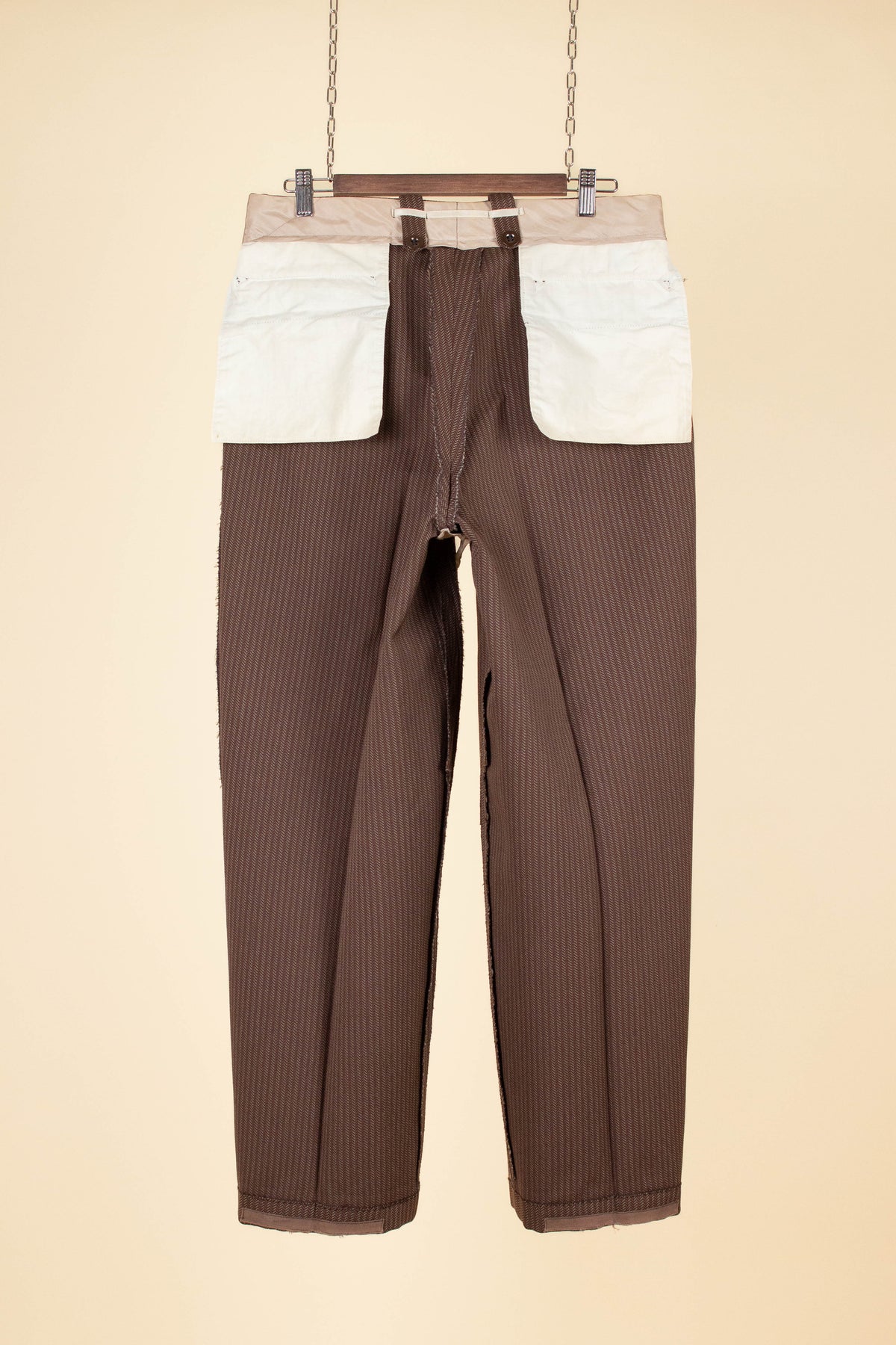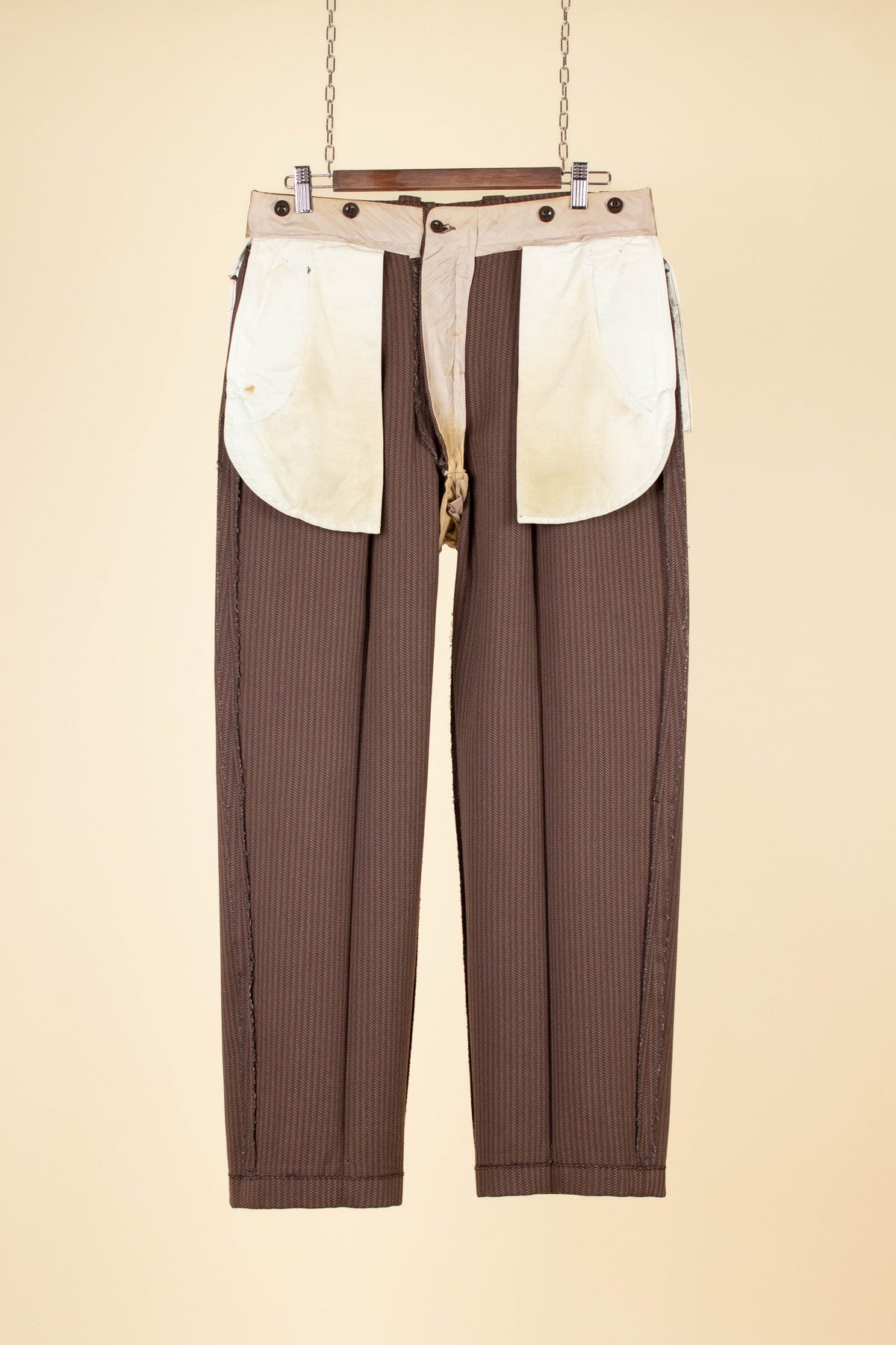 The trousers have double pleats and slightly slanted front pockets, with a small coin pocket inside the right pocket. They are fitted with a button fly, and on the inside of the waistband there are buttons for braces. At the back, there is one pocket on each side, both with flaps and button closures. The trouser legs are finished with turn-ups.