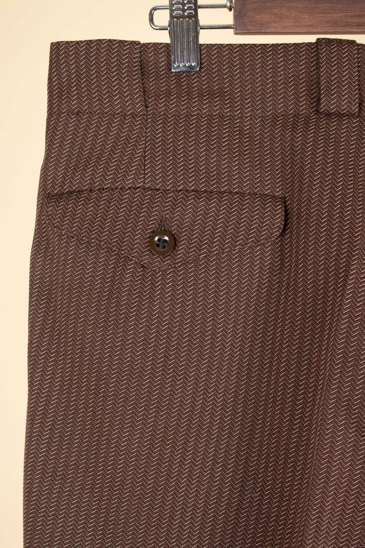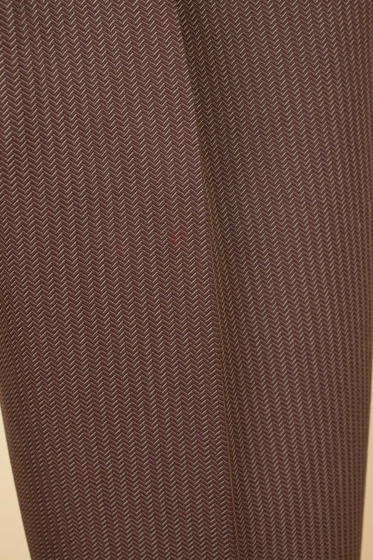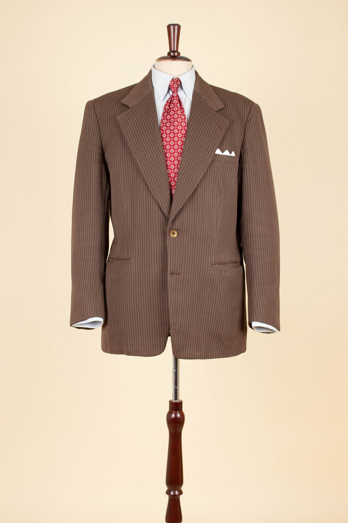 The fabric and cut are very typical of the late 1940s. It is made from a heavily brown-toned wool with a highly distinctive pattern – somewhat reminiscent of a herringbone weave, though from a distance it appears as bold vertical stripes.