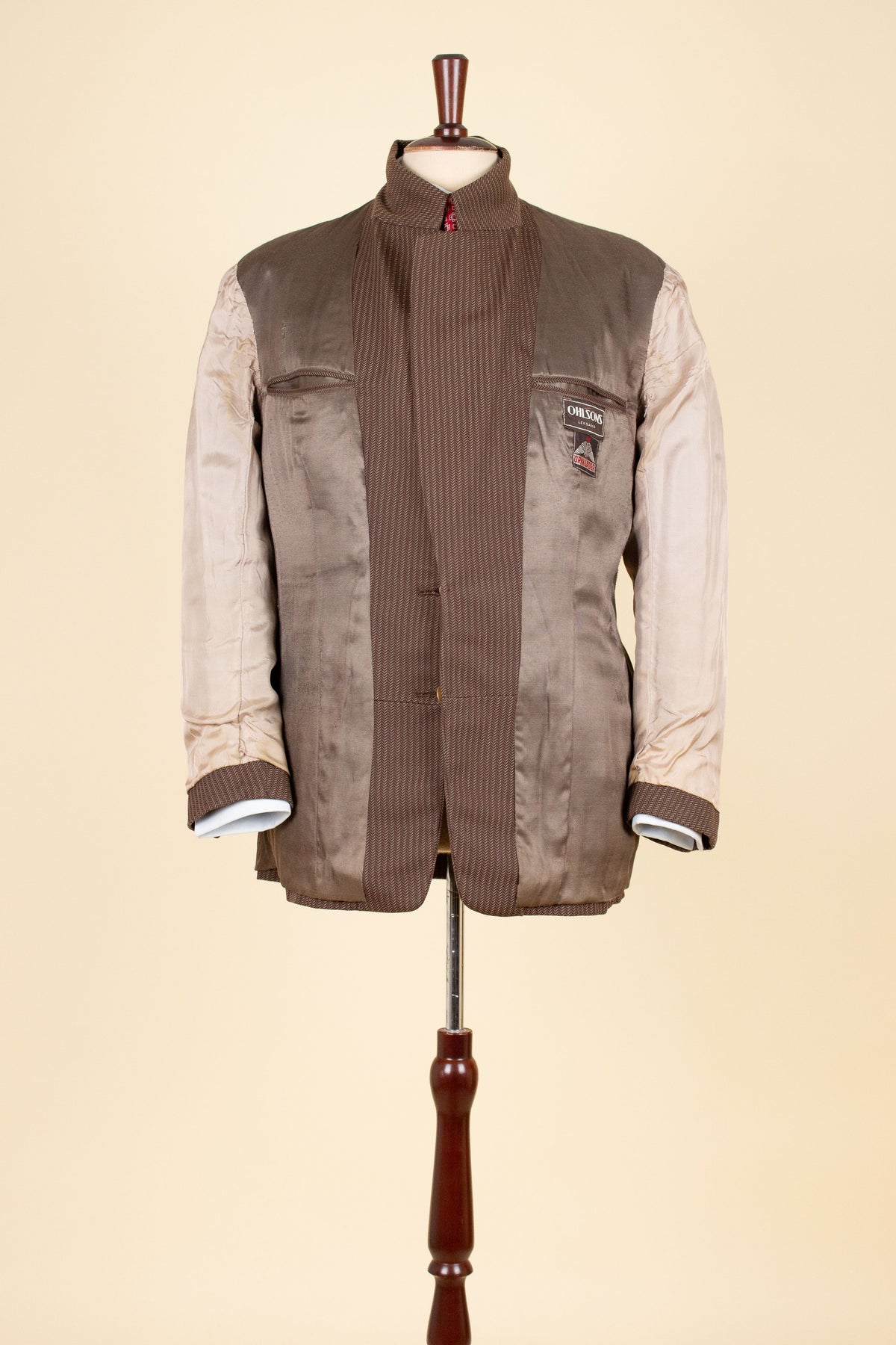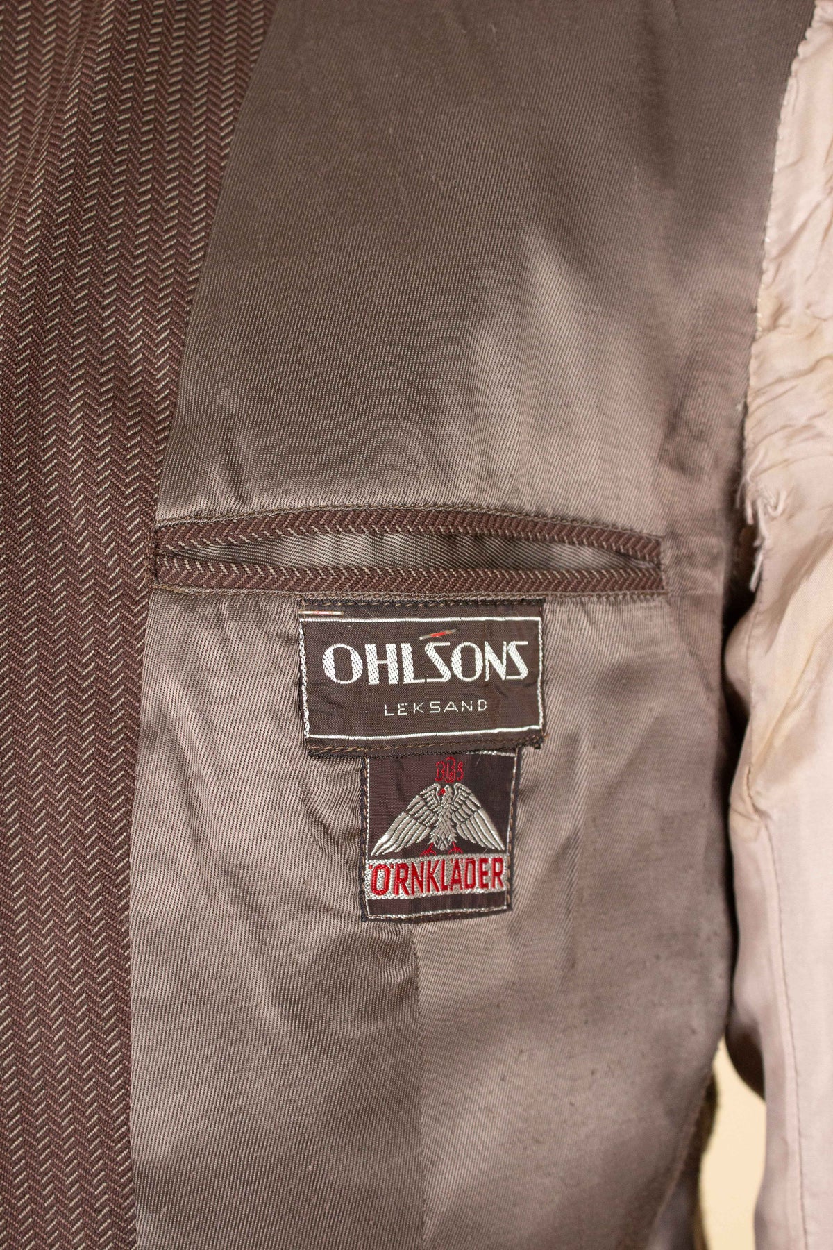 This striking suit is of Swedish origin and was tailored sometime during the 1940s by Örnkläder, a well-known Swedish ready-to-wear manufacturer based in Karlstad, central Sweden. The suit was originally sold at a shop named Ohlsons in Leksand, also located in central Sweden.