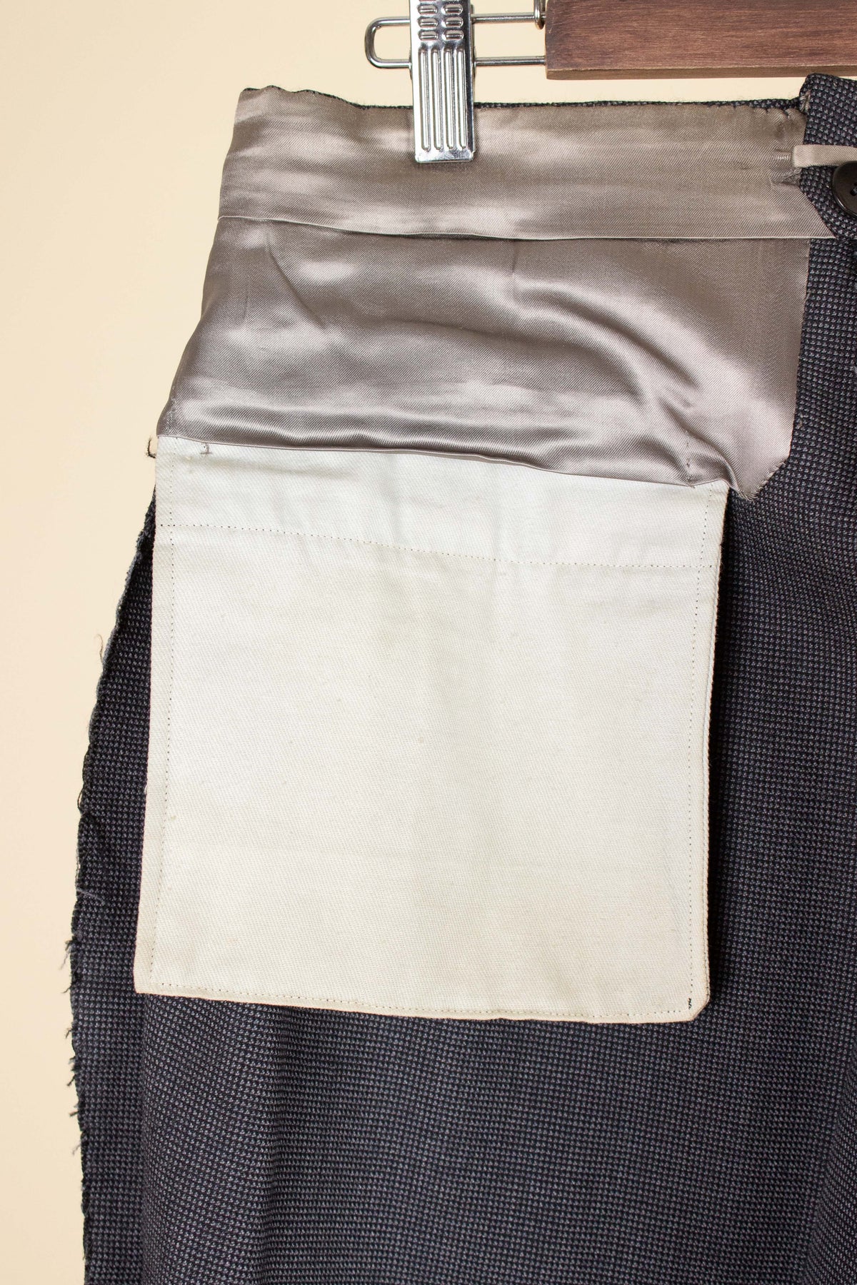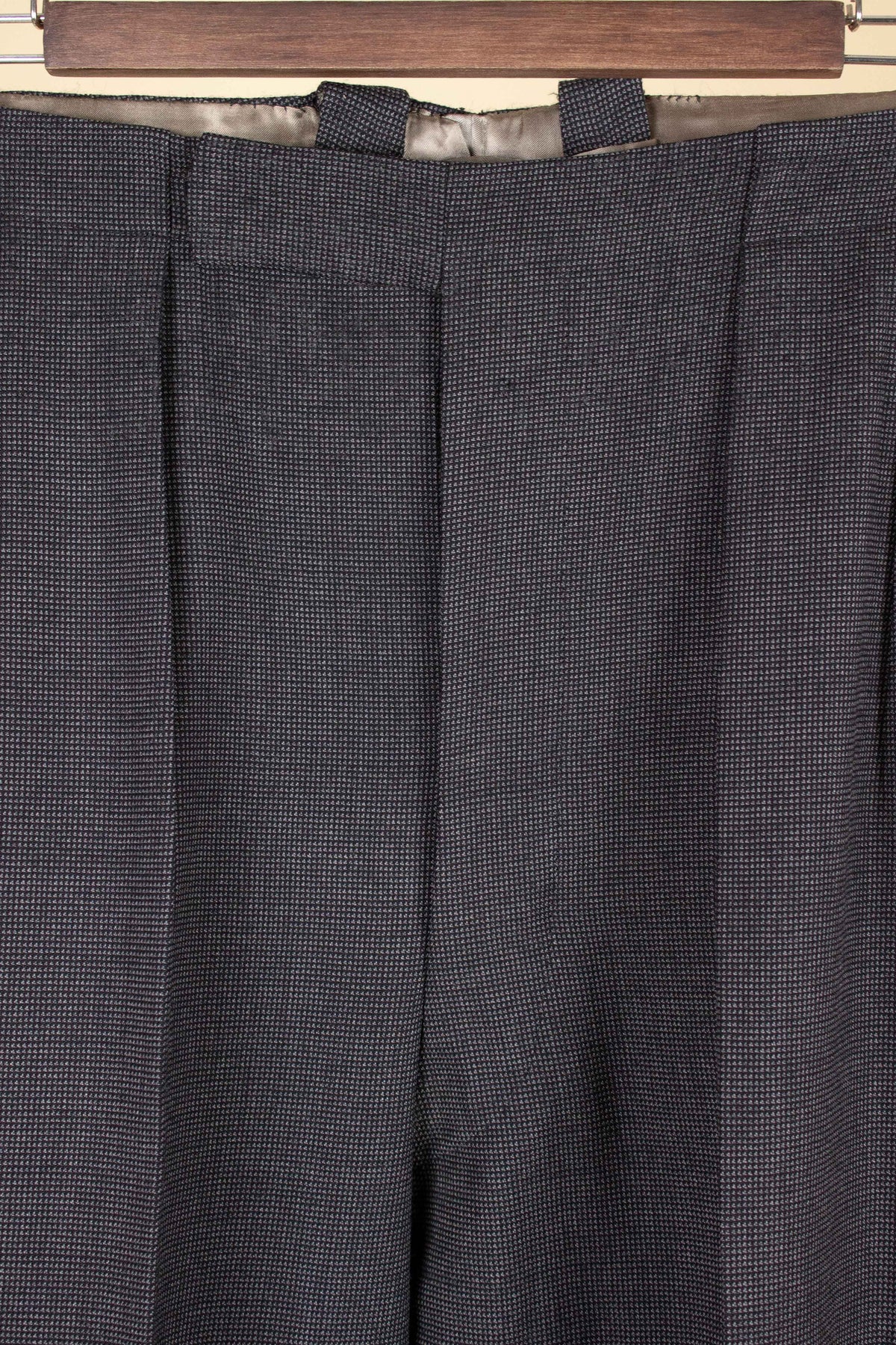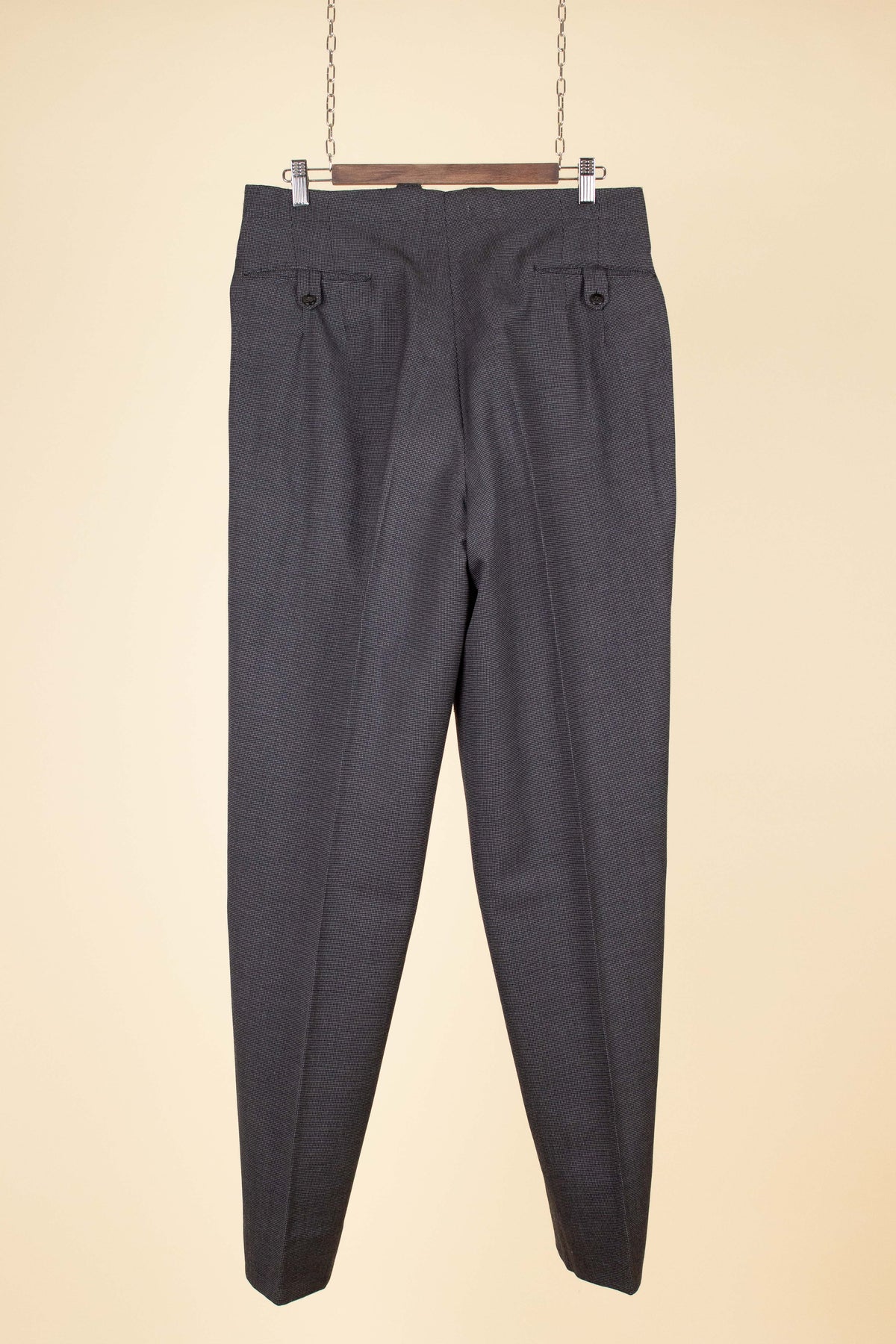 The trousers have double pleats and vertical front pockets. On the inside of the waistband, there are buttons for braces. The fly is buttoned, and at the back there are two pockets, one on each side, both with button closures.