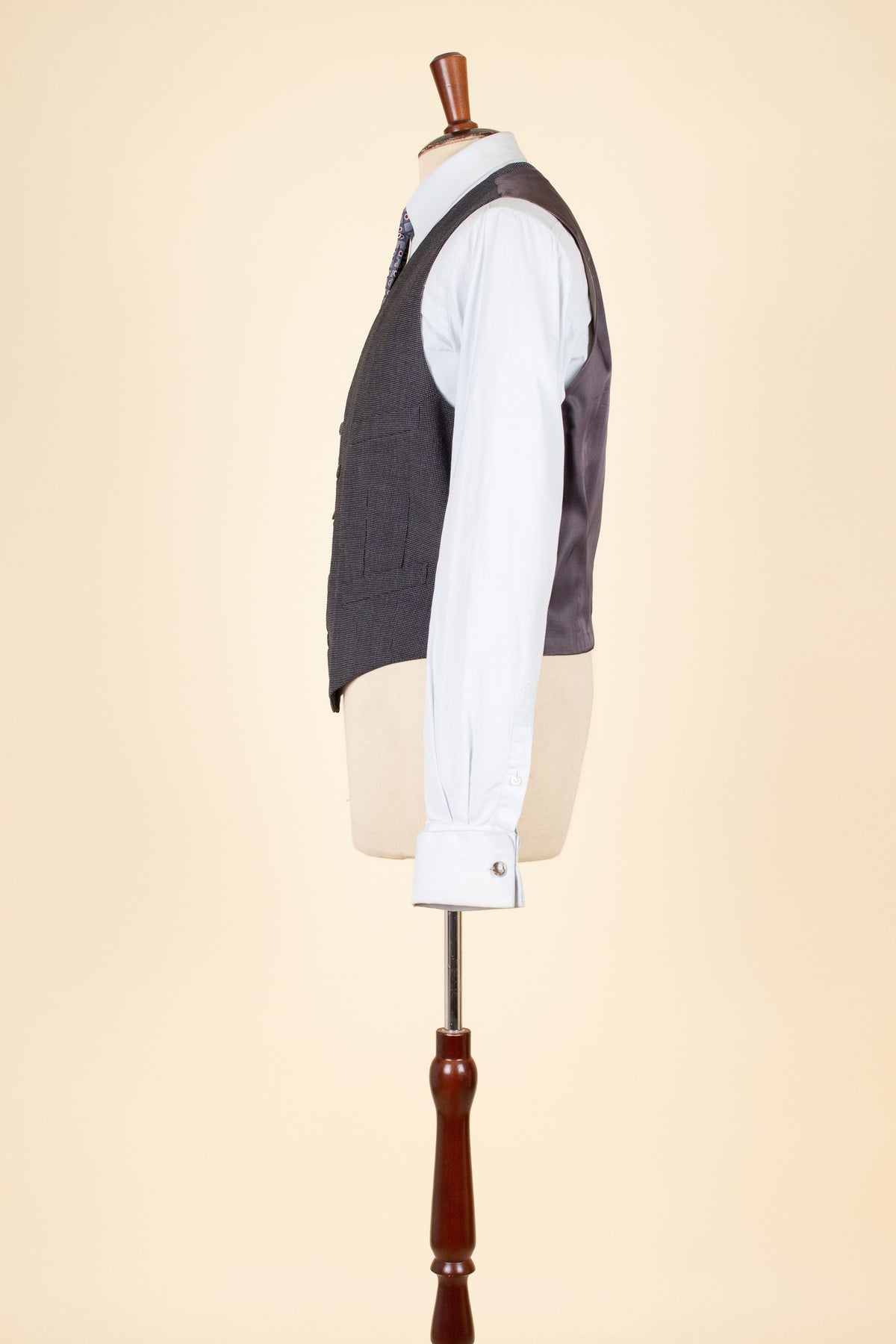 The waistcoat is also single-breasted, fastening with six buttons, and features four front pockets – two at chest height and two lower down. The back is plain, without a cinch or buckle, which is common for bespoke waistcoats, as they are meant to fit perfectly without adjustment.