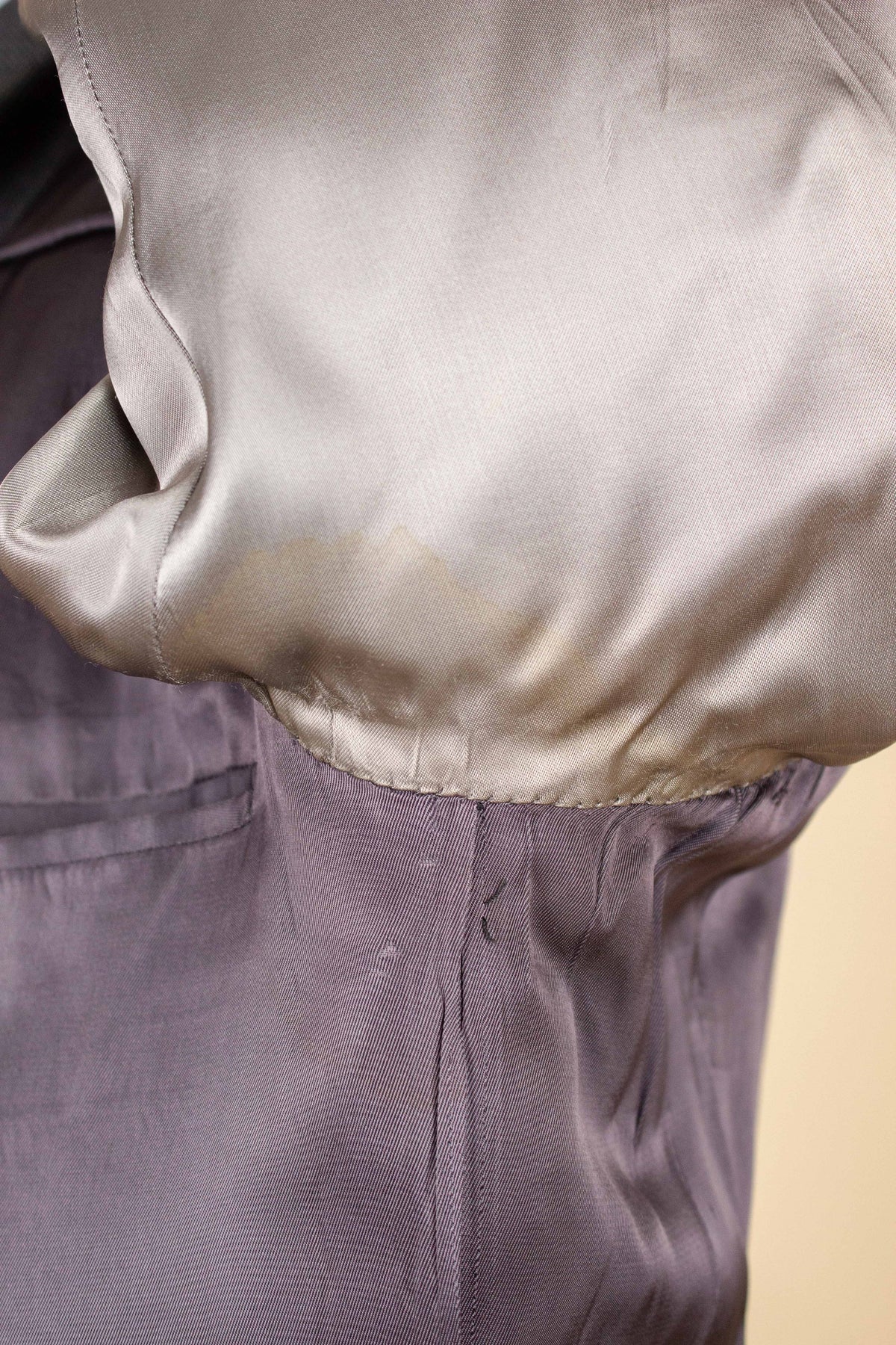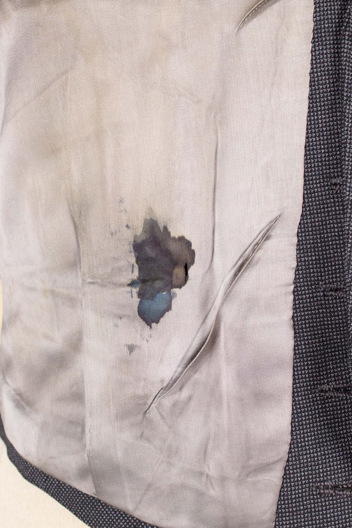 Overall, the condition is good, with no structural damage to the fabric. However, there are some discolourations, primarily around the collar edge, underarms, and trouser lining. There is also a black ink stain in the waistcoat lining – likely the result of a leaking fountain pen. Please study the photos carefully to form your own assessment of the condition.