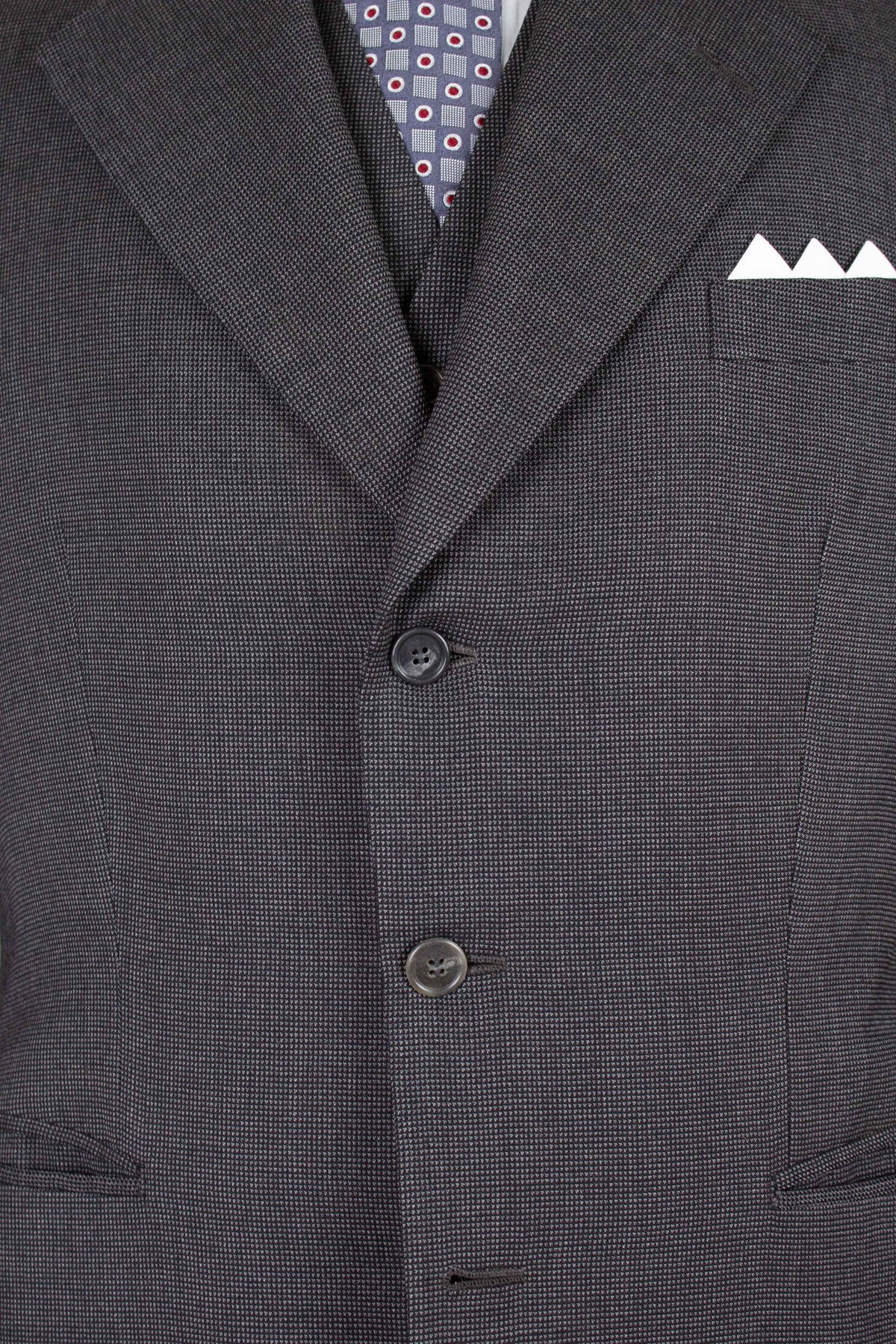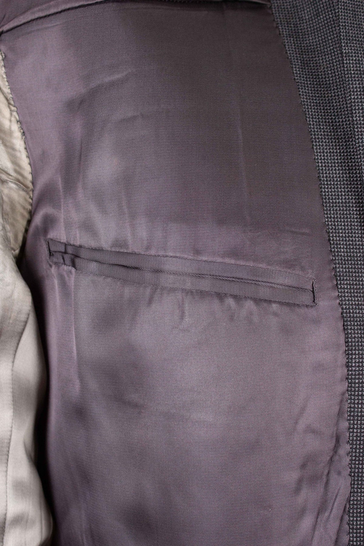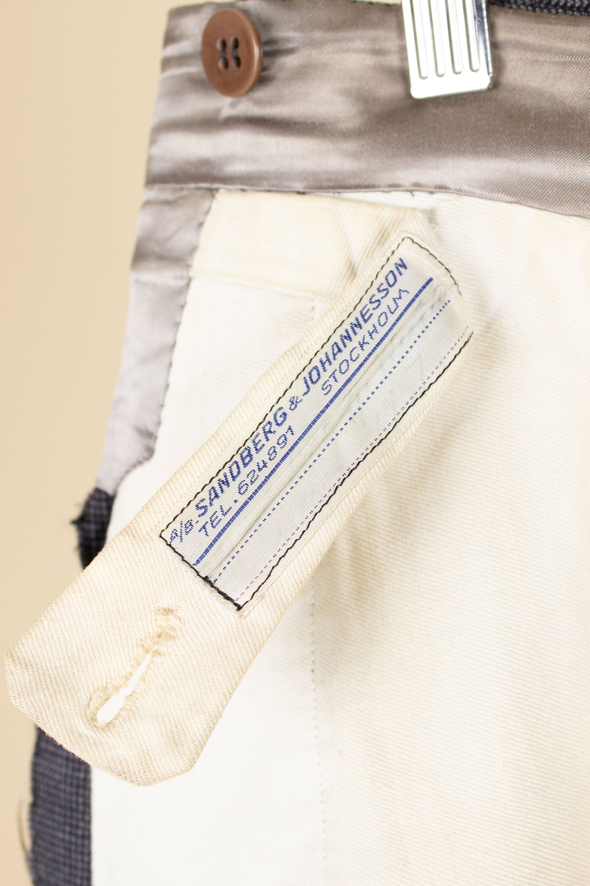 This bespoke three-piece suit is of Swedish origin, tailored at a Stockholm-based tailor shop called Sandberg & Johannesson and dated 1947. It is made from a typically mid-century grey patterned fabric, subtle yet characteristic of the era.