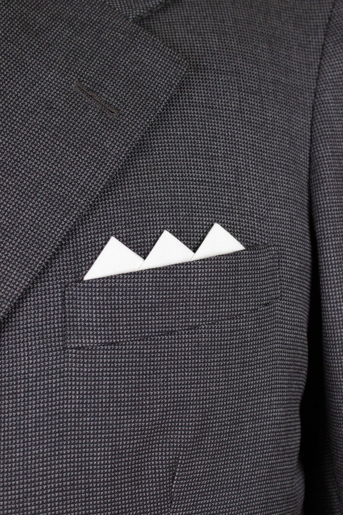 The jacket is single-breasted and fastens with three buttons. It features horizontal welted front pockets, a chest pocket, and a buttonhole on the left lapel. The back is straight and unvented. The jacket is fully lined, with two inner pockets, one on each side.