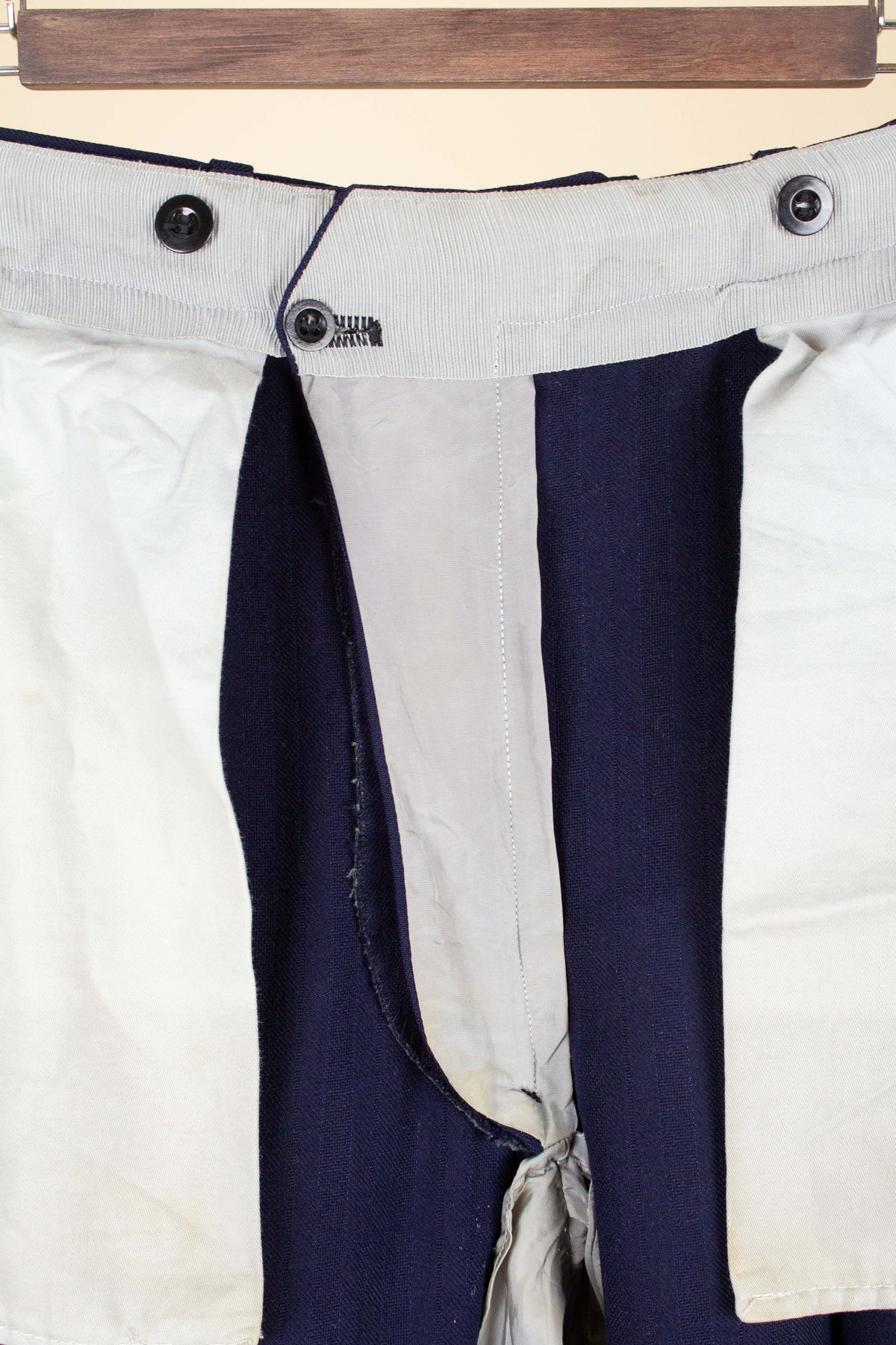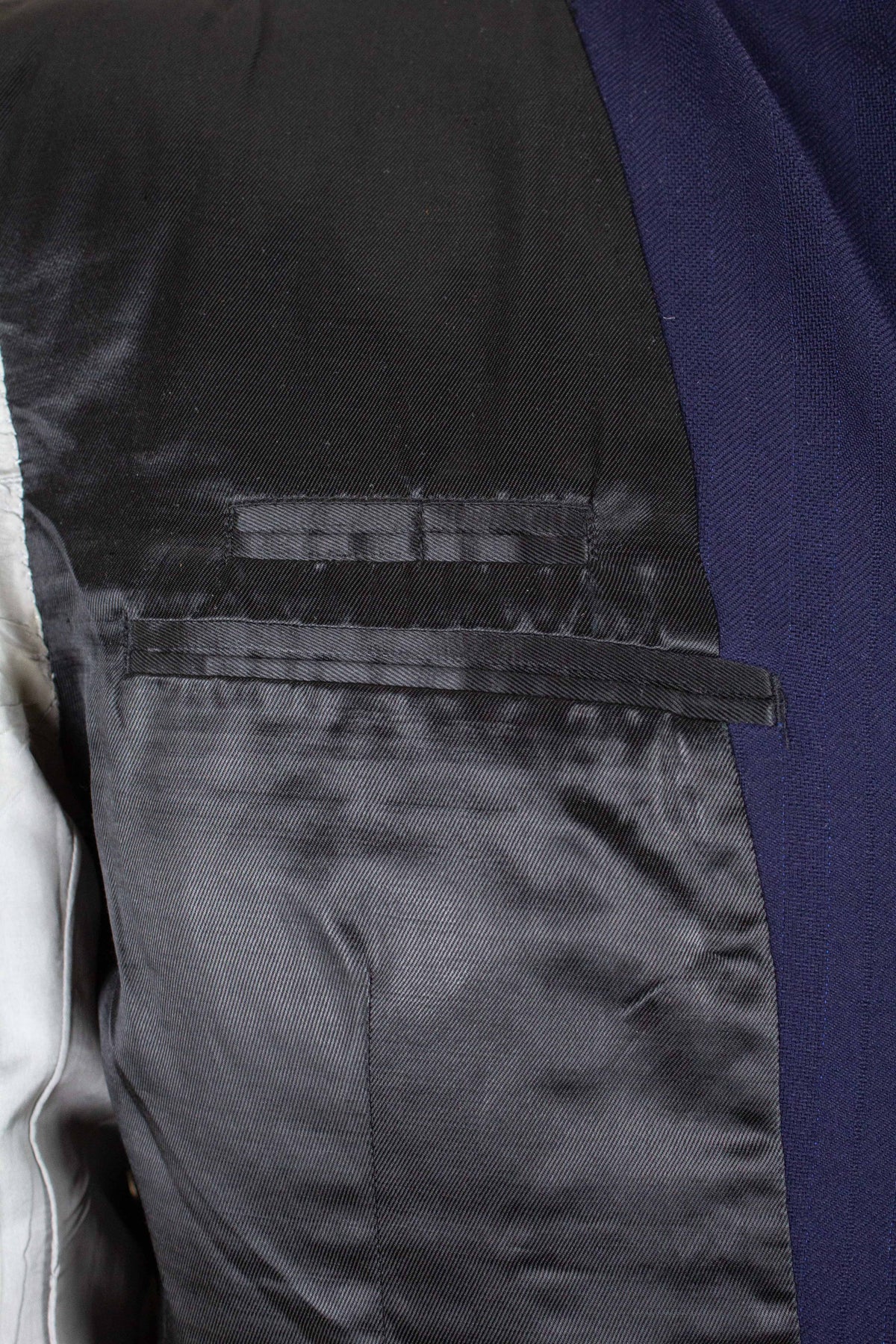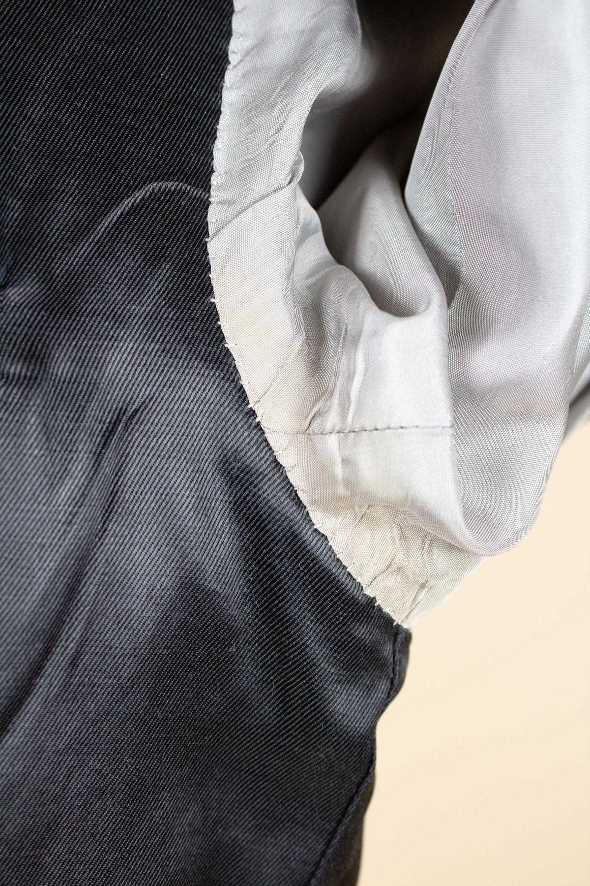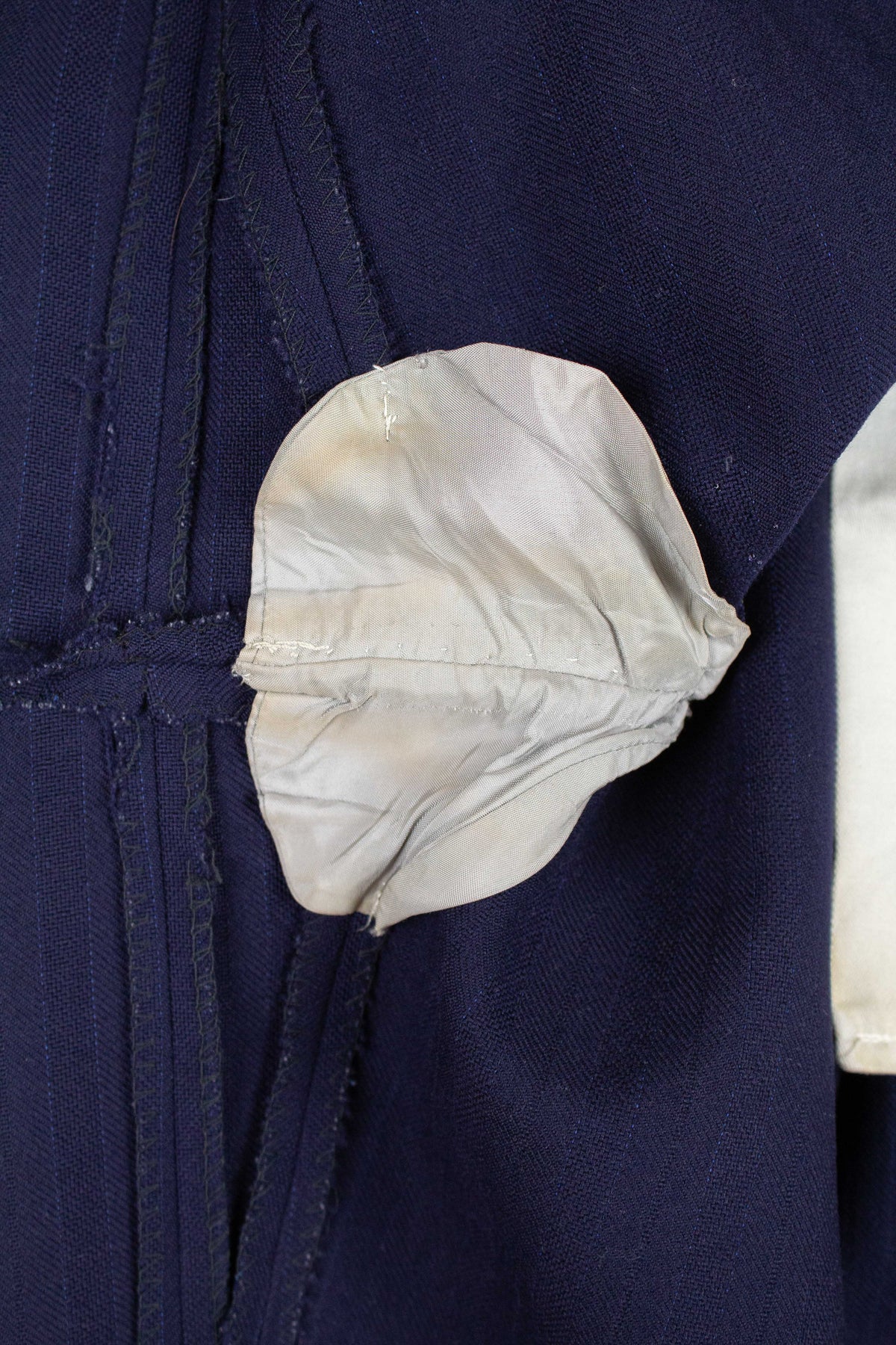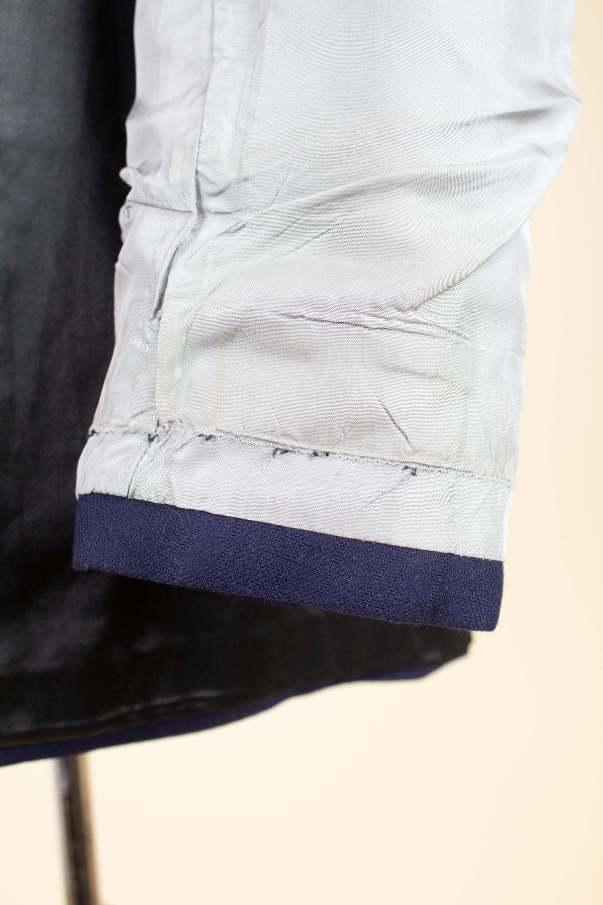 In terms of condition, the overall impression is good, although closer inspection reveals a few points to note. The sleeves have been lengthened at some point, which can be detected at the cuffs. There are also some discolourations in the lining, both in the jacket and the trousers. In addition, there is a small area of pilling on the jacket fabric along the front edge. Please review the images and form your own assessment of the condition.