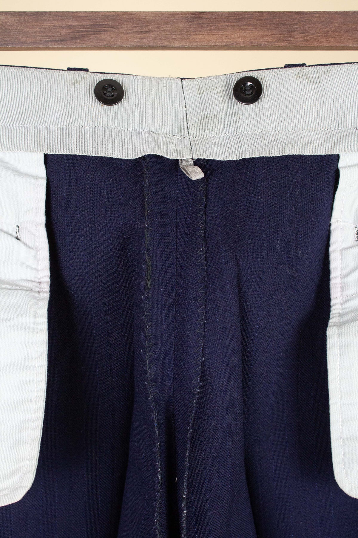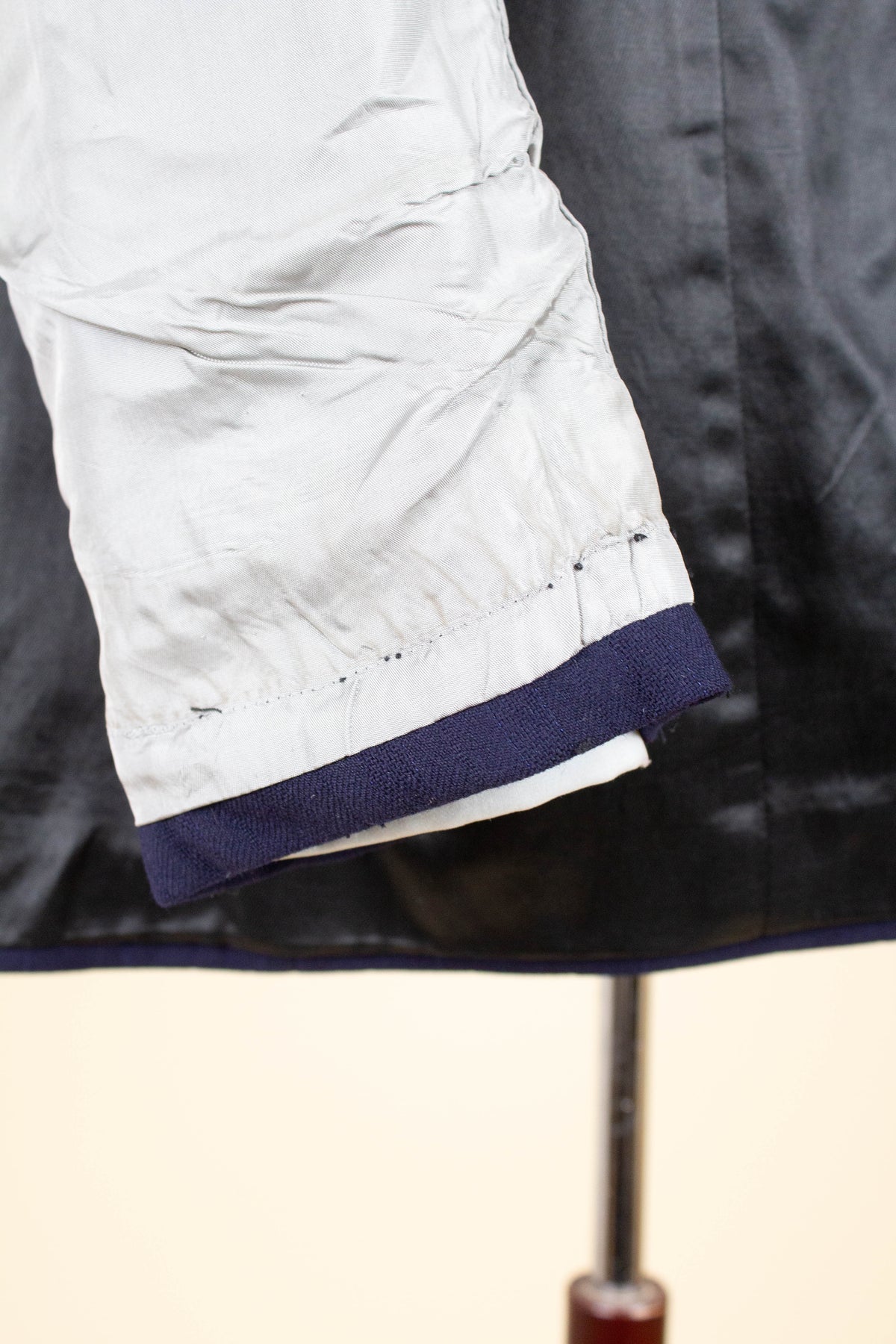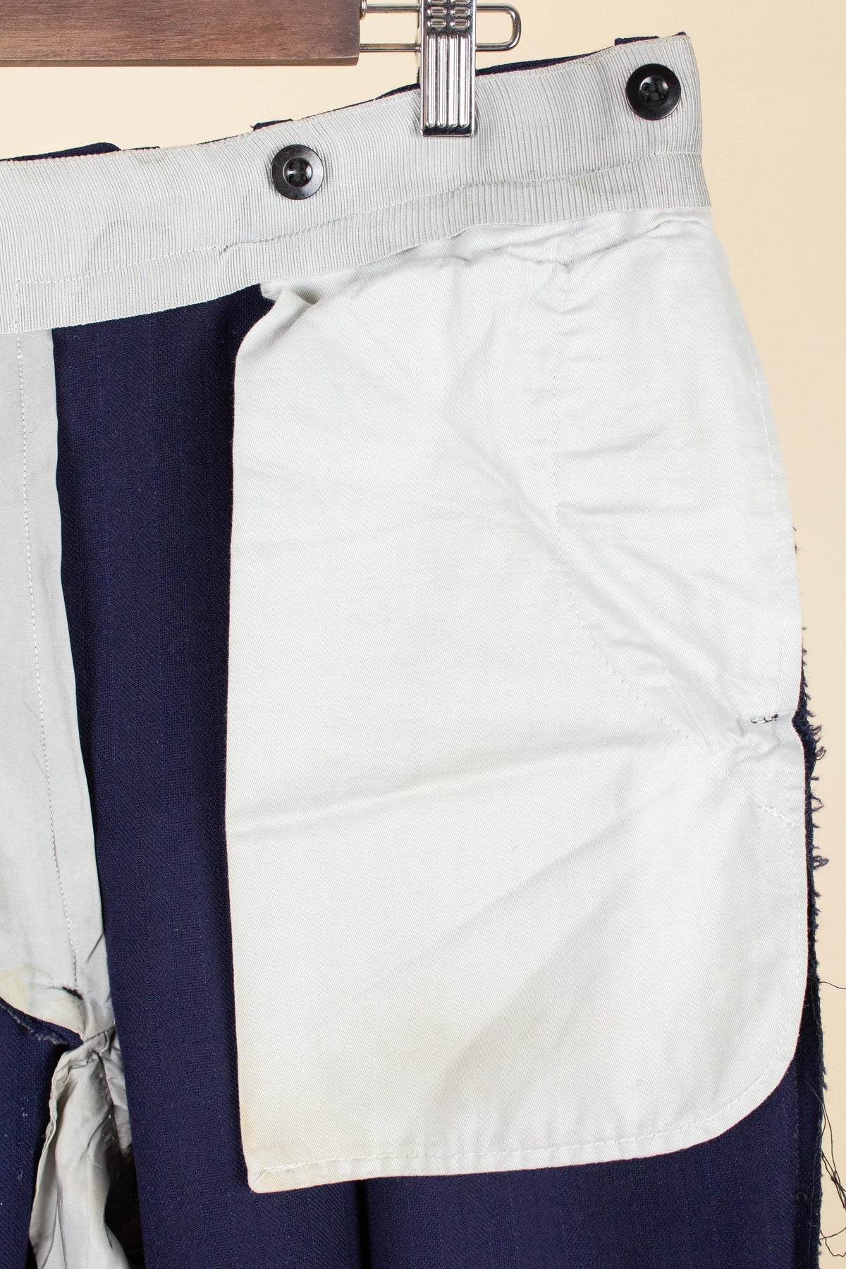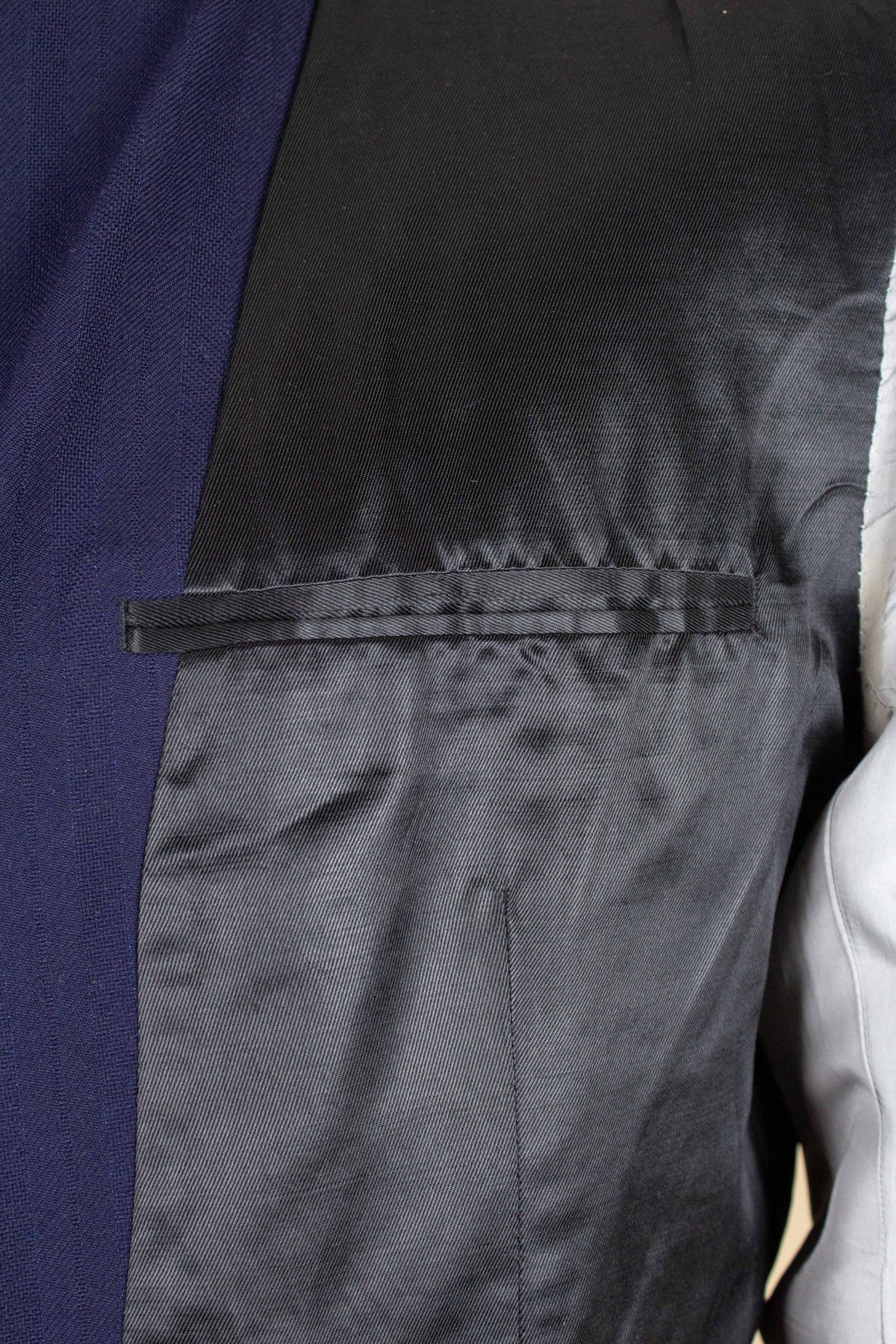 In terms of condition, the overall impression is good, although closer inspection reveals a few points to note. The sleeves have been lengthened at some point, which can be detected at the cuffs. There are also some discolourations in the lining, both in the jacket and the trousers. In addition, there is a small area of pilling on the jacket fabric along the front edge. Please review the images and form your own assessment of the condition.