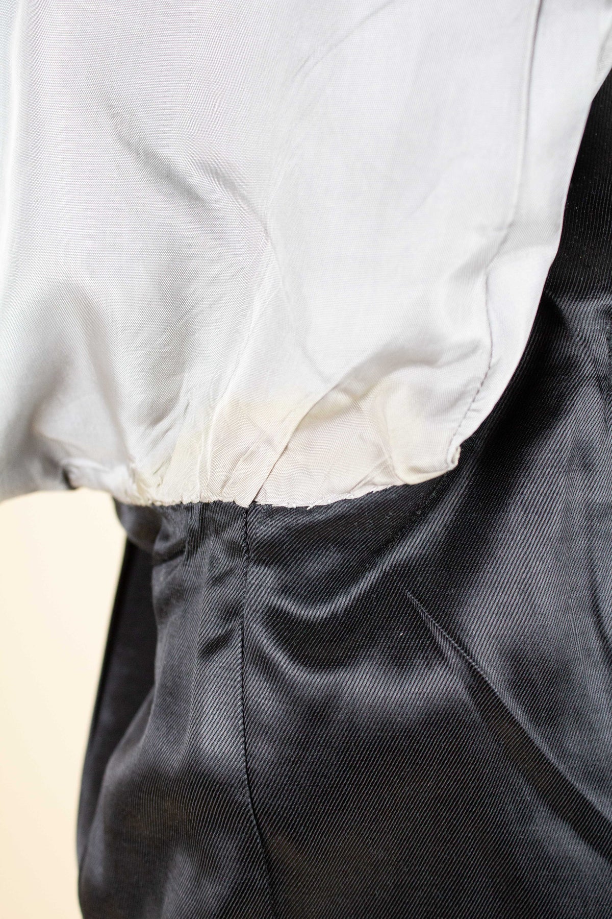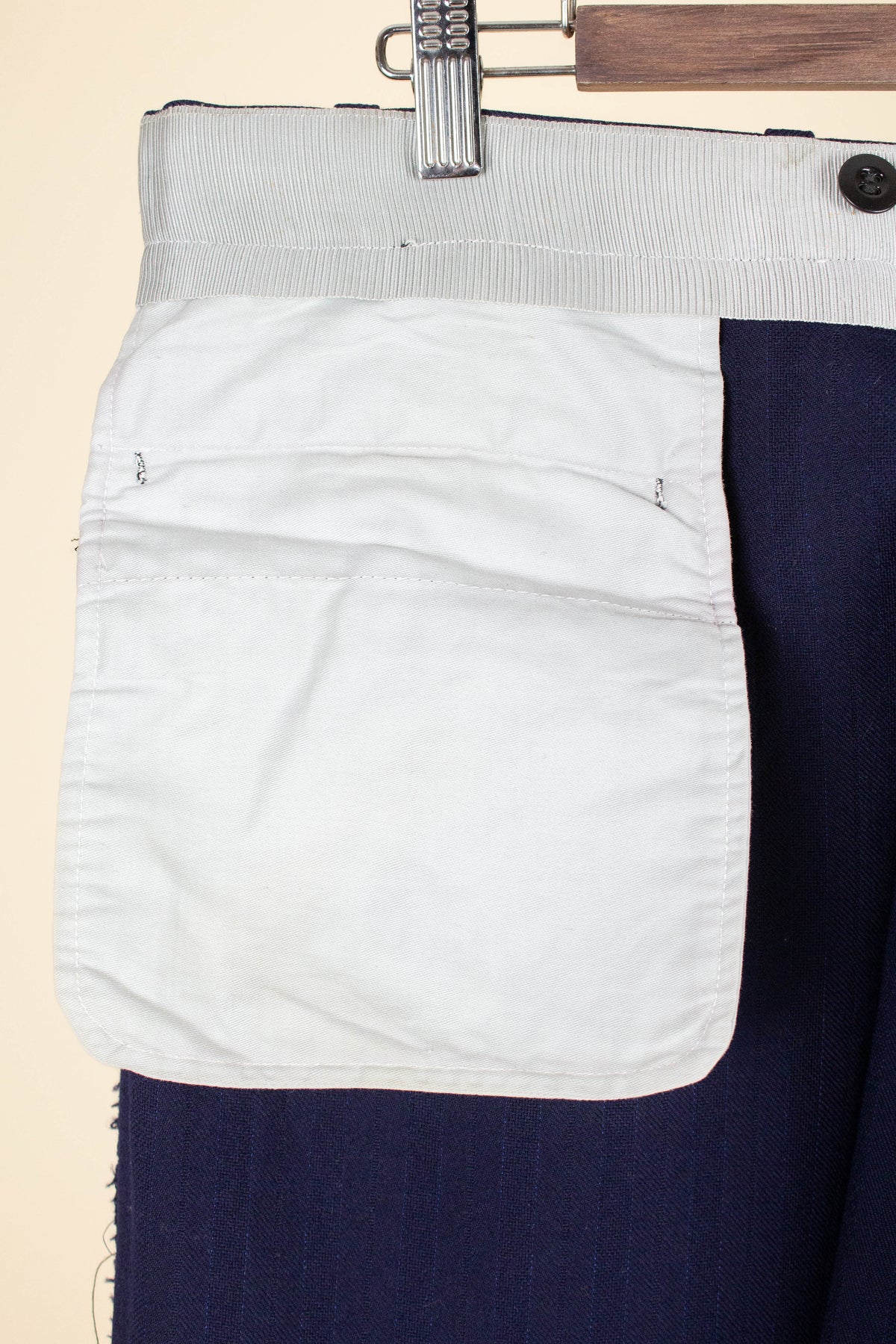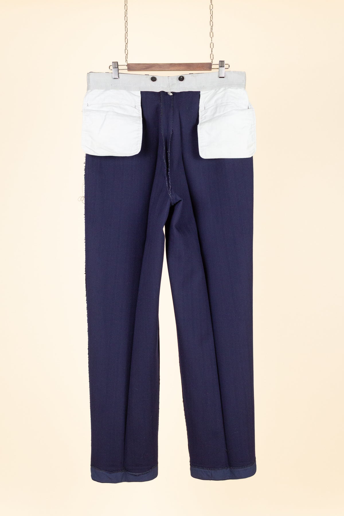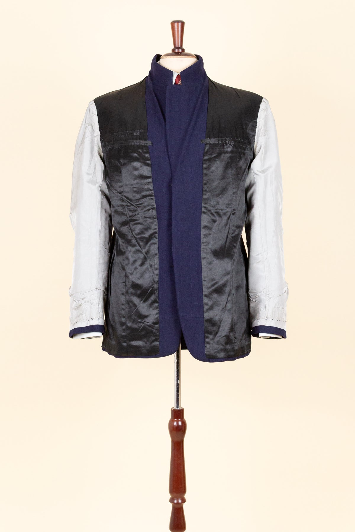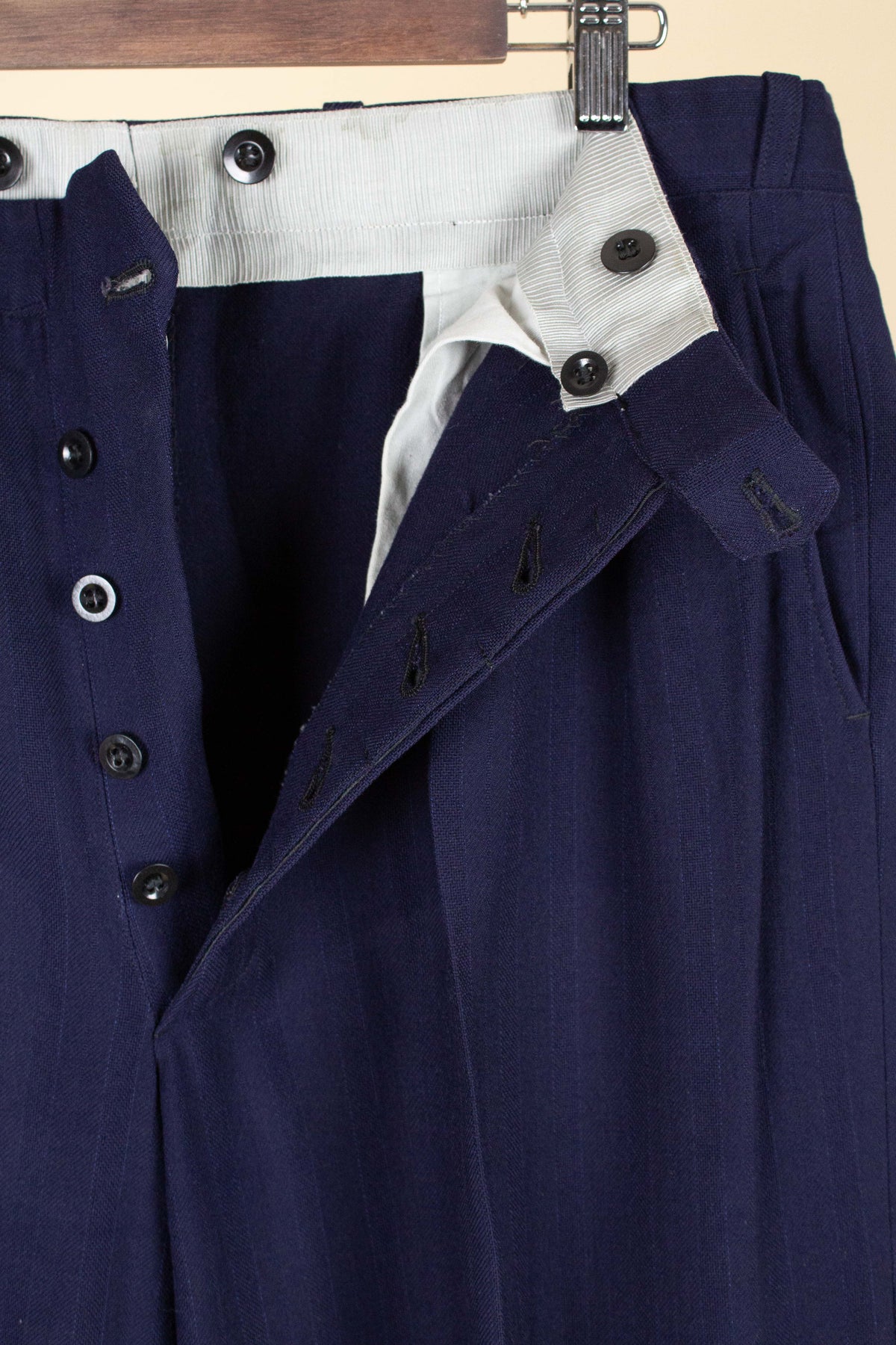 In terms of condition, the overall impression is good, although closer inspection reveals a few points to note. The sleeves have been lengthened at some point, which can be detected at the cuffs. There are also some discolourations in the lining, both in the jacket and the trousers. In addition, there is a small area of pilling on the jacket fabric along the front edge. Please review the images and form your own assessment of the condition.