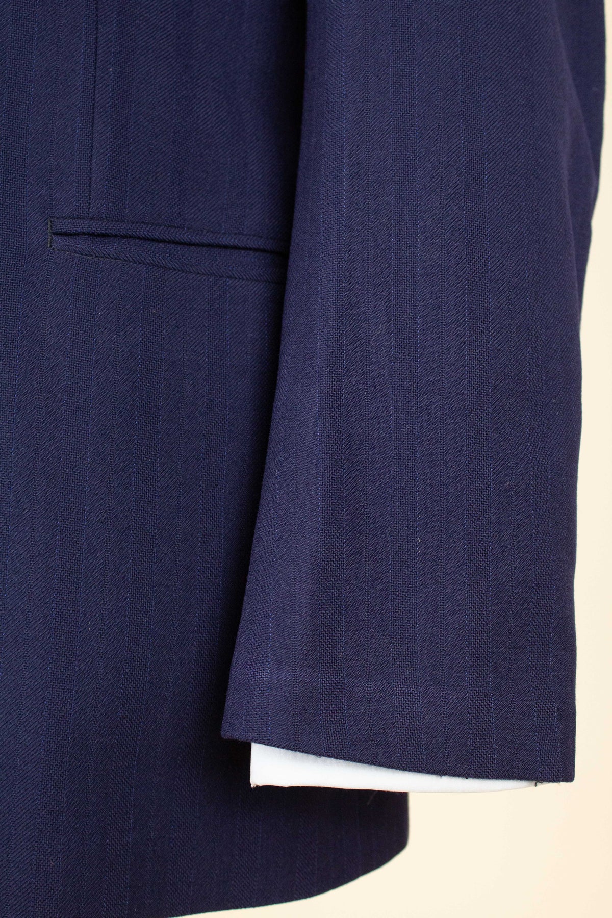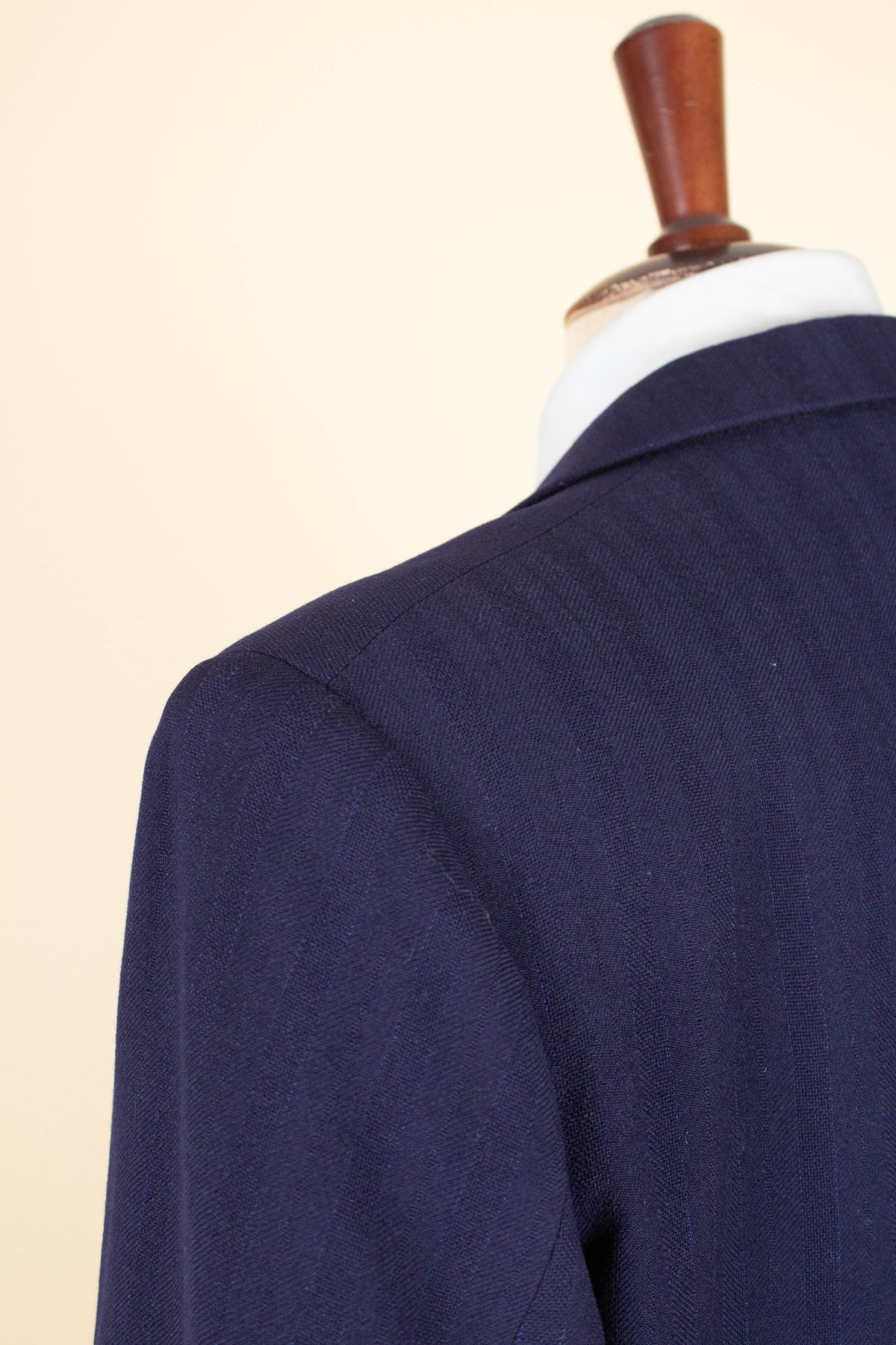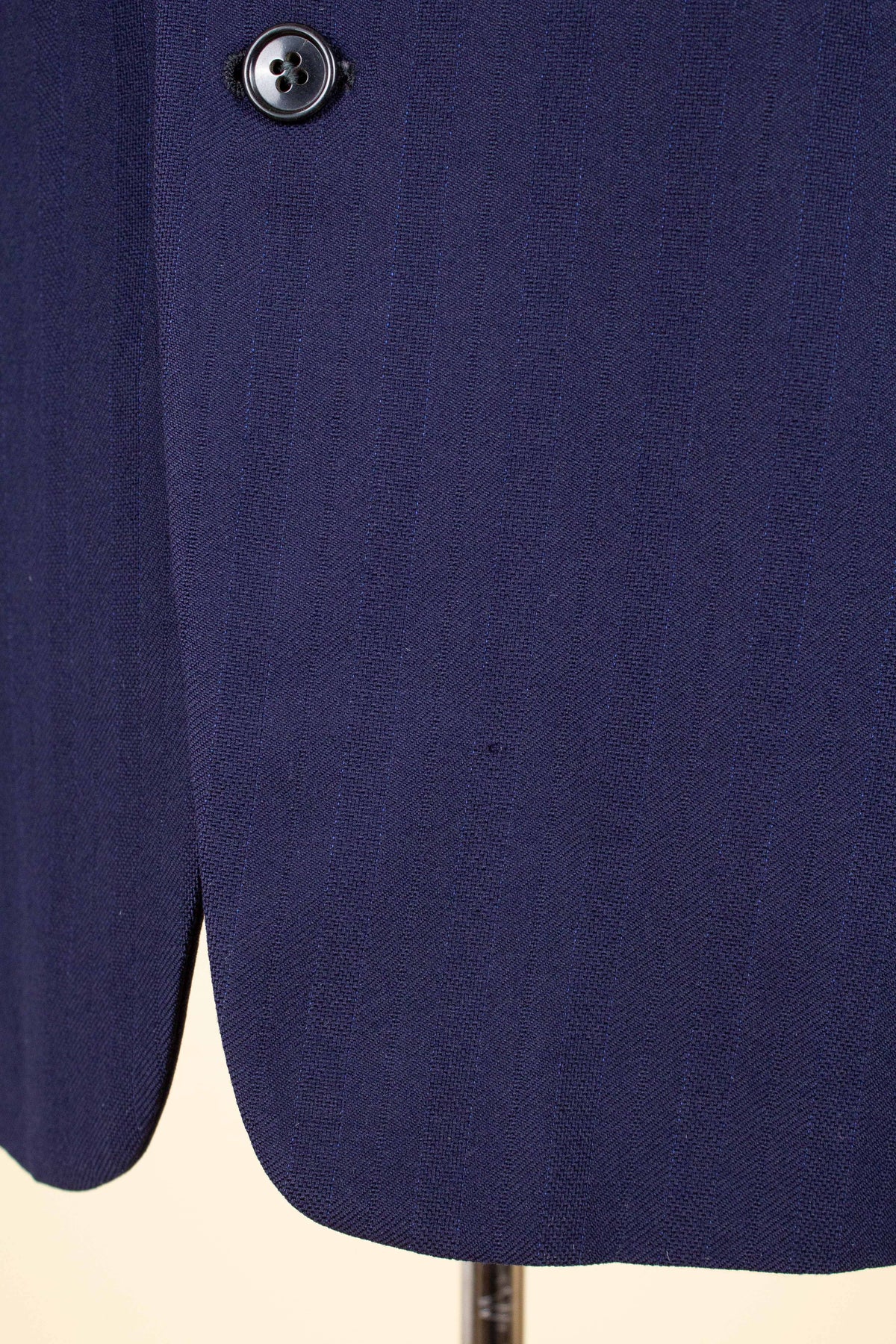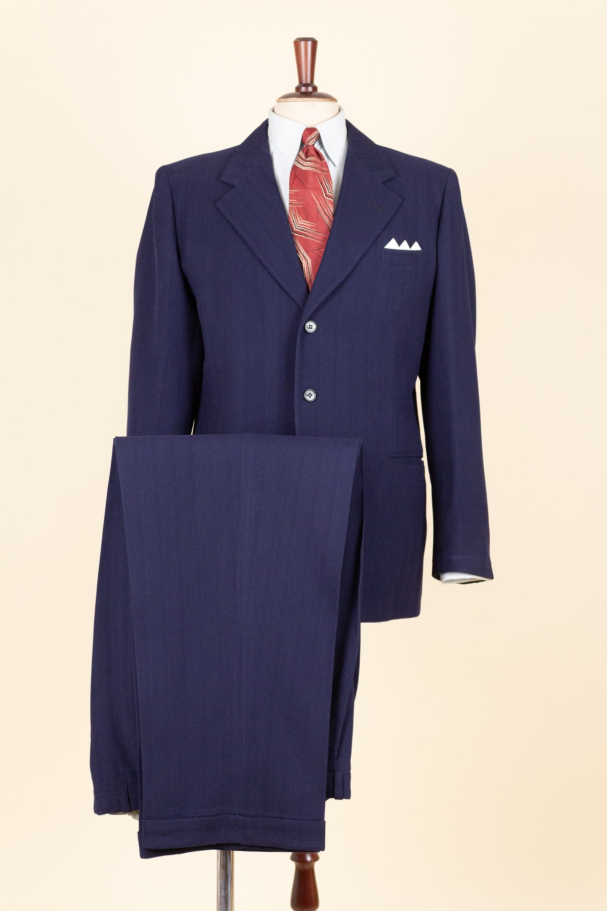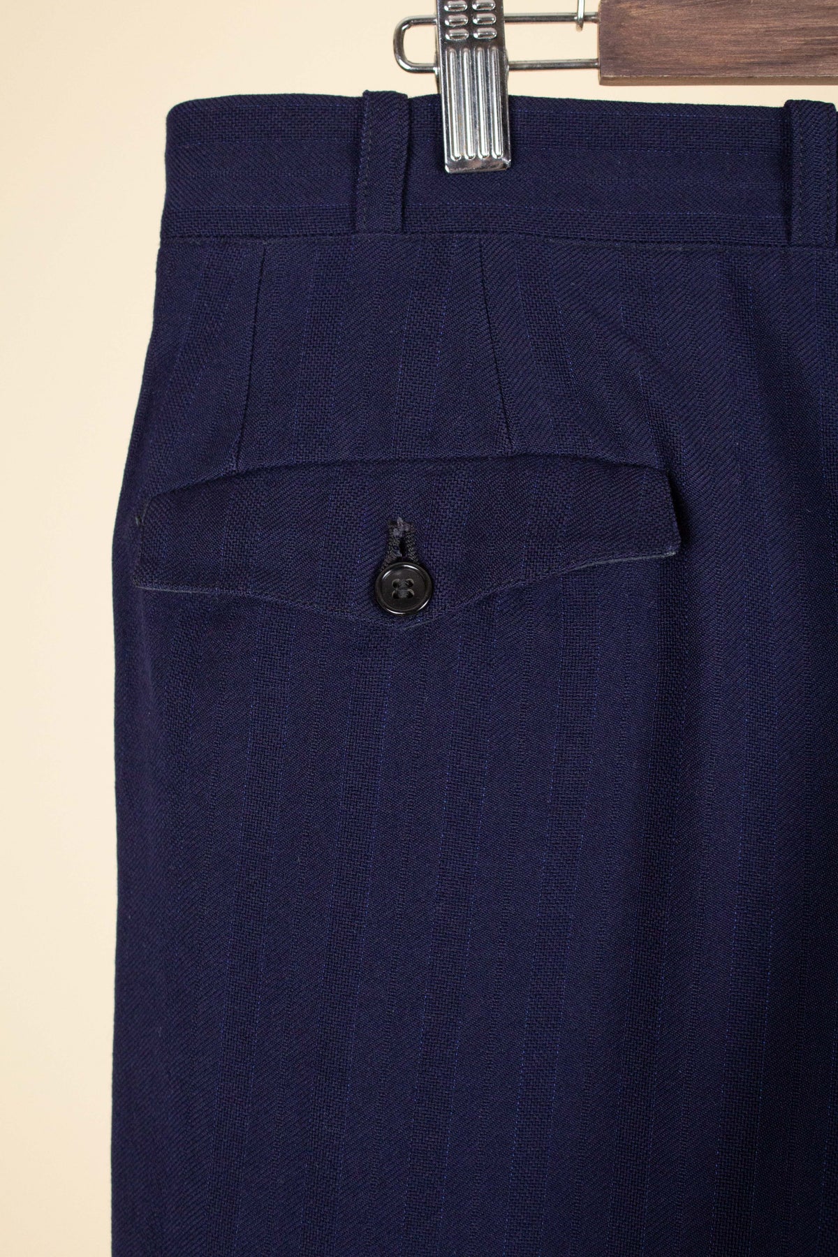 This suit is of Swedish origin and by Rappson, a well-known Swedish ready-to-wear manufacturer that had its heyday during the 1940s. The suit dates from this period. It is made from a wool fabric in a fairly bold blue tone with a subtle pinstripe. Although we have not encountered this exact fabric before, it is nevertheless very period-appropriate in character.