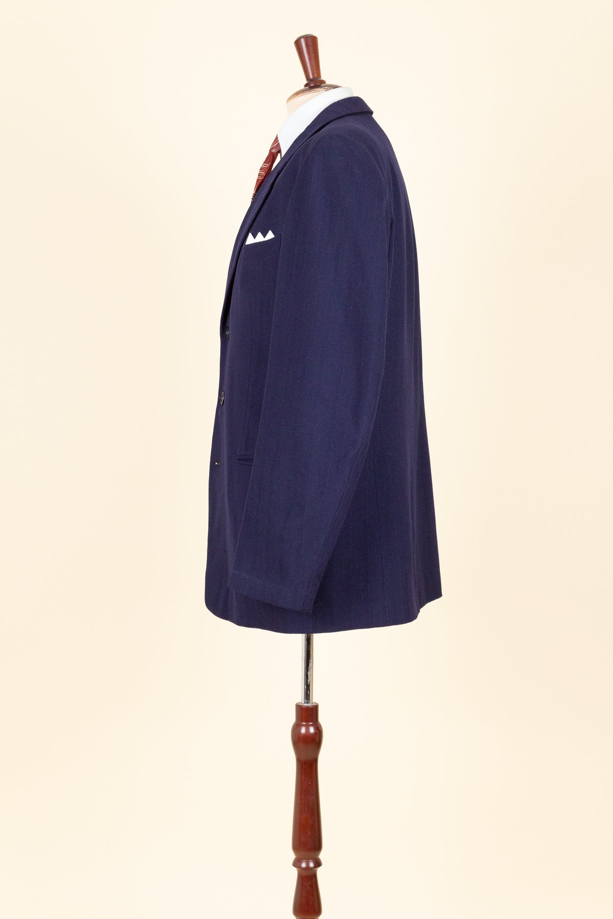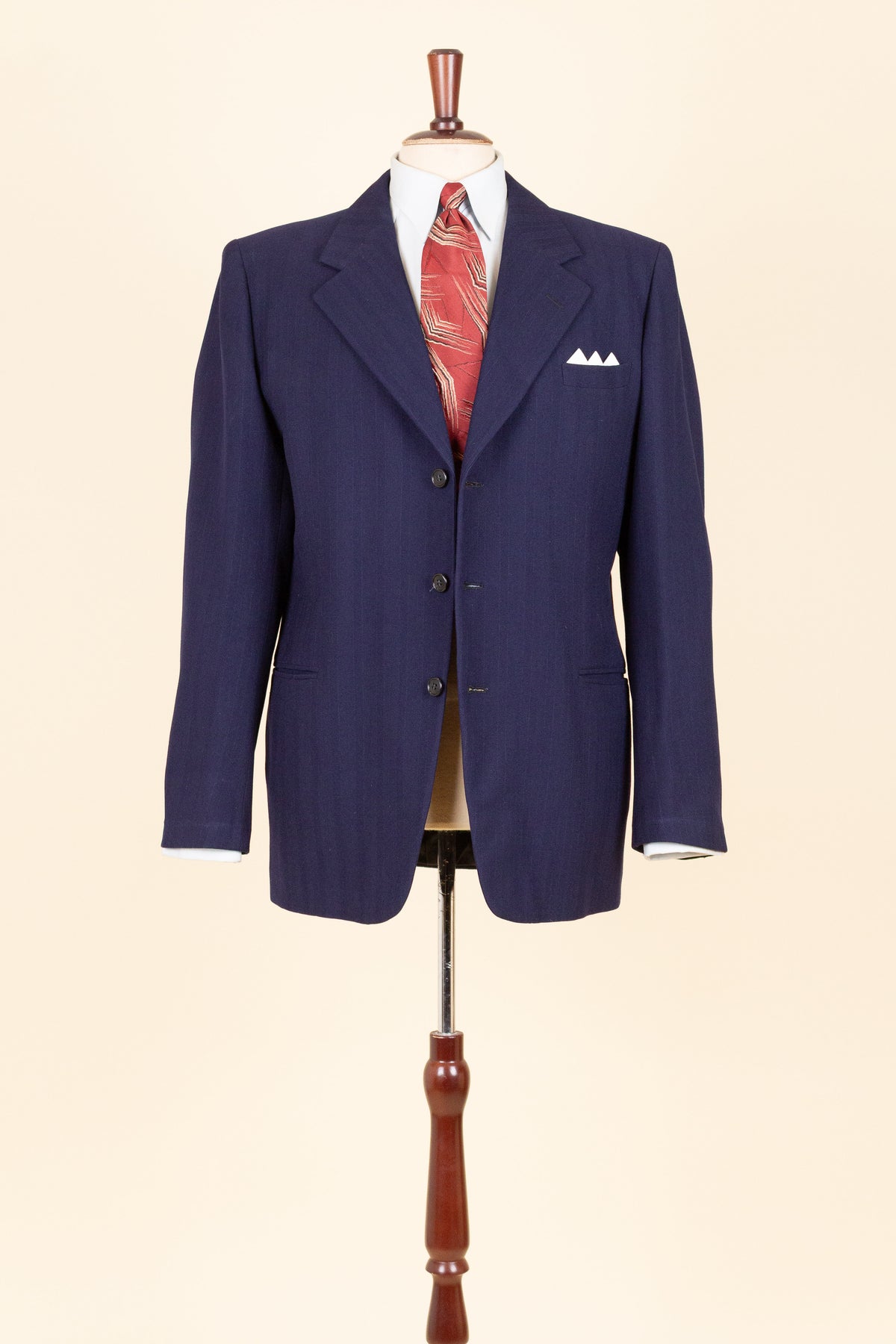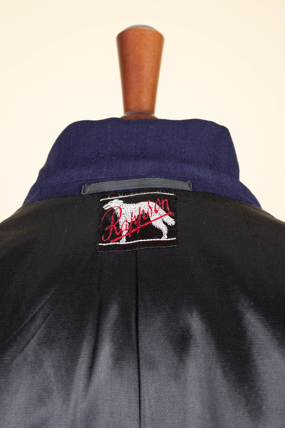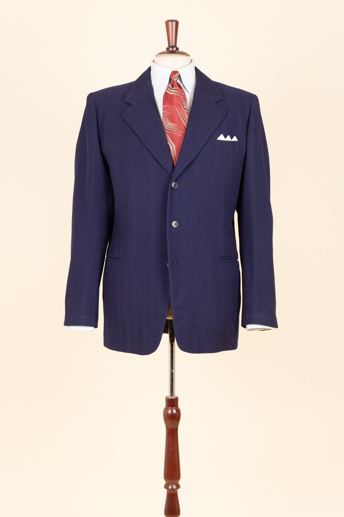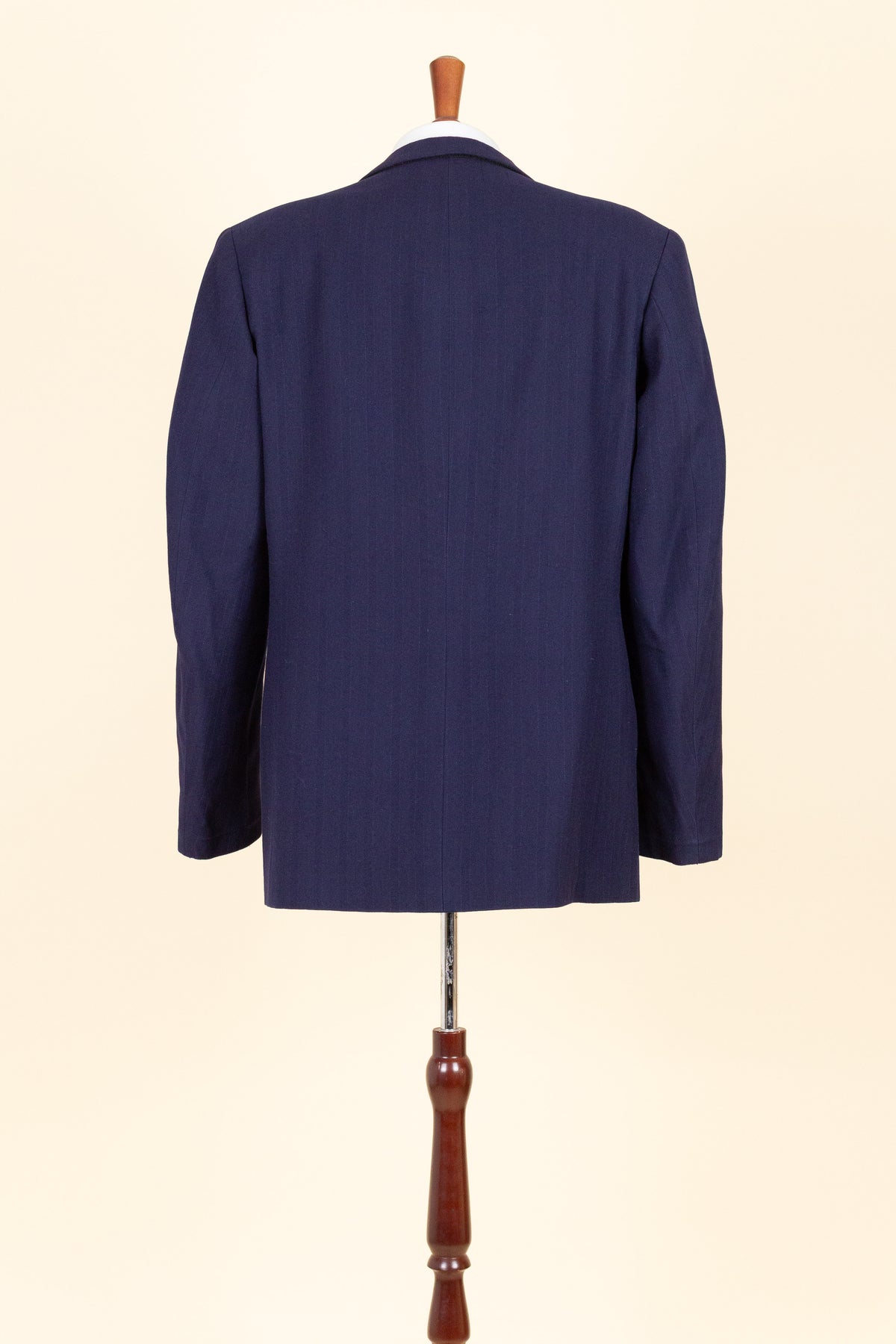 This suit is of Swedish origin and by Rappson, a well-known Swedish ready-to-wear manufacturer that had its heyday during the 1940s. The suit dates from this period. It is made from a wool fabric in a fairly bold blue tone with a subtle pinstripe. Although we have not encountered this exact fabric before, it is nevertheless very period-appropriate in character.