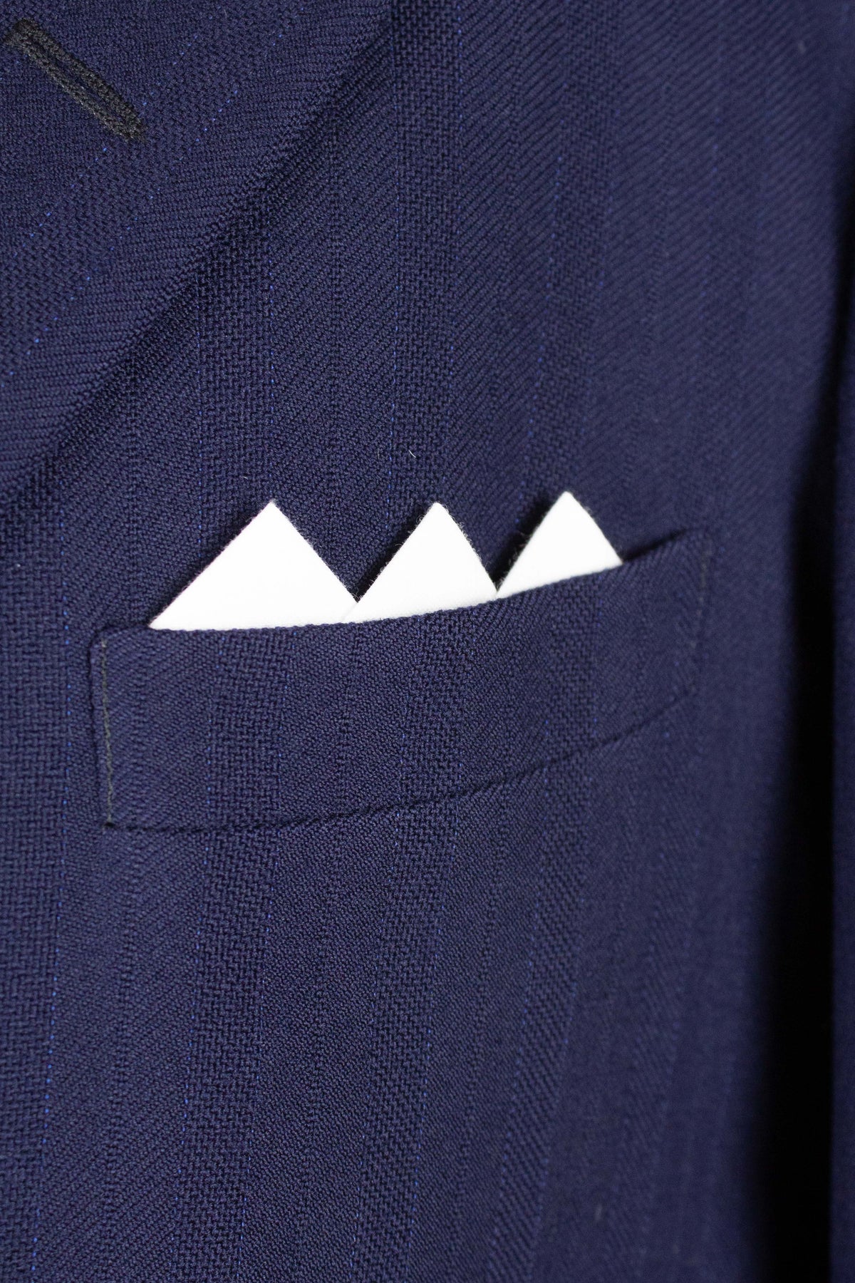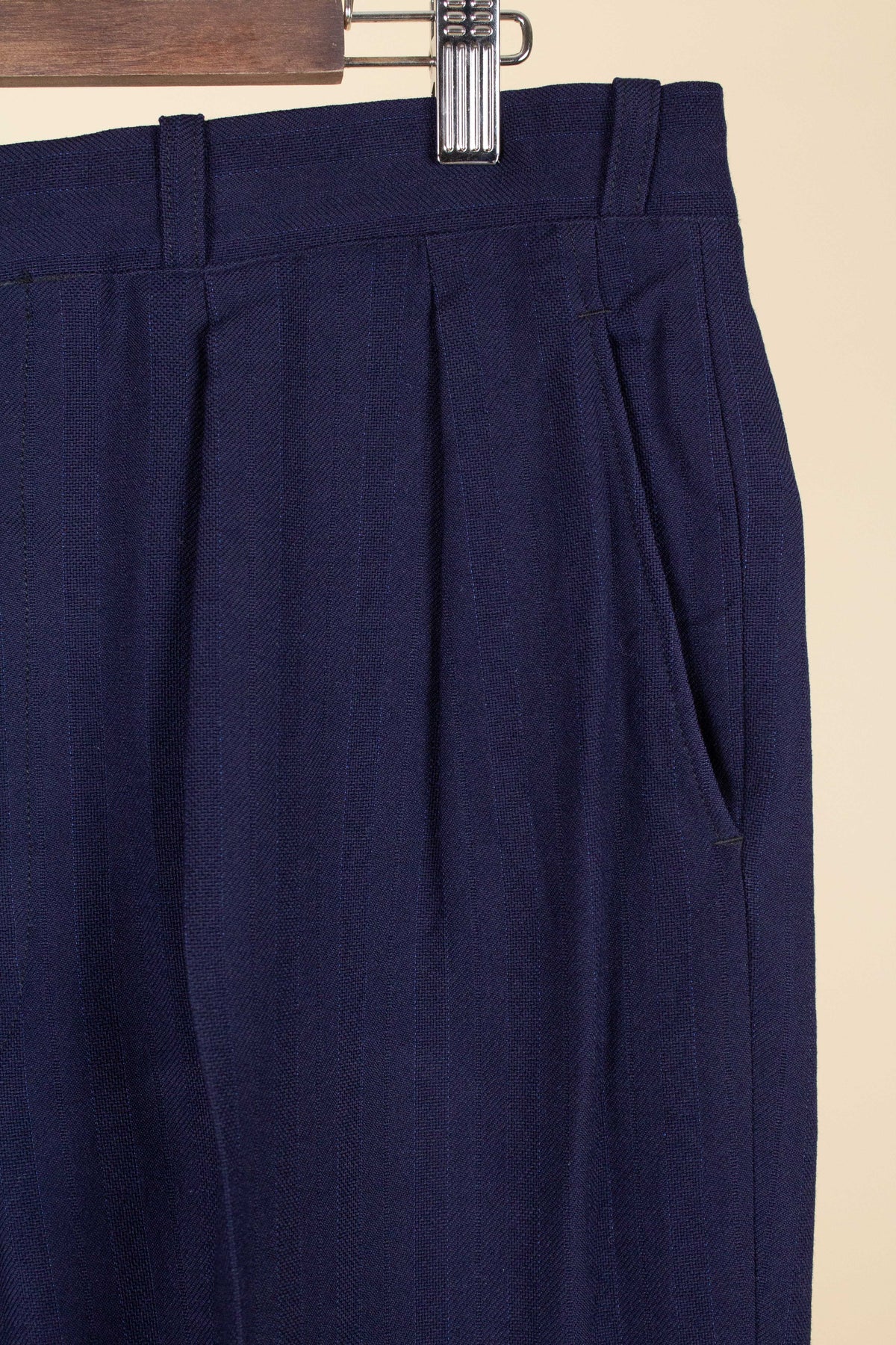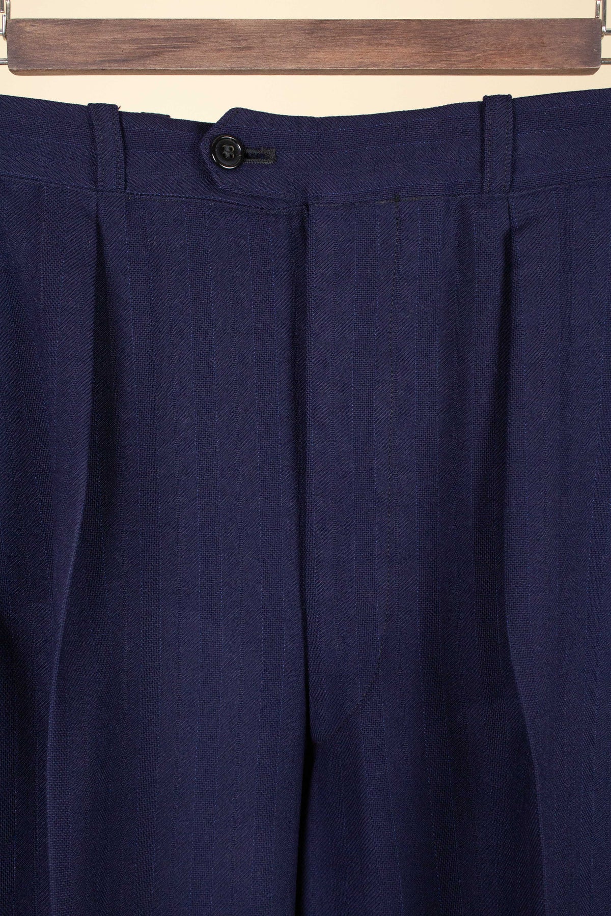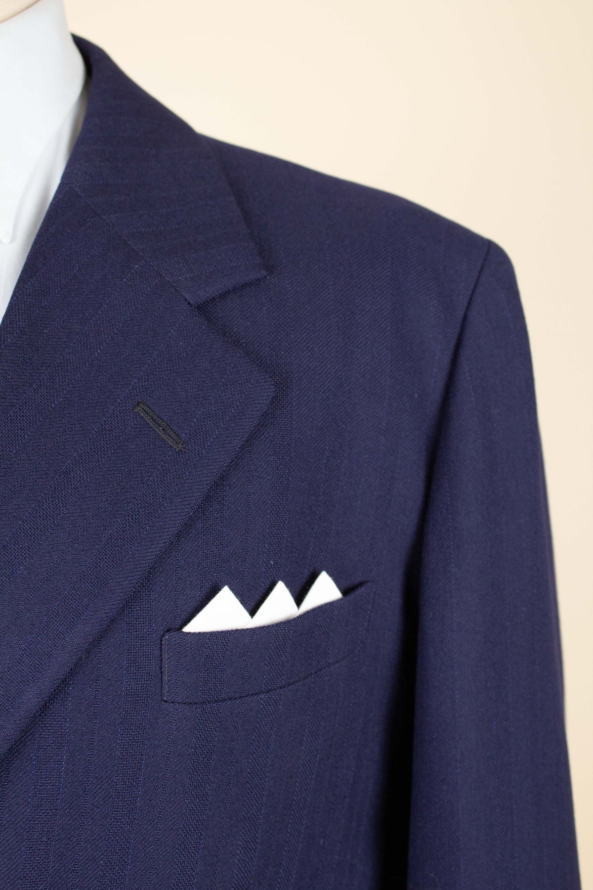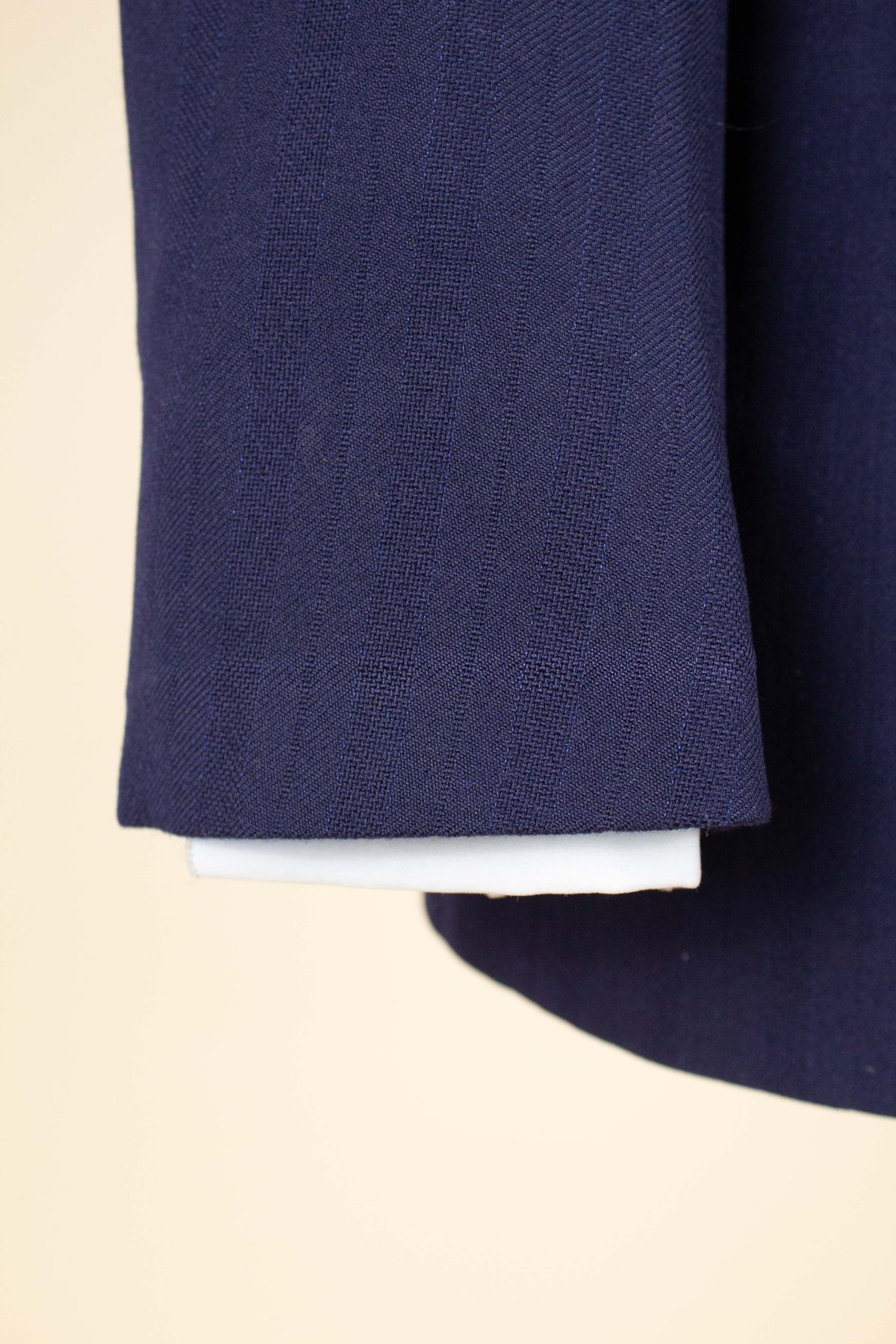 This suit is of Swedish origin and by Rappson, a well-known Swedish ready-to-wear manufacturer that had its heyday during the 1940s. The suit dates from this period. It is made from a wool fabric in a fairly bold blue tone with a subtle pinstripe. Although we have not encountered this exact fabric before, it is nevertheless very period-appropriate in character.