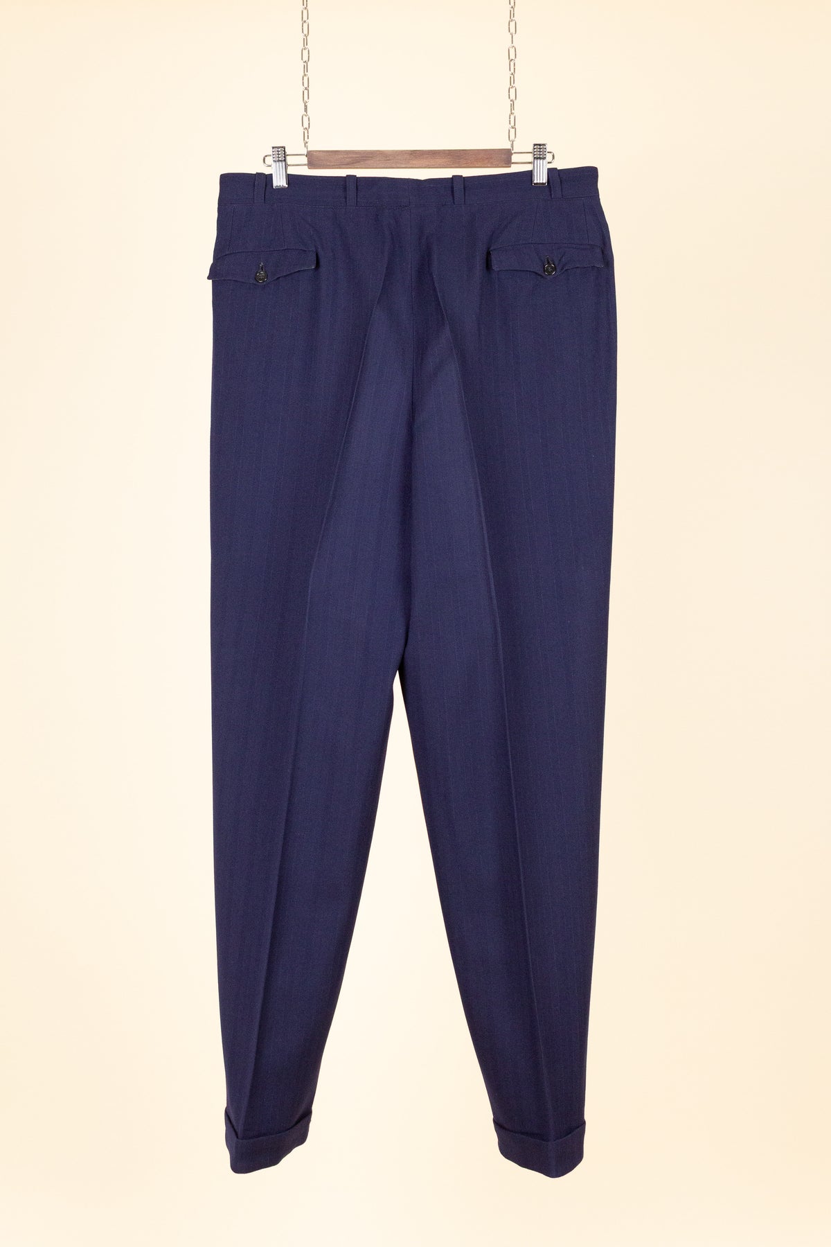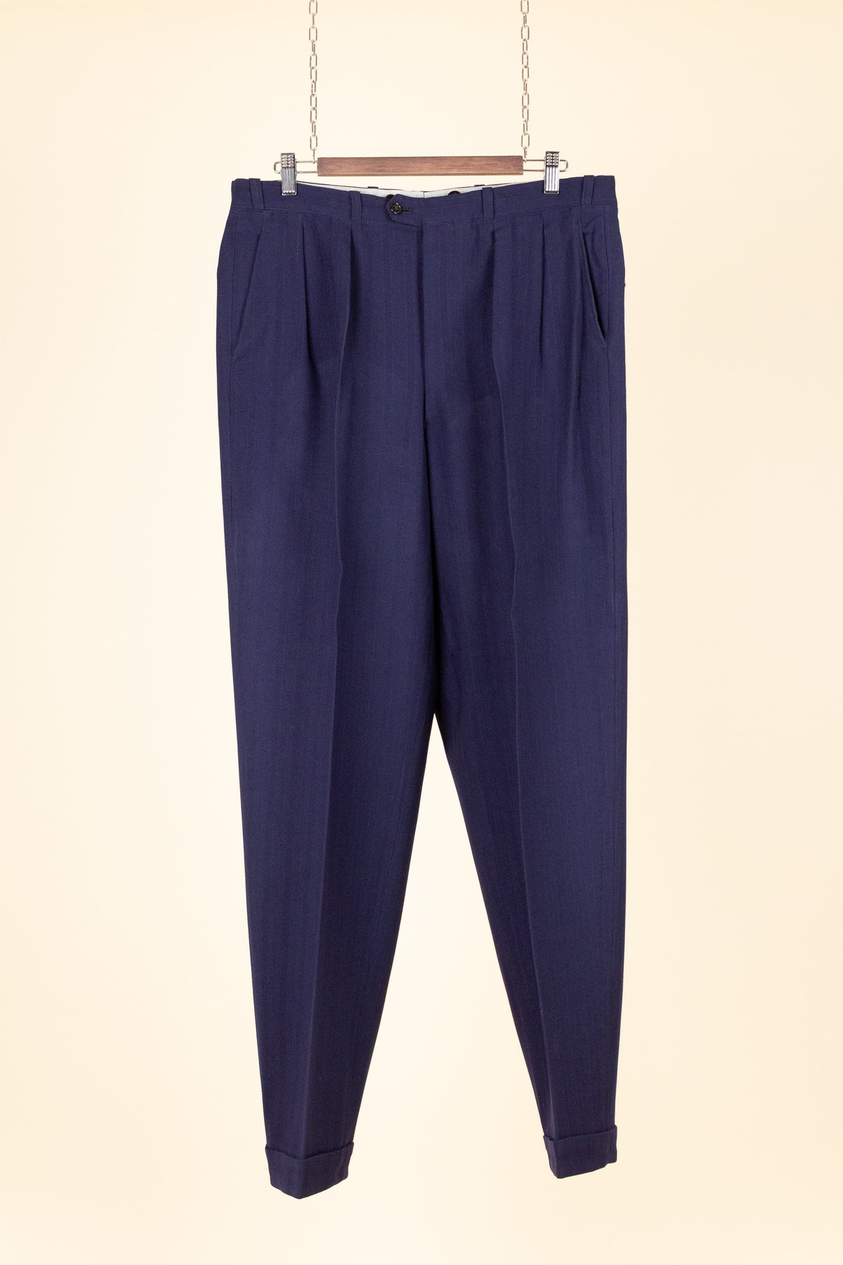 The trousers feature double forward pleats and slightly slanted front pockets. They have both belt loops and buttons on the inside of the waistband for braces. The fly is button-fastened, and the trouser hems are finished with turn-ups. At the back, there is one pocket on each side, both with flaps and button closures.