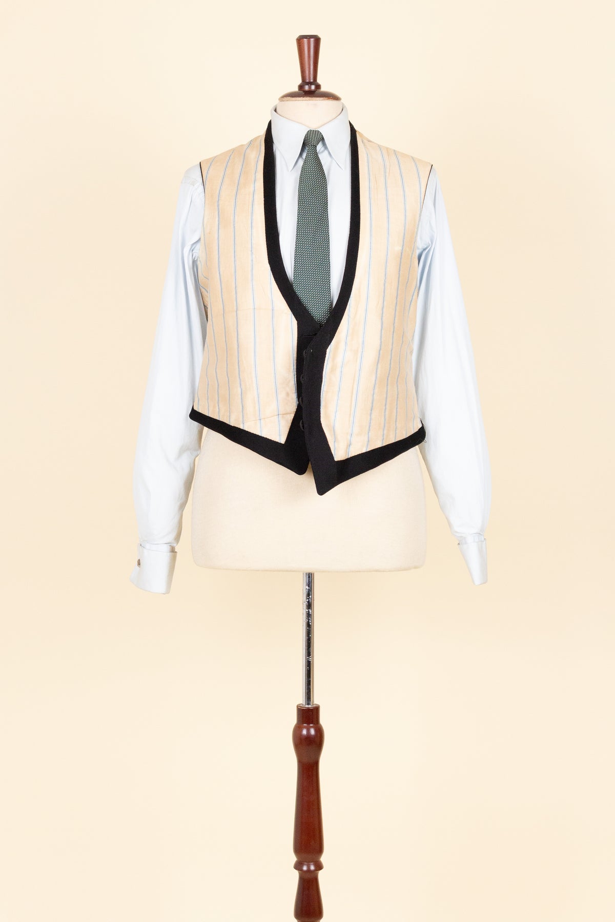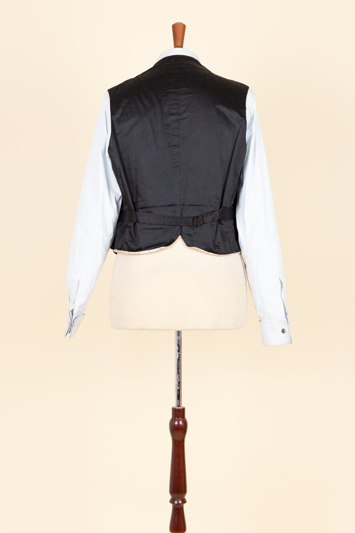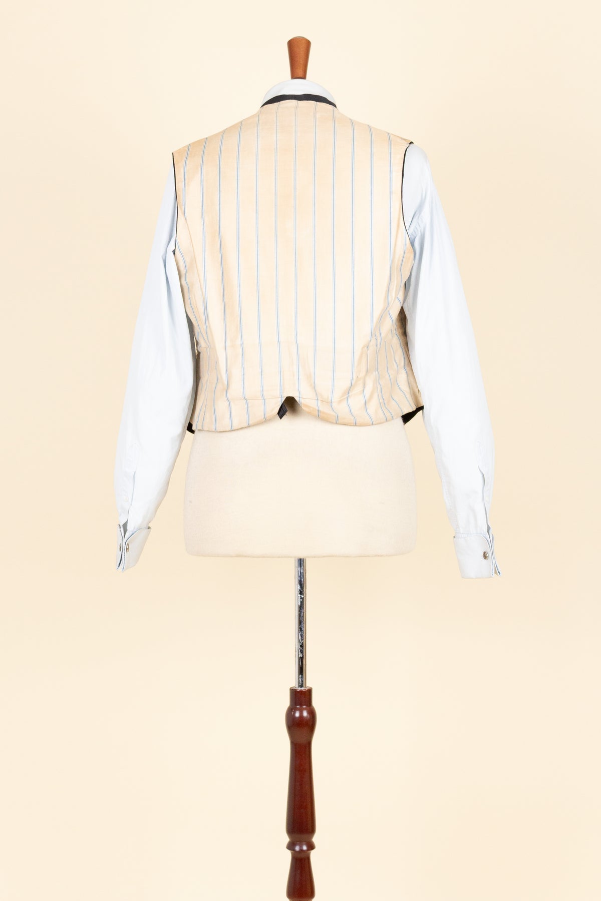 The waistcoat has a relatively low button stance and fastens with four covered buttons. It has a front pocket on each side. At the back, there is an adjustable strap to modify the fit. The interior is lined with a blue-striped cotton fabric.