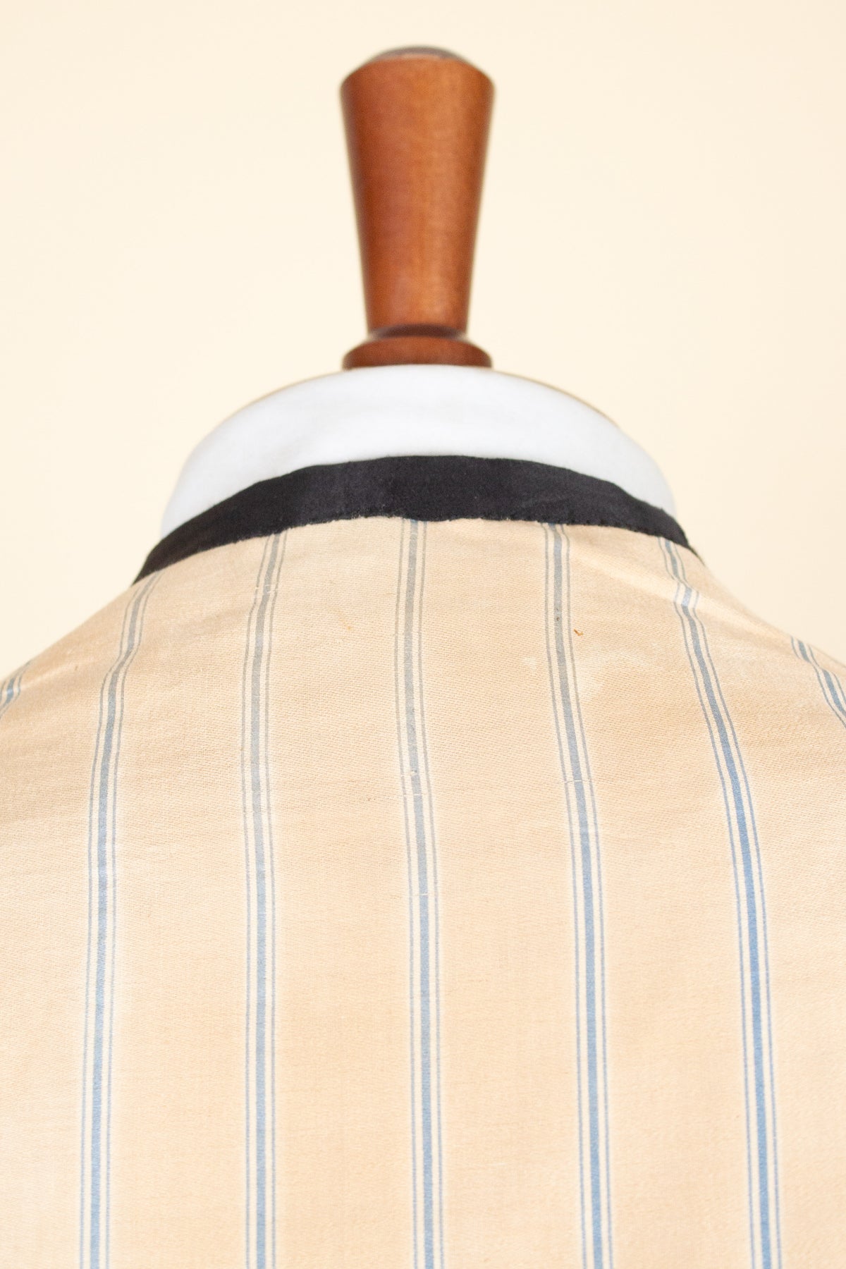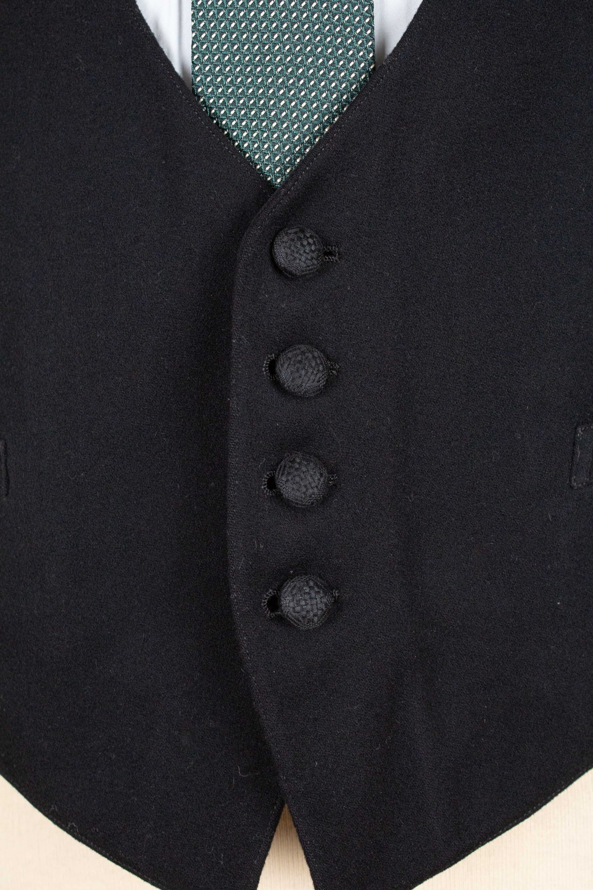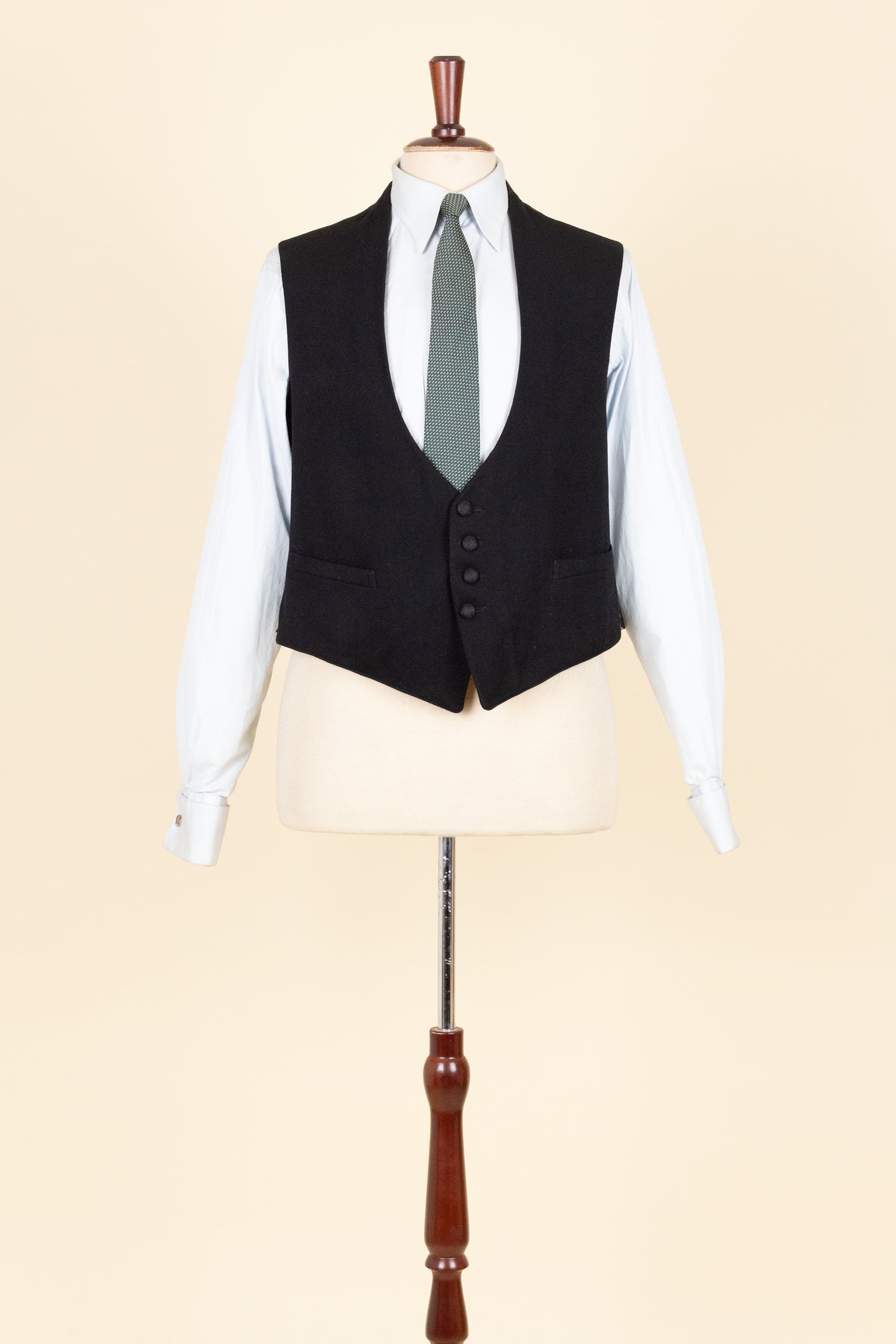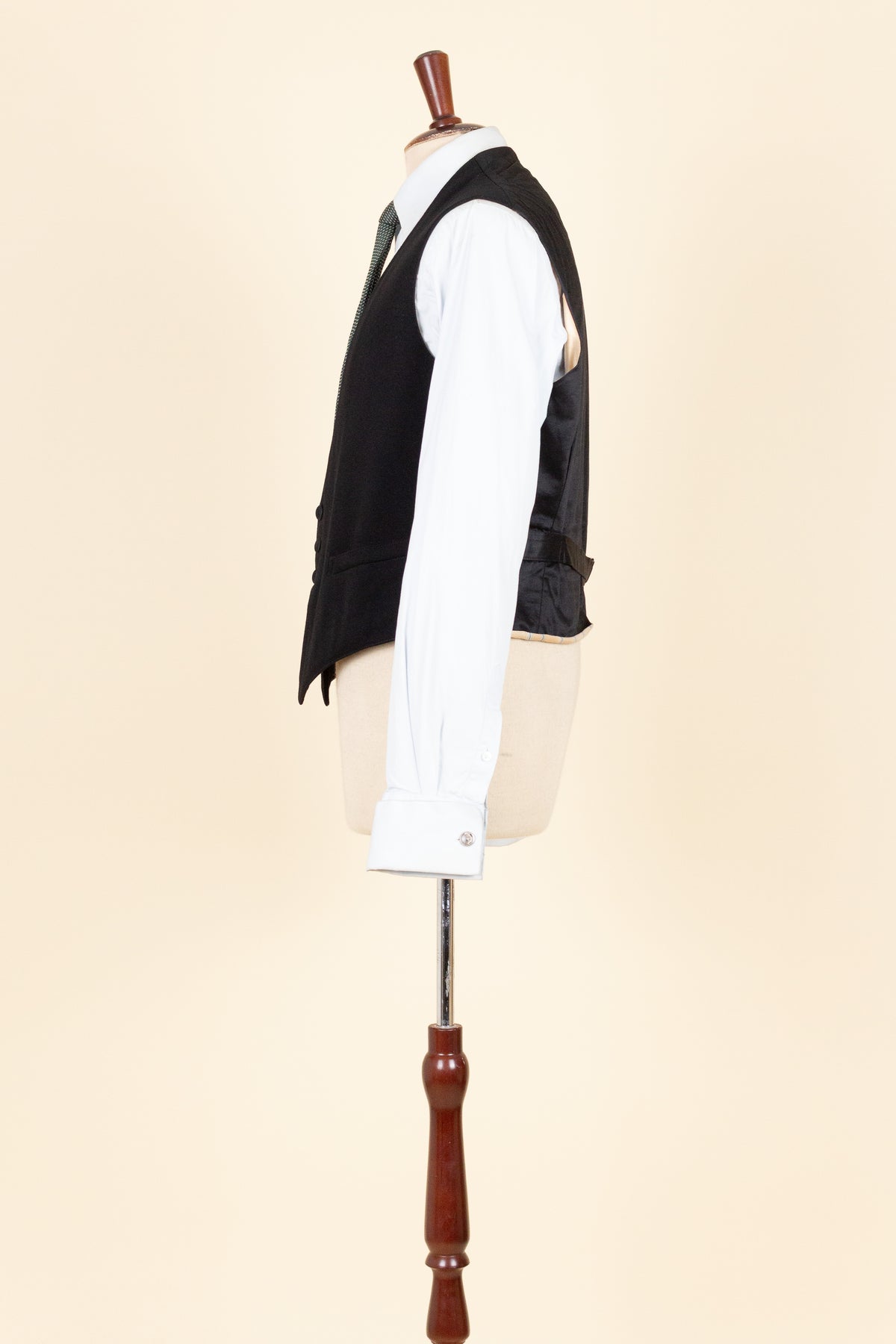 The waistcoat has a relatively low button stance and fastens with four covered buttons. It has a front pocket on each side. At the back, there is an adjustable strap to modify the fit. The interior is lined with a blue-striped cotton fabric.