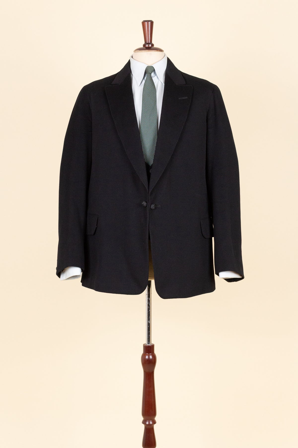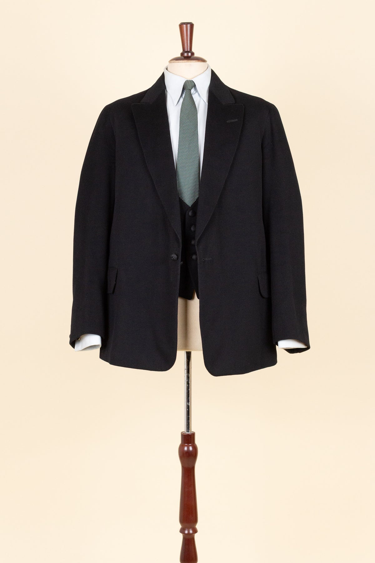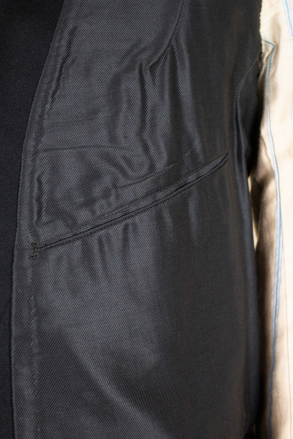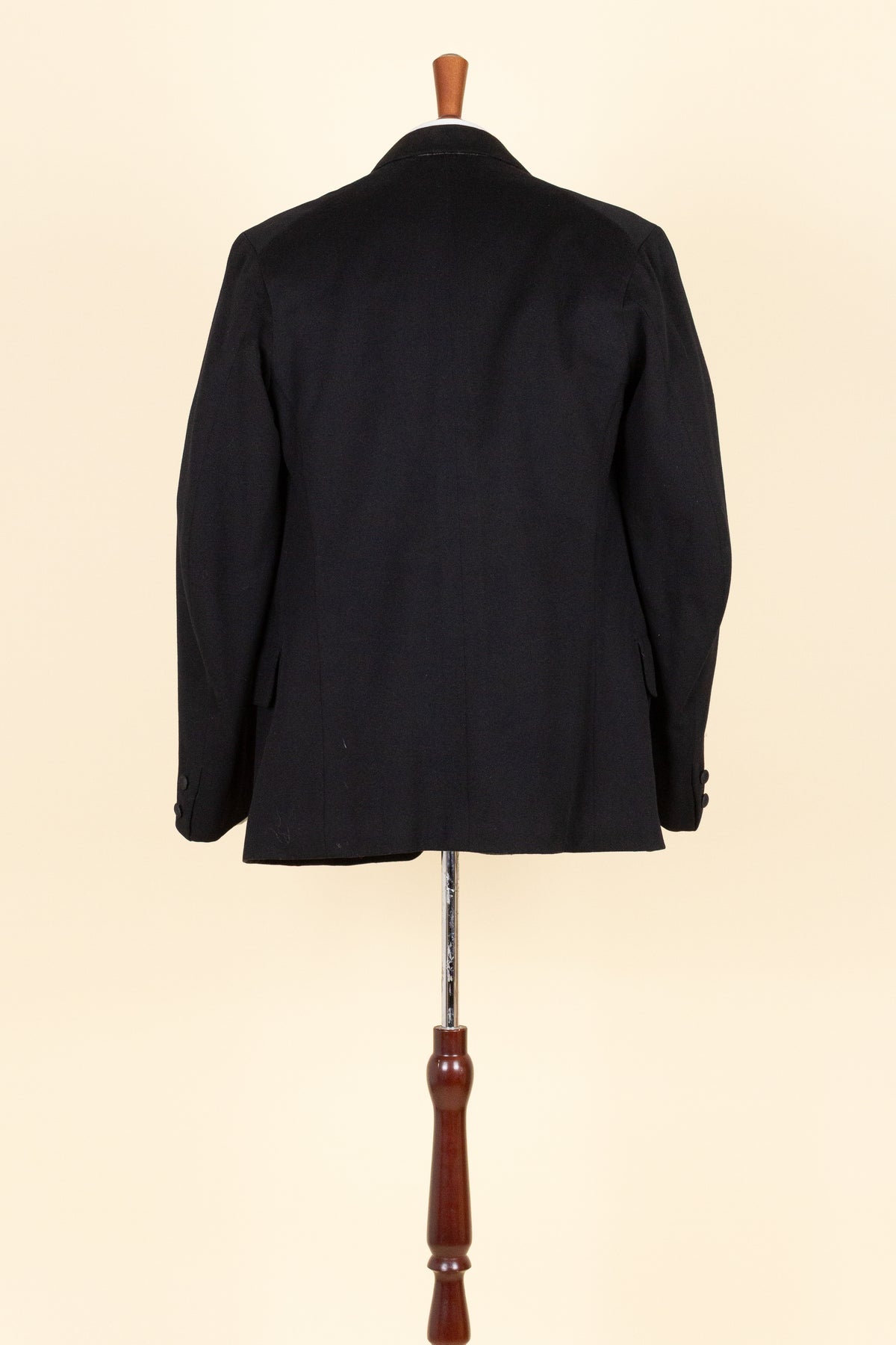 The jacket fastens with a covered button and features horizontal front pockets with flaps. There is a buttonhole on the left lapel. Notably, it lacks a breast pocket—striking by today’s standards, but not uncommon at the time. The sleeve cuffs also have covered buttons. The back is straight and closed, with no vent. Inside, the jacket is fully lined and has a discreet inner pocket on the right side.