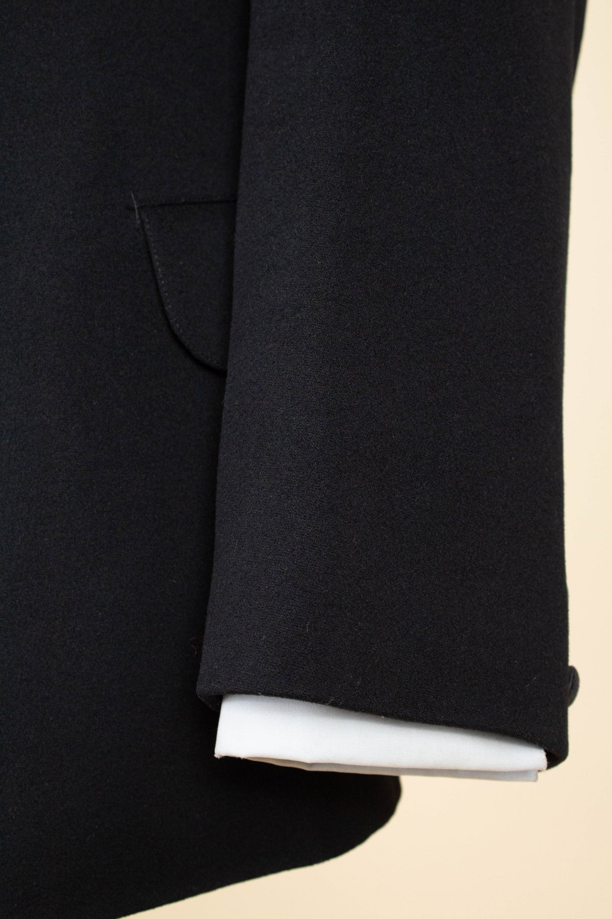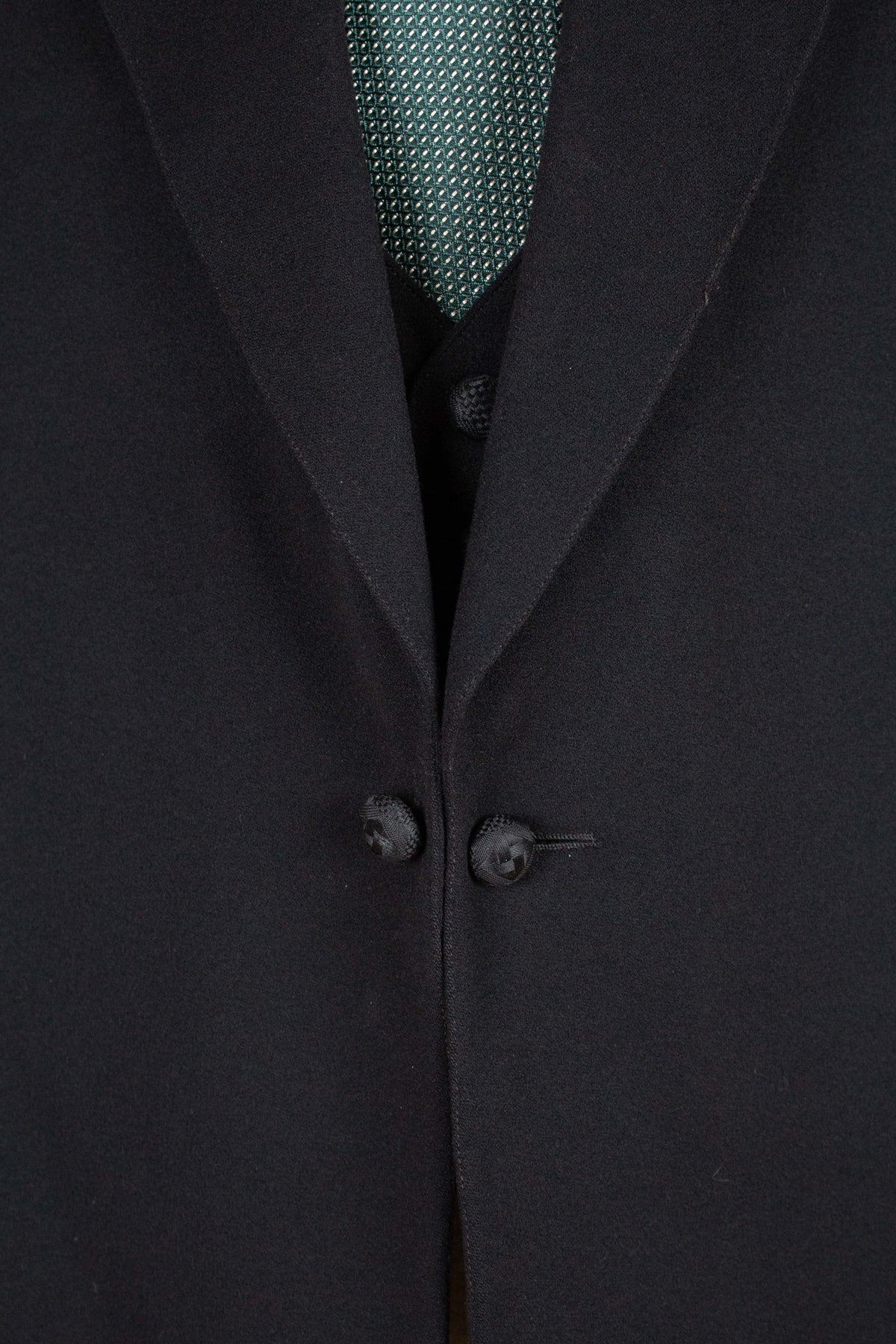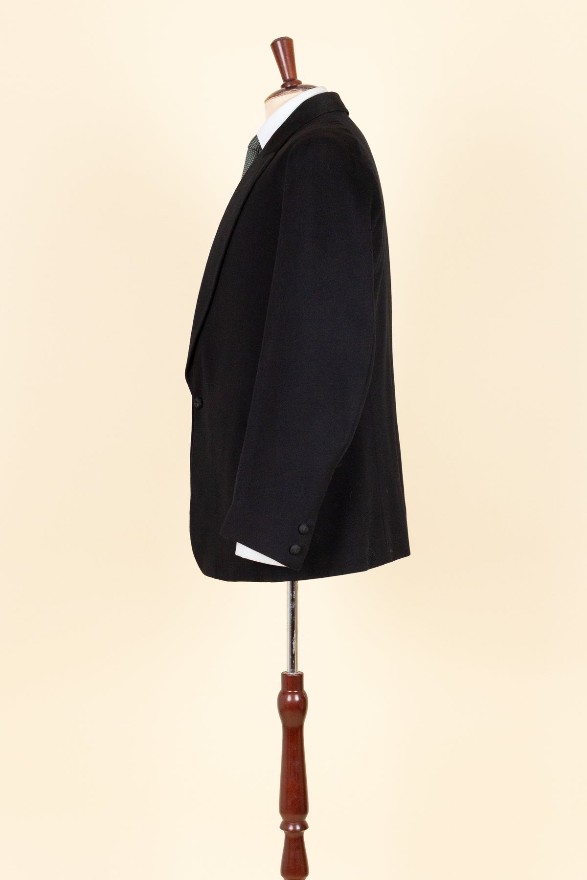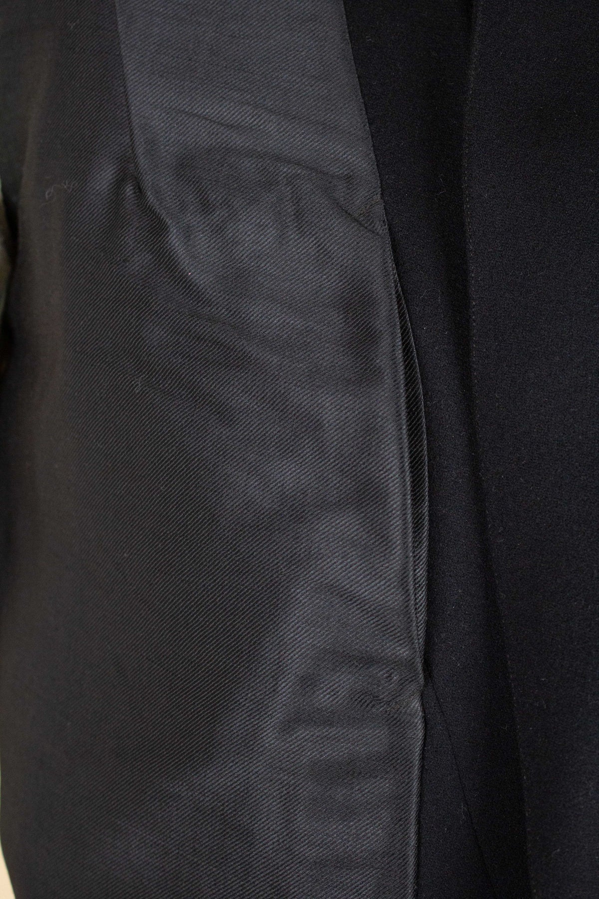 The jacket fastens with a covered button and features horizontal front pockets with flaps. There is a buttonhole on the left lapel. Notably, it lacks a breast pocket—striking by today’s standards, but not uncommon at the time. The sleeve cuffs also have covered buttons. The back is straight and closed, with no vent. Inside, the jacket is fully lined and has a discreet inner pocket on the right side.
