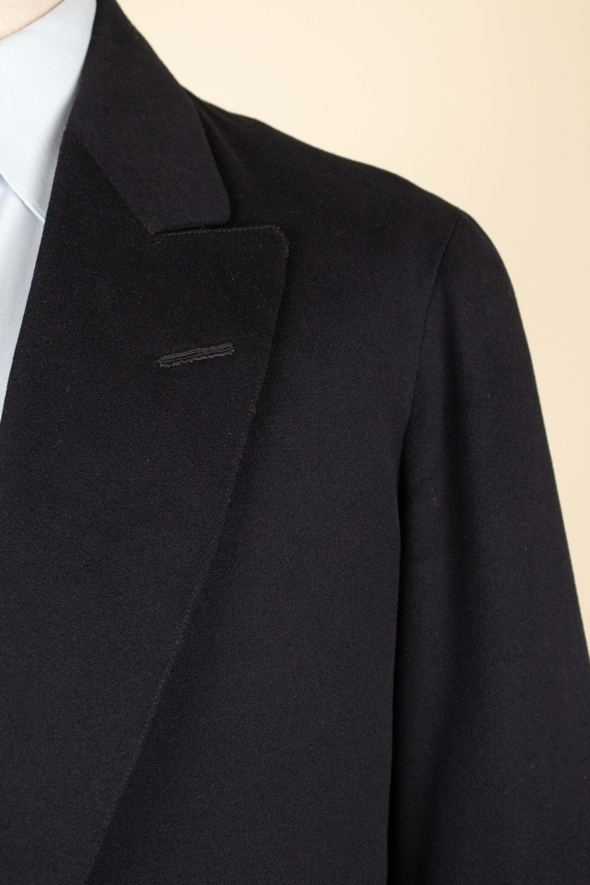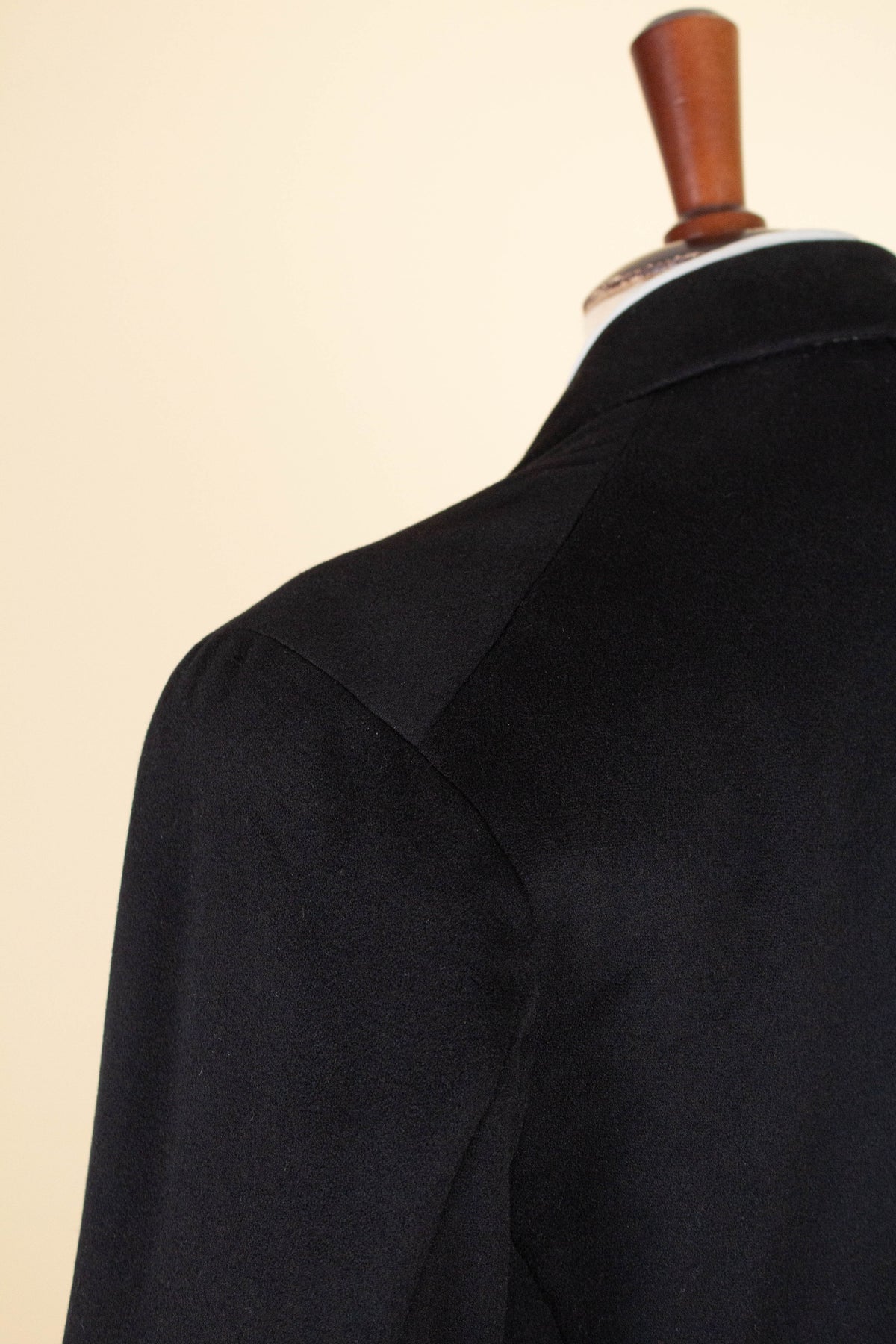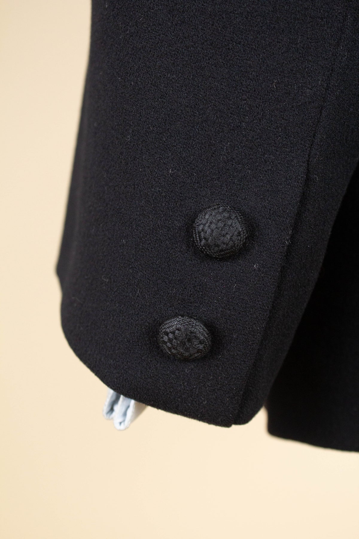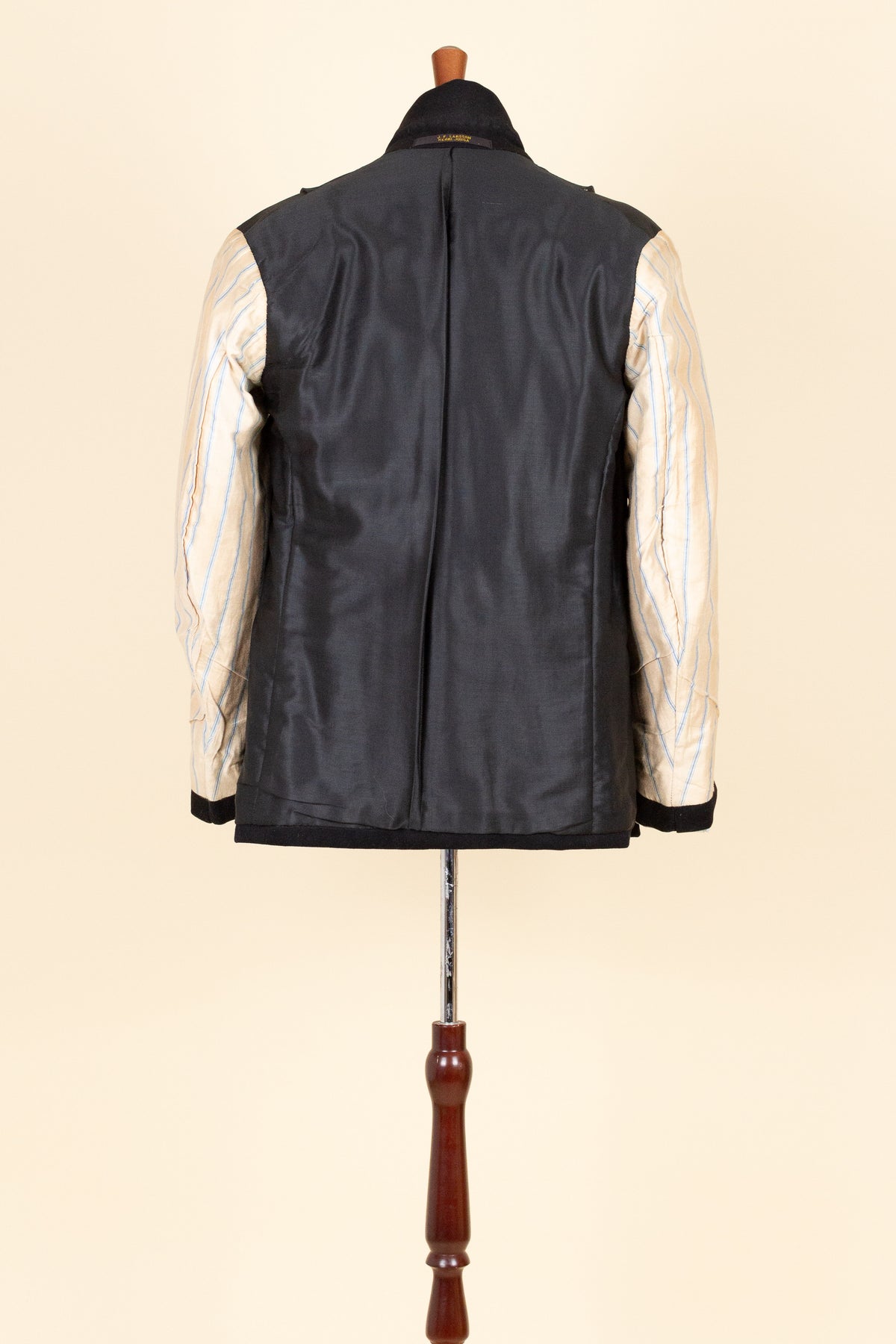 The jacket fastens with a covered button and features horizontal front pockets with flaps. There is a buttonhole on the left lapel. Notably, it lacks a breast pocket—striking by today’s standards, but not uncommon at the time. The sleeve cuffs also have covered buttons. The back is straight and closed, with no vent. Inside, the jacket is fully lined and has a discreet inner pocket on the right side.