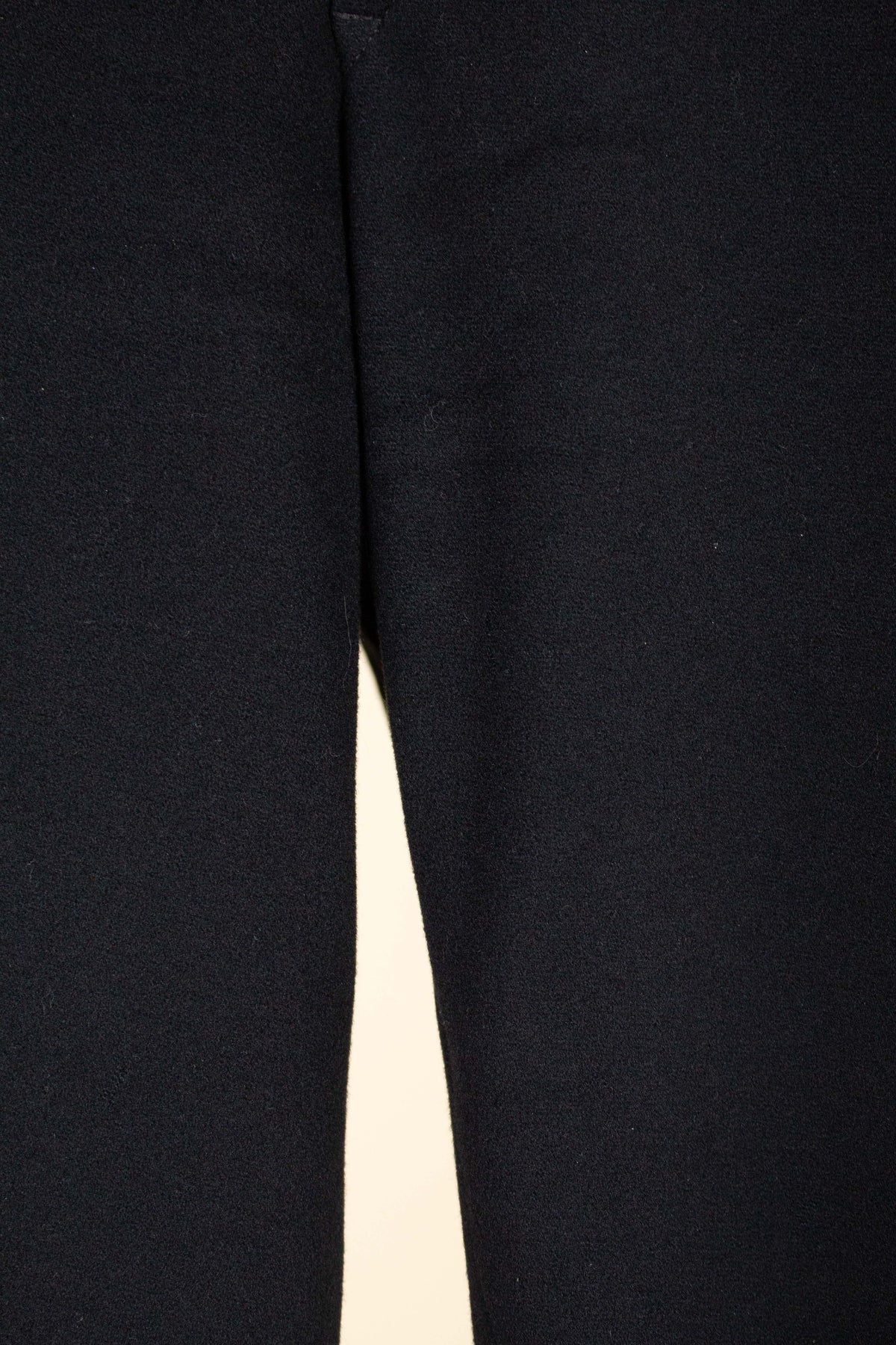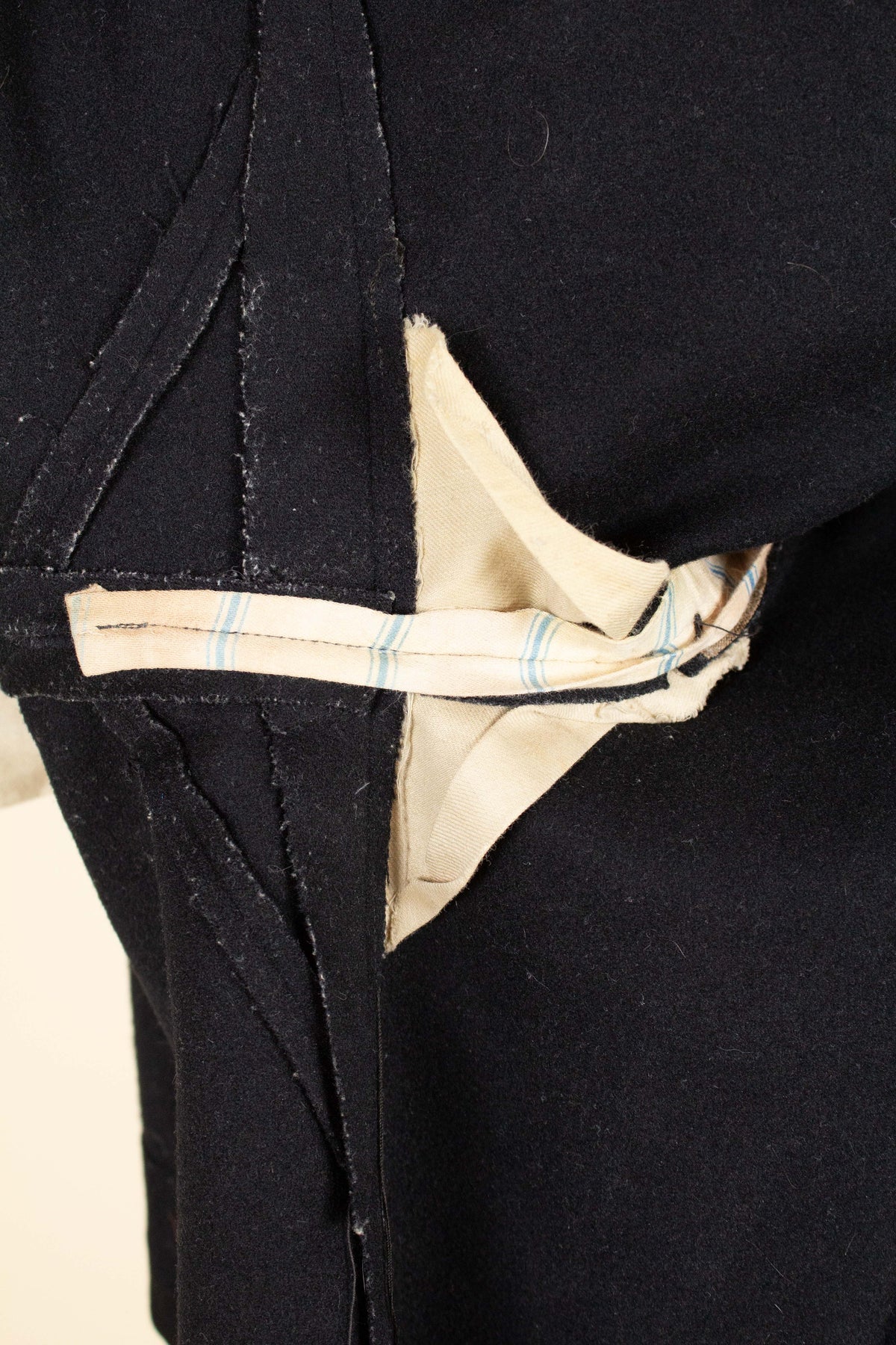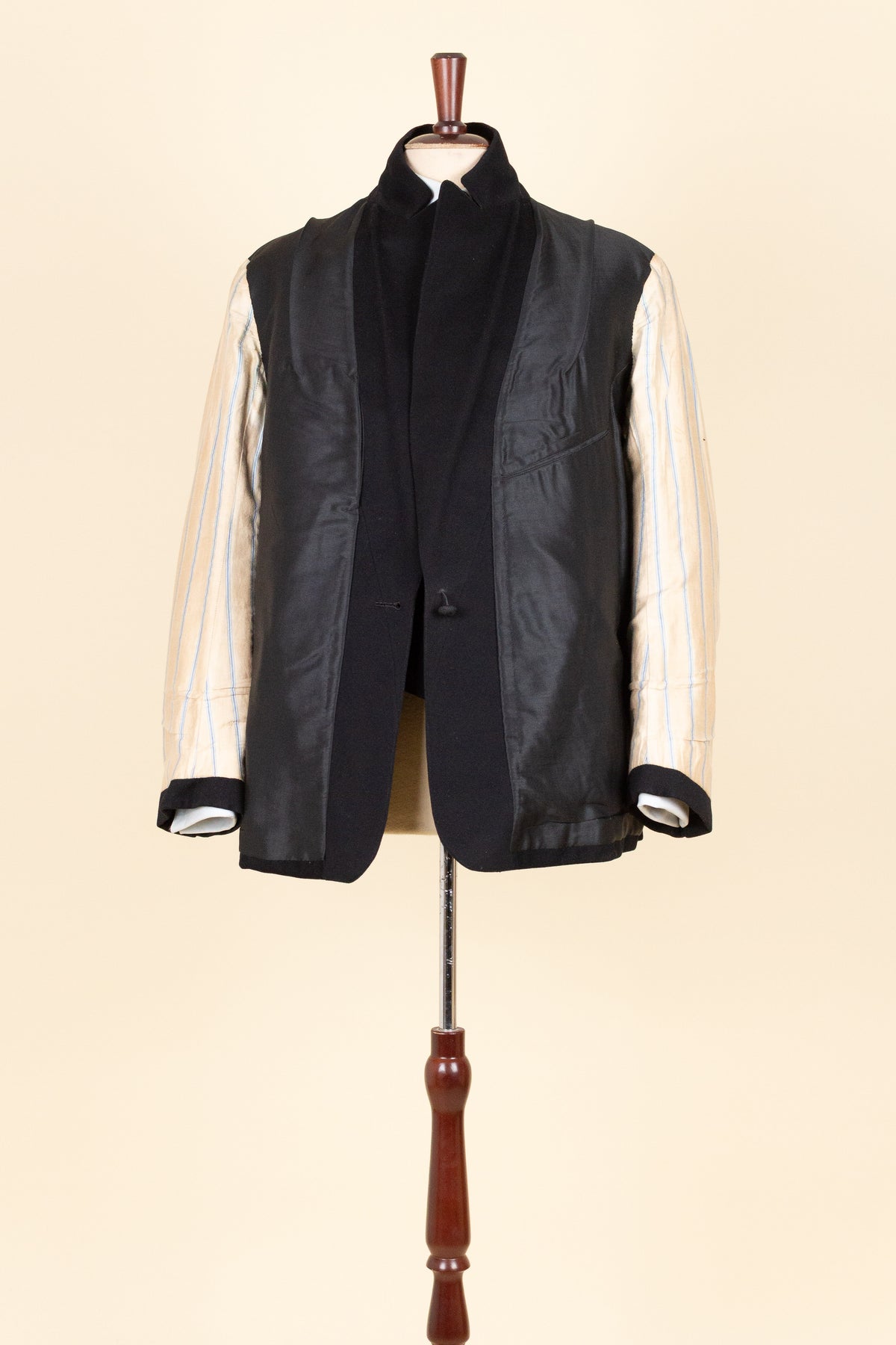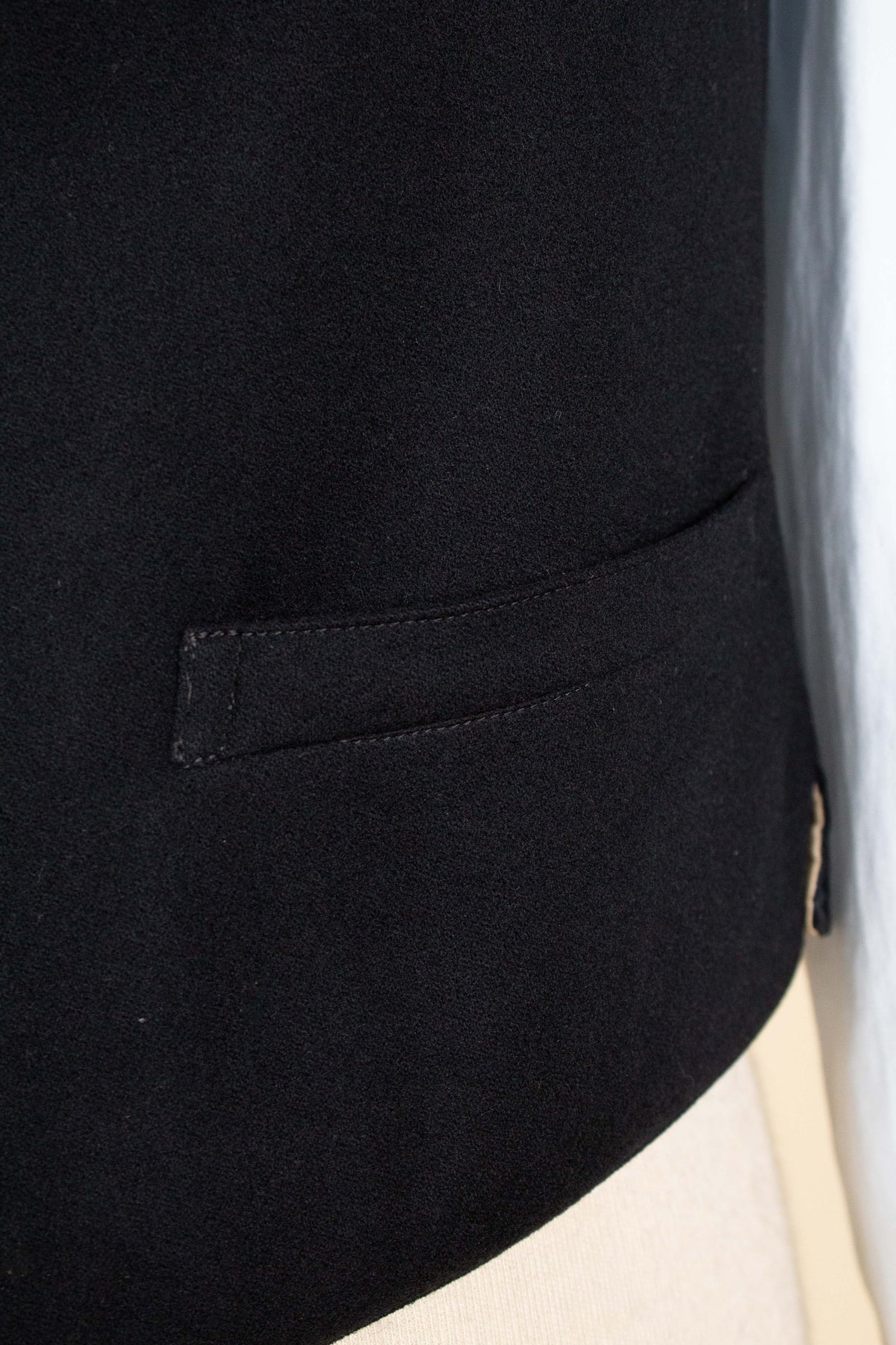 The jacket fastens with a covered button and features horizontal front pockets with flaps. There is a buttonhole on the left lapel. Notably, it lacks a breast pocket—striking by today’s standards, but not uncommon at the time. The sleeve cuffs also have covered buttons. The back is straight and closed, with no vent. Inside, the jacket is fully lined and has a discreet inner pocket on the right side.