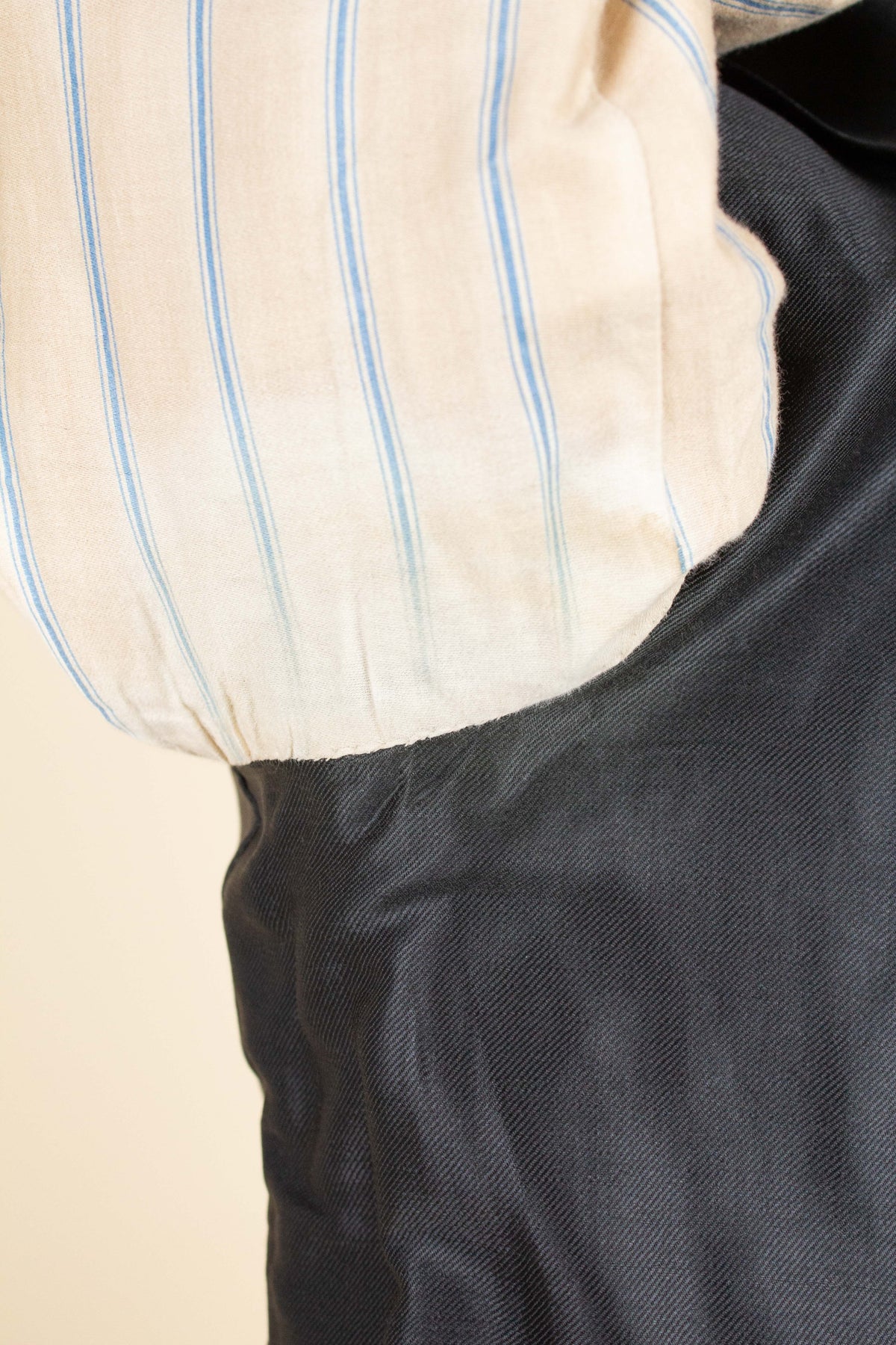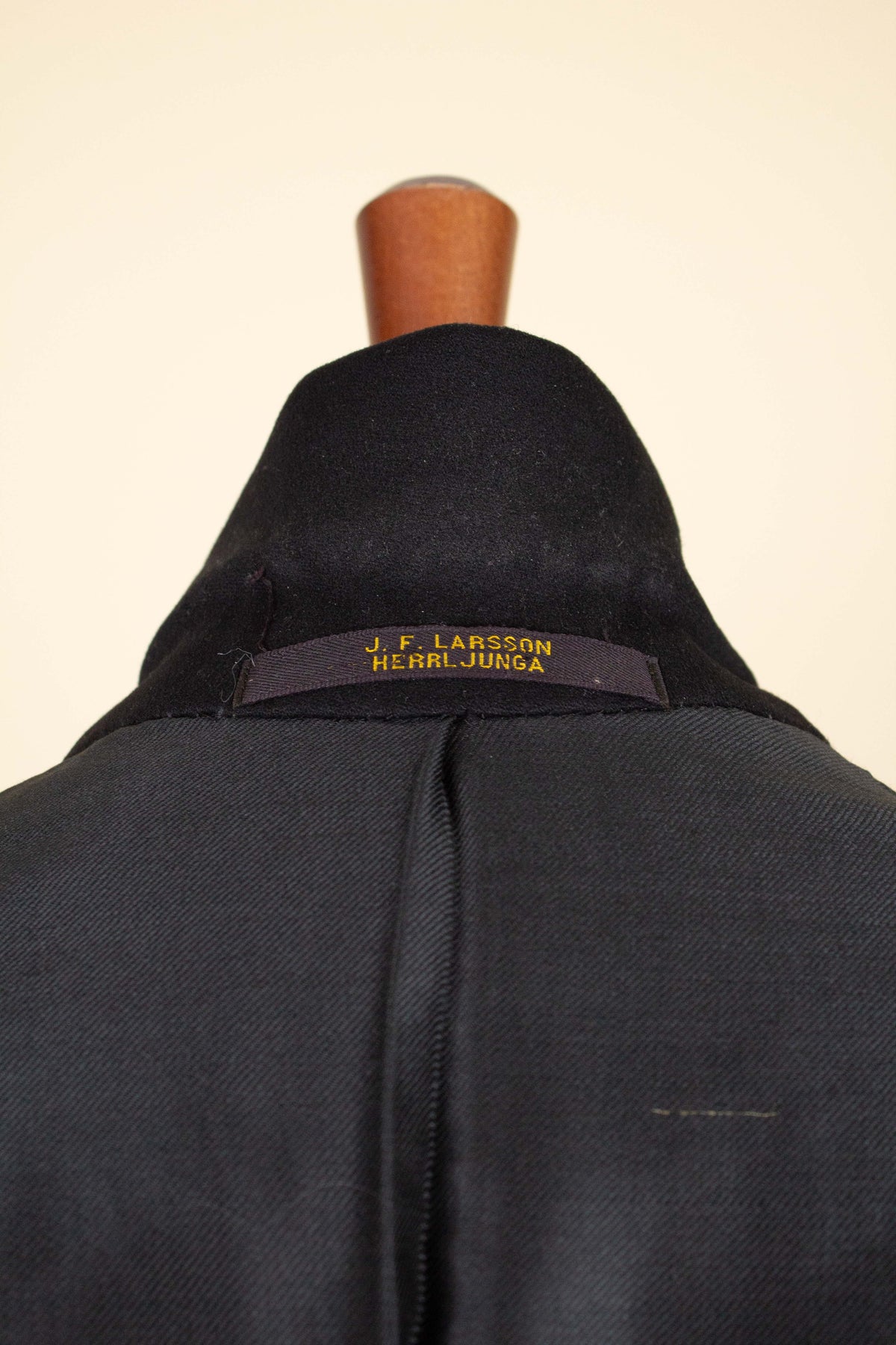 This three-piece suit has no labels in the pockets, but on the hanger at the neck there is a tailor’s name, indicating that it is Swedish and made bespoke. It was most likely made sometime during the 1910s. The suit is crafted from a period-typical heavy black wool fabric.