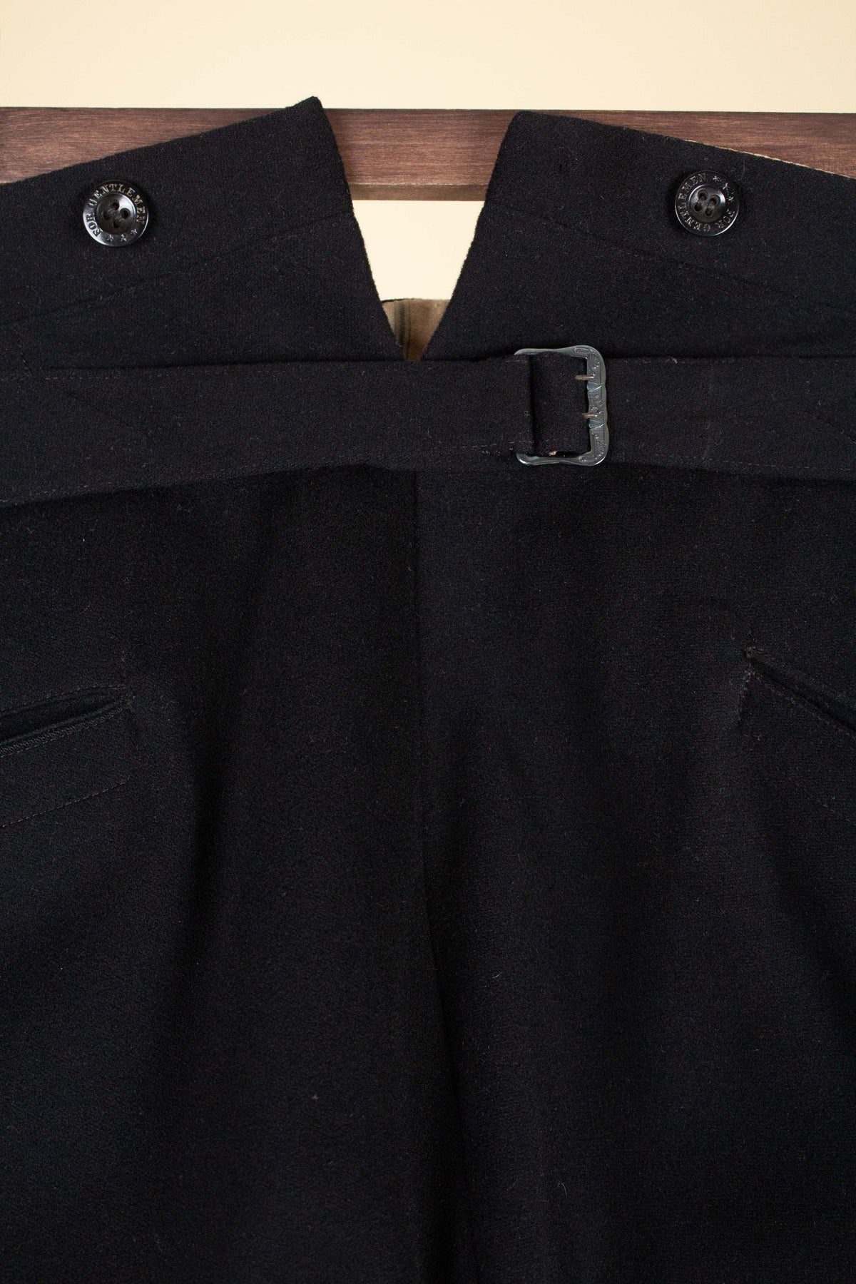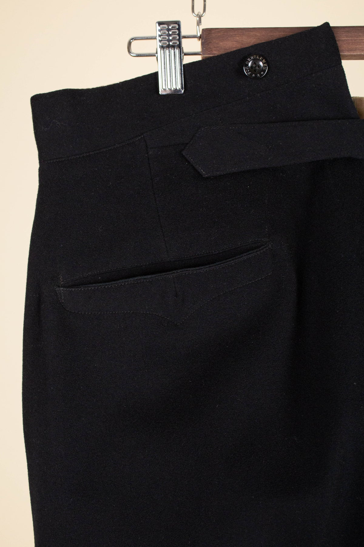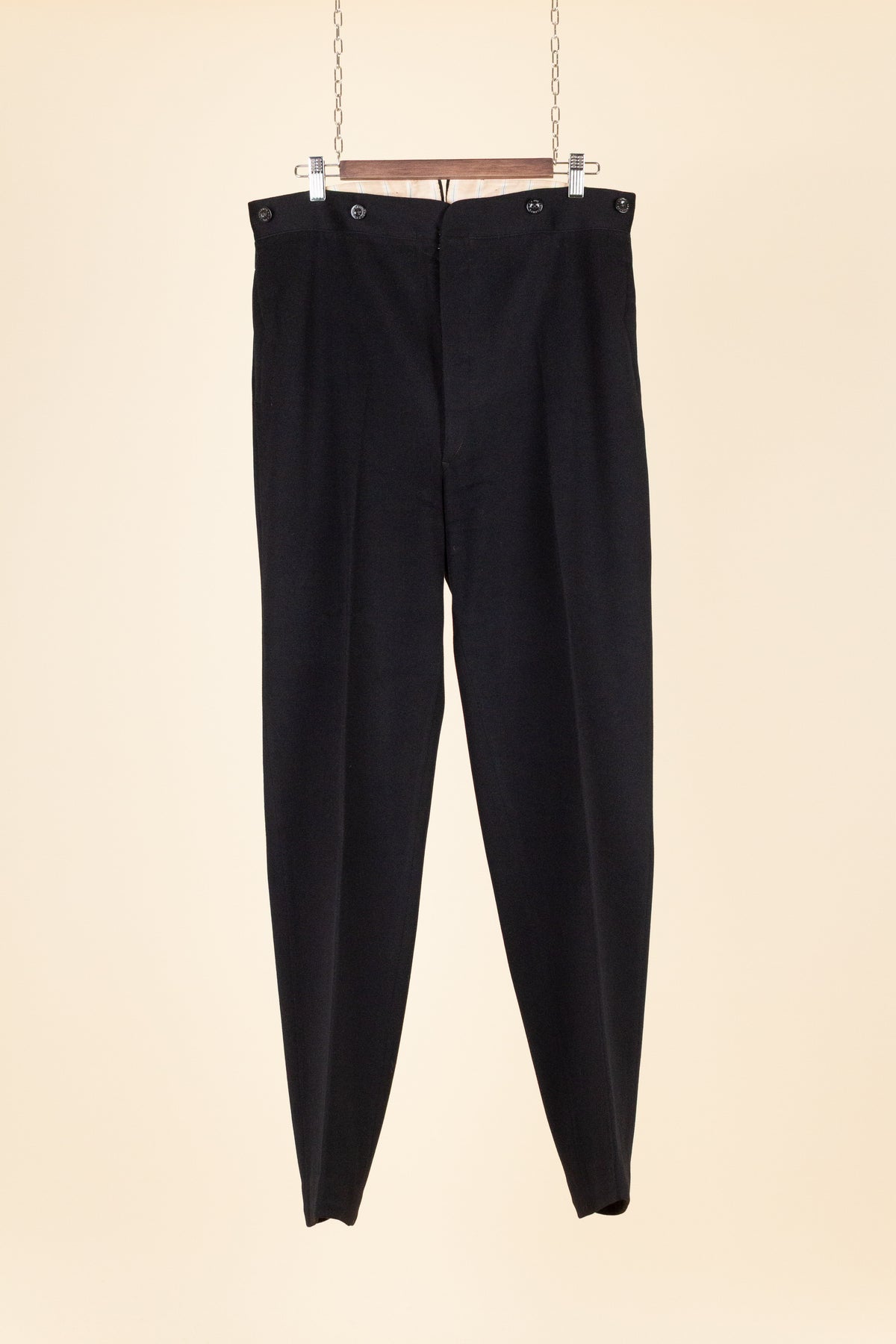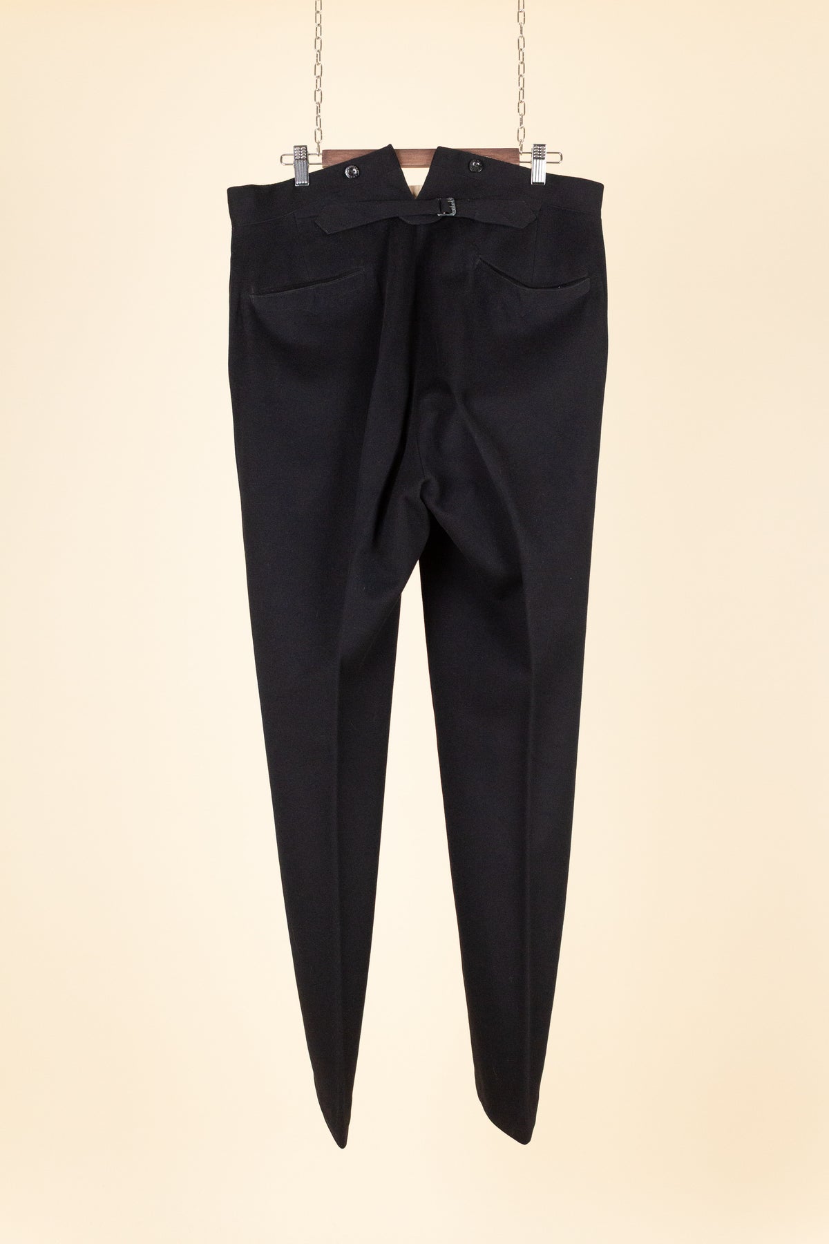 The trousers have a flat front and vertical side seam pockets. They are equipped with buttons for braces on the outside of the waistband and a button fly. At the back, there is a pocket on each side and a central strap to adjust the waist. The trousers feature a so-called fishtail at the back, meaning the back seam is split at the top near the waistband—a standard detail for trousers of this era.