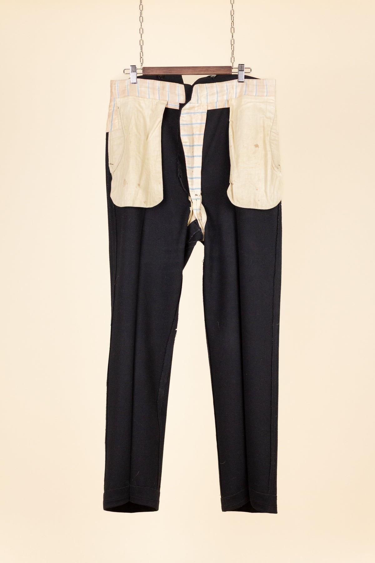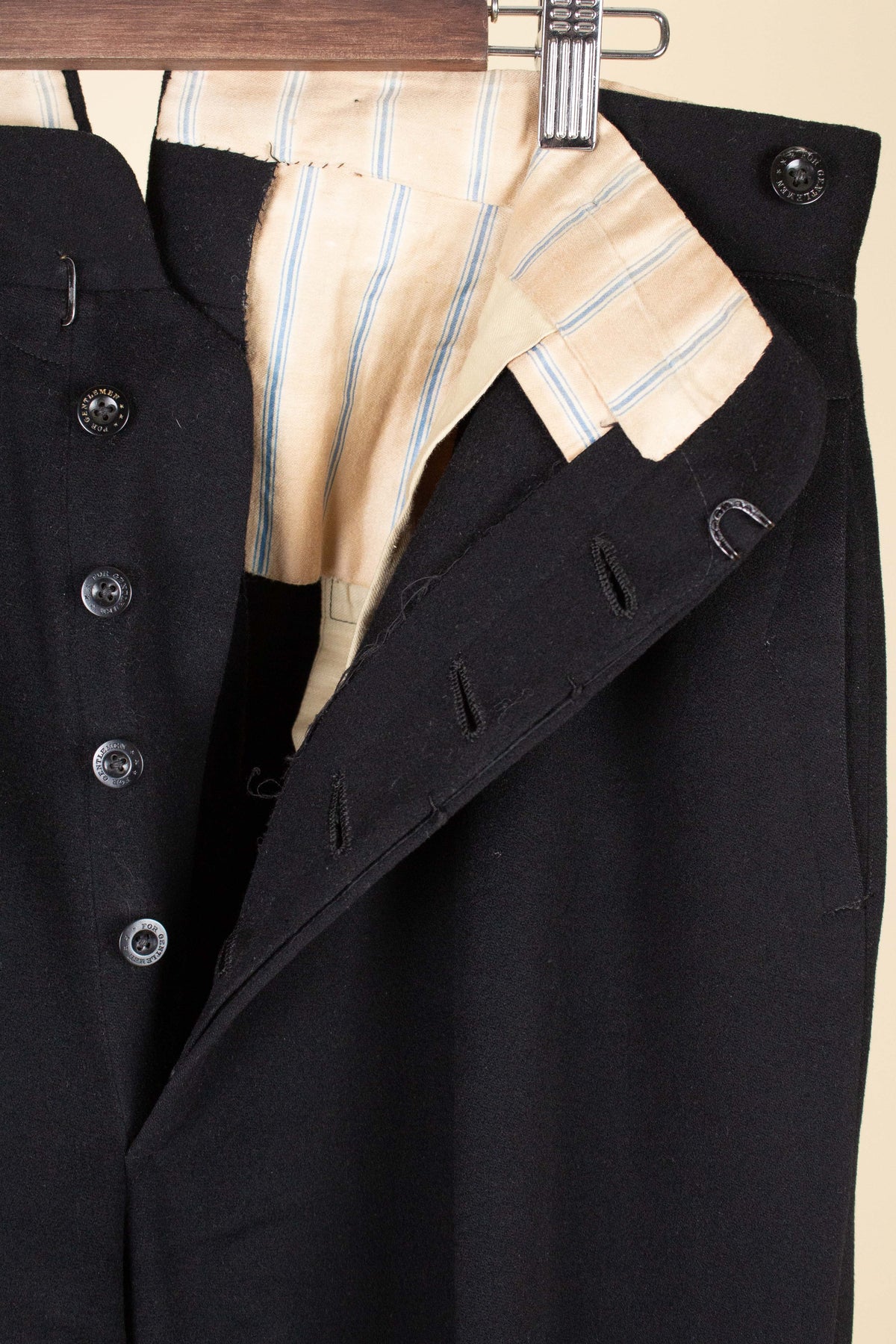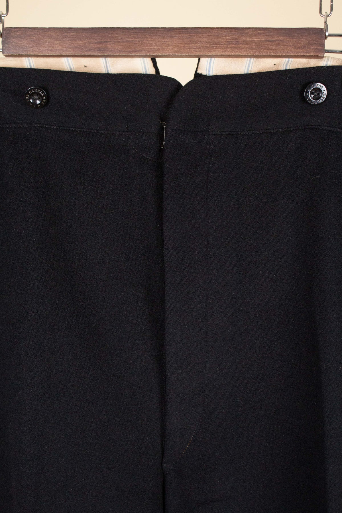 The trousers have a flat front and vertical side seam pockets. They are equipped with buttons for braces on the outside of the waistband and a button fly. At the back, there is a pocket on each side and a central strap to adjust the waist. The trousers feature a so-called fishtail at the back, meaning the back seam is split at the top near the waistband—a standard detail for trousers of this era.