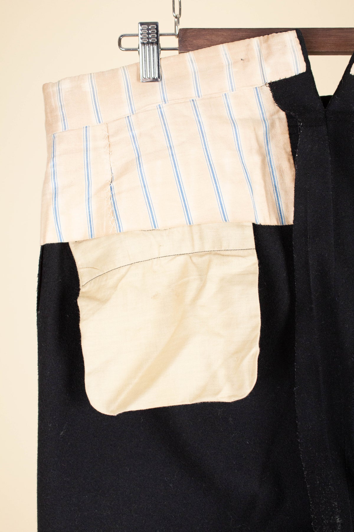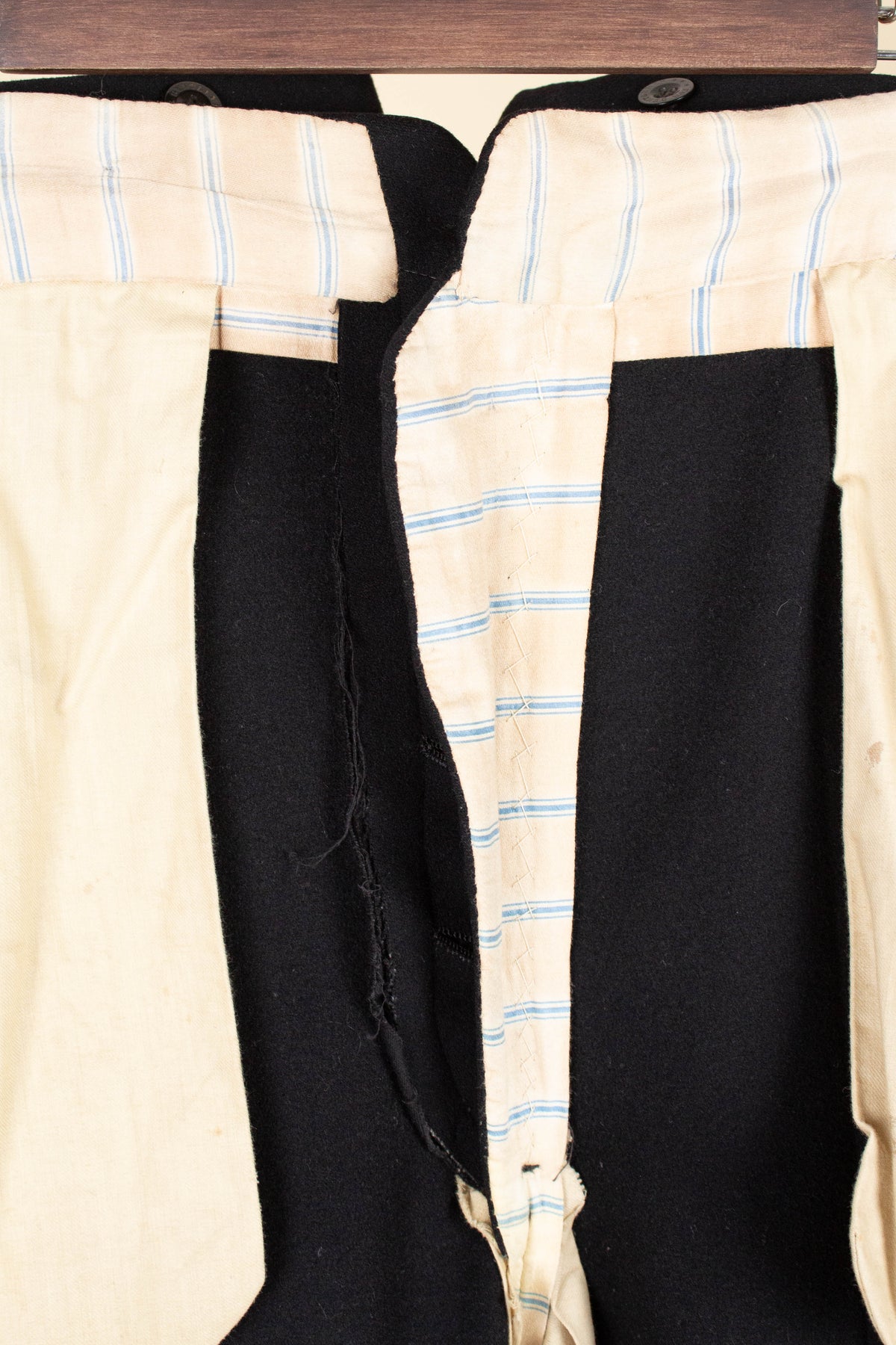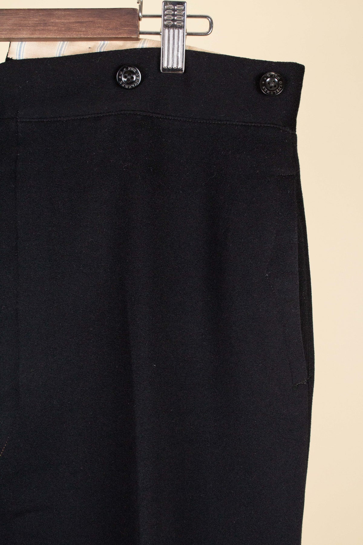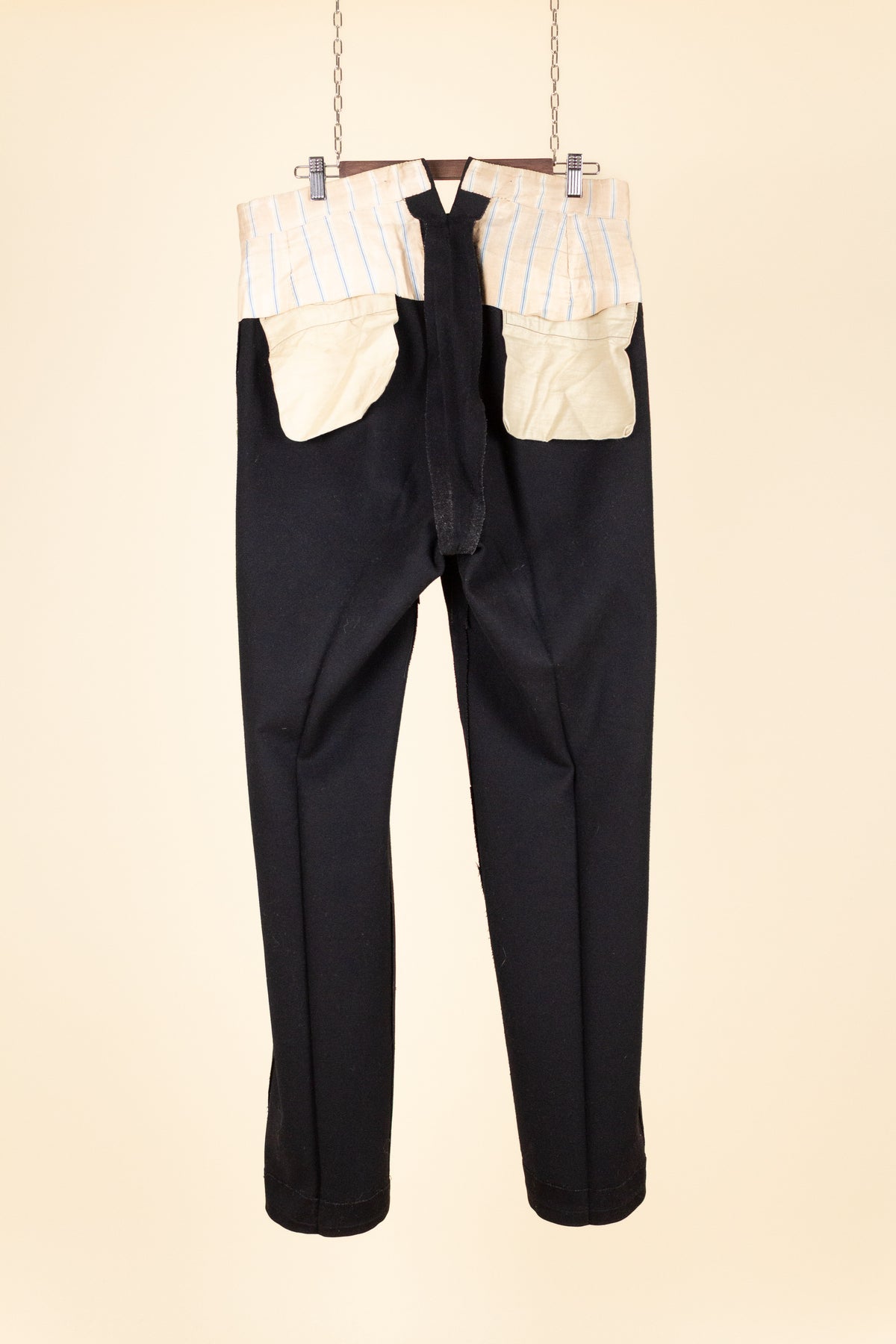 The trousers have a flat front and vertical side seam pockets. They are equipped with buttons for braces on the outside of the waistband and a button fly. At the back, there is a pocket on each side and a central strap to adjust the waist. The trousers feature a so-called fishtail at the back, meaning the back seam is split at the top near the waistband—a standard detail for trousers of this era.