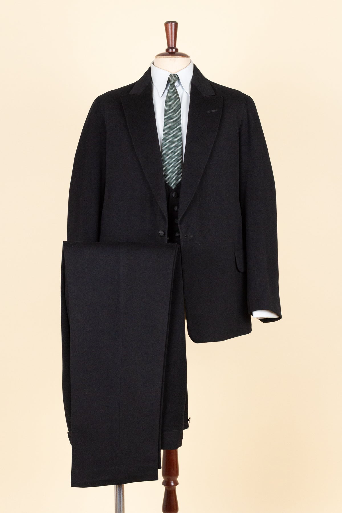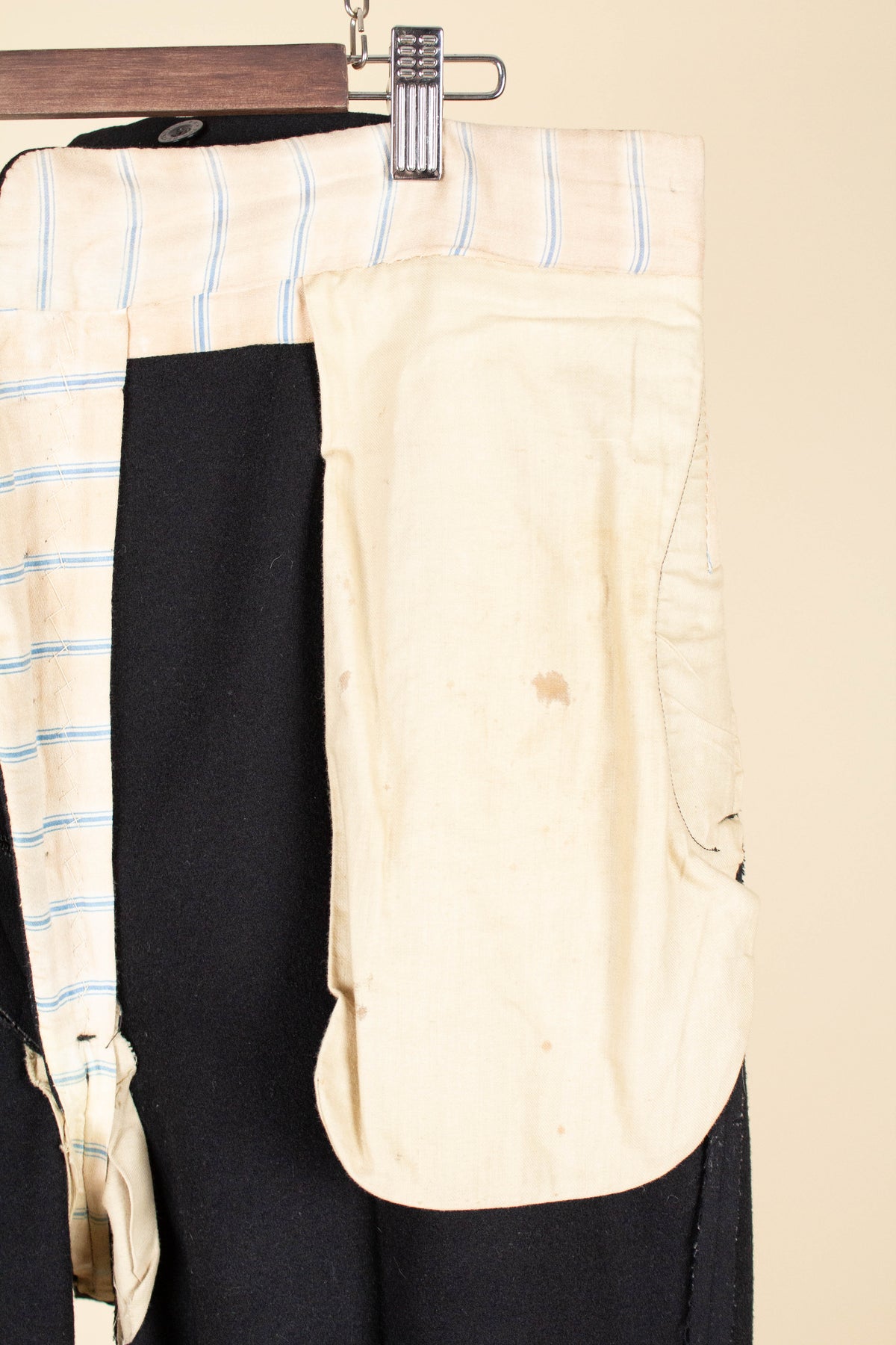 Regarding condition: the overall impression is very good considering that the suit is over 100 years old! Upon closer inspection, however, there are some minor flaws to be aware of if considering a purchase. These mainly involve discoloration of the lining, which is not visible when the suit is worn. There is also a small moth hole on the front of the trousers. Overall, the condition is still remarkable considering the suit’s age. Please study the photos carefully to form your own assessment of the condition.
