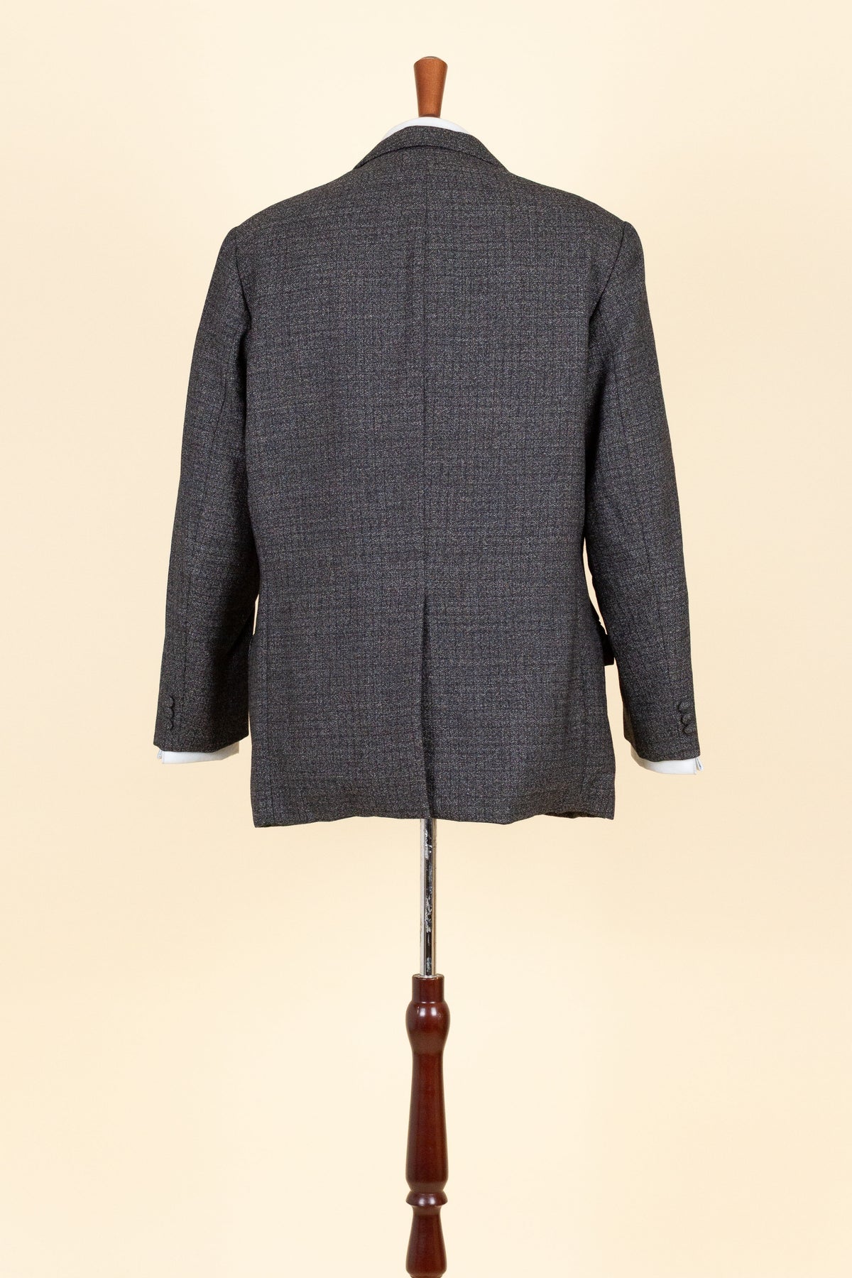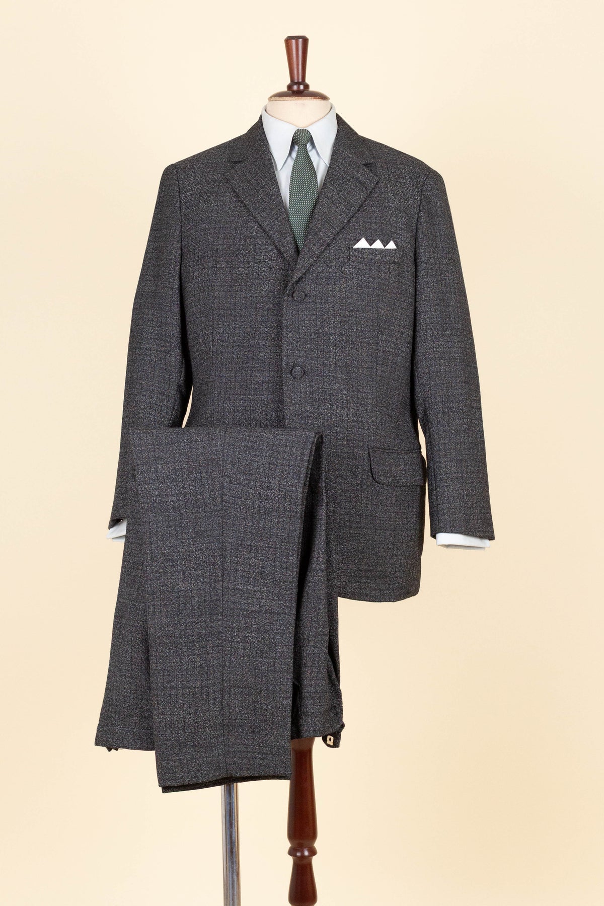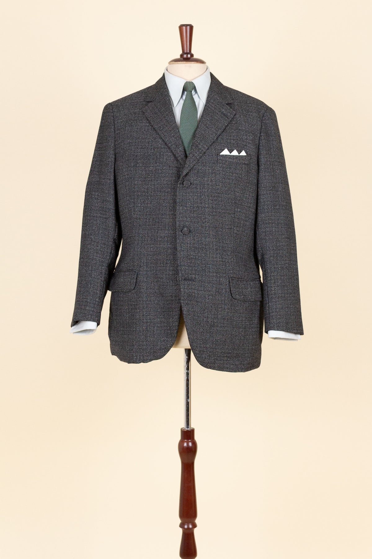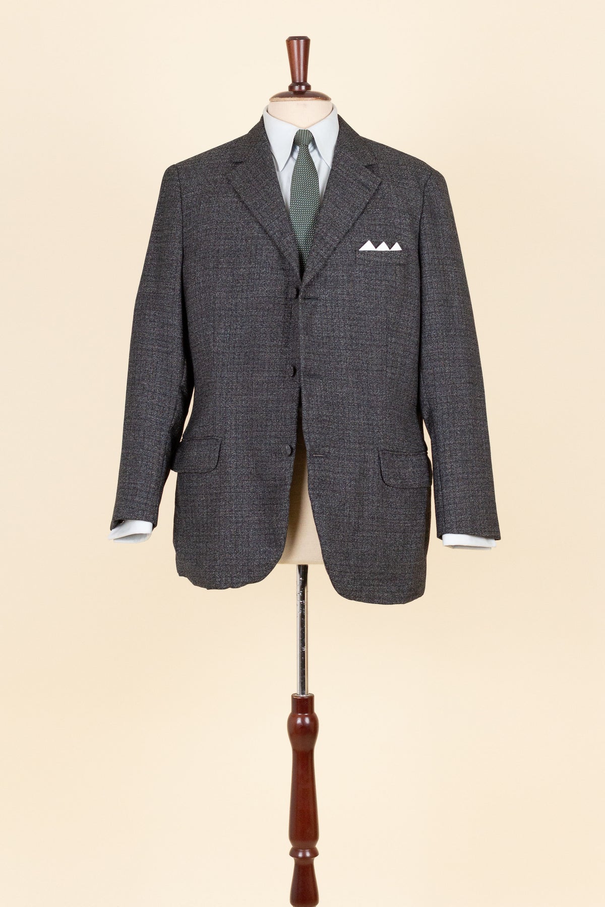 The jacket is single-breasted with a three-button closure. It features covered buttons, a very period-typical detail. The jacket has horizontal front pockets with flaps as well as a breast pocket. There is a buttonhole on the left lapel. The back is straight with a single vent. Inside, the jacket is fully lined and has four interior pockets: one large pocket on each side, plus two smaller pockets on the left side.