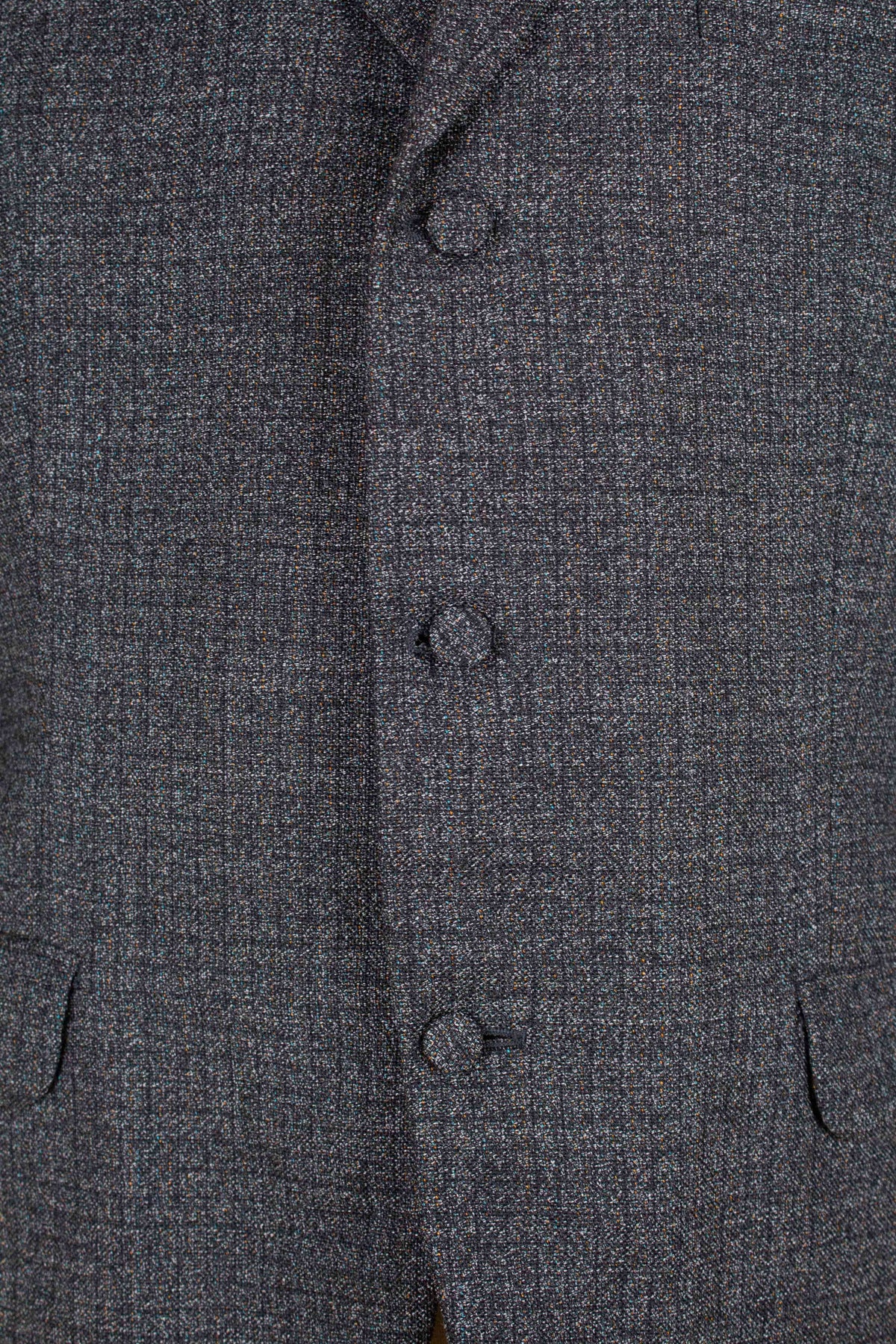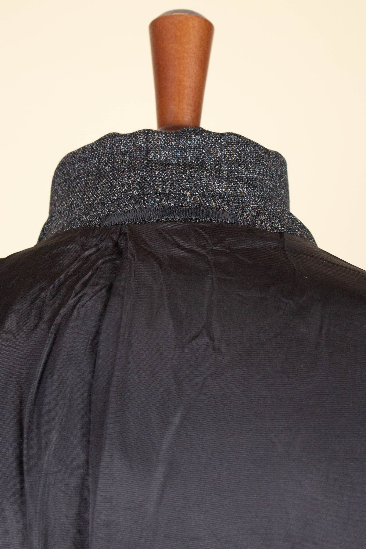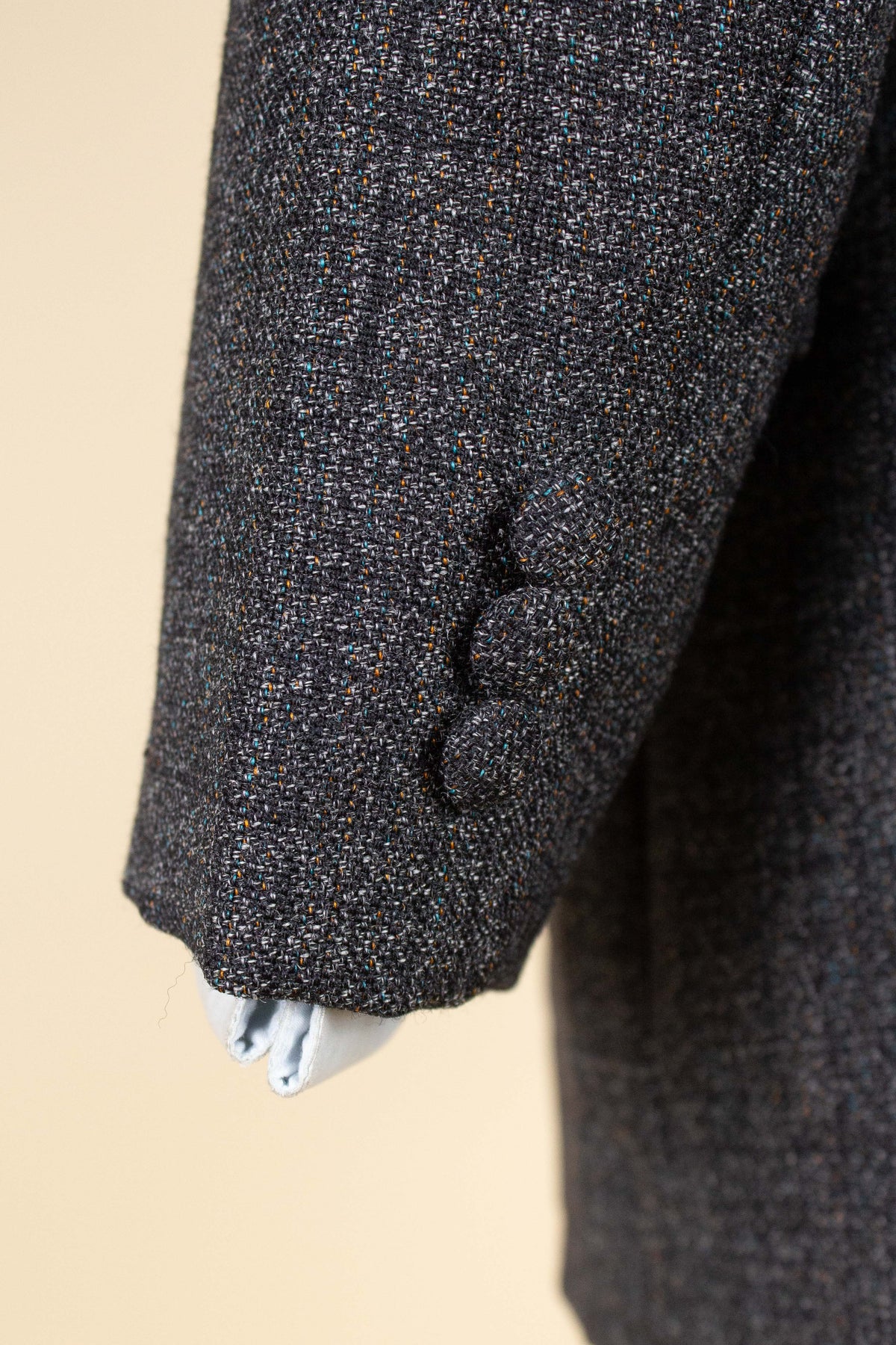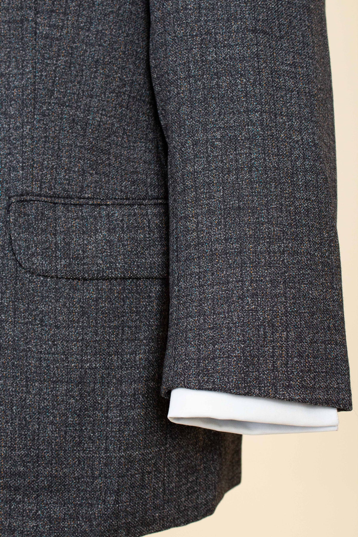 The jacket is single-breasted with a three-button closure. It features covered buttons, a very period-typical detail. The jacket has horizontal front pockets with flaps as well as a breast pocket. There is a buttonhole on the left lapel. The back is straight with a single vent. Inside, the jacket is fully lined and has four interior pockets: one large pocket on each side, plus two smaller pockets on the left side.