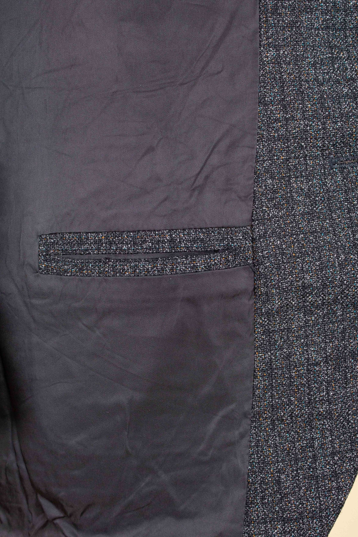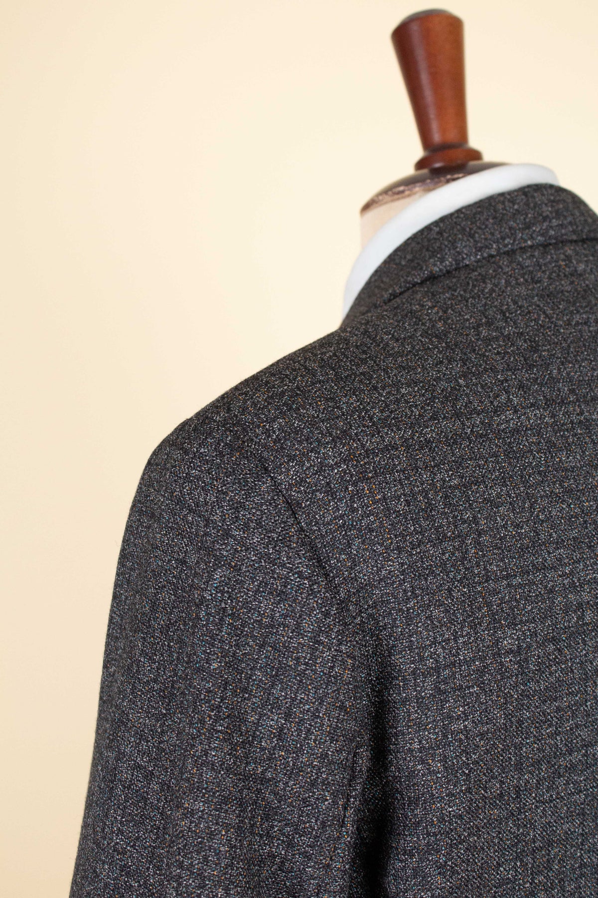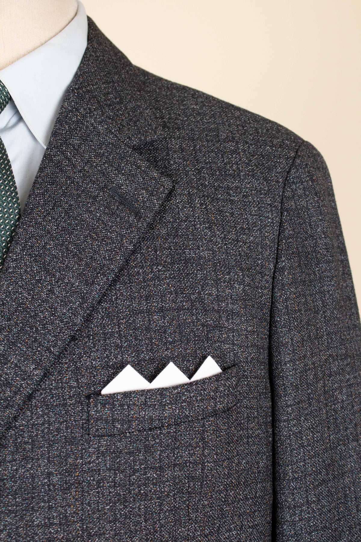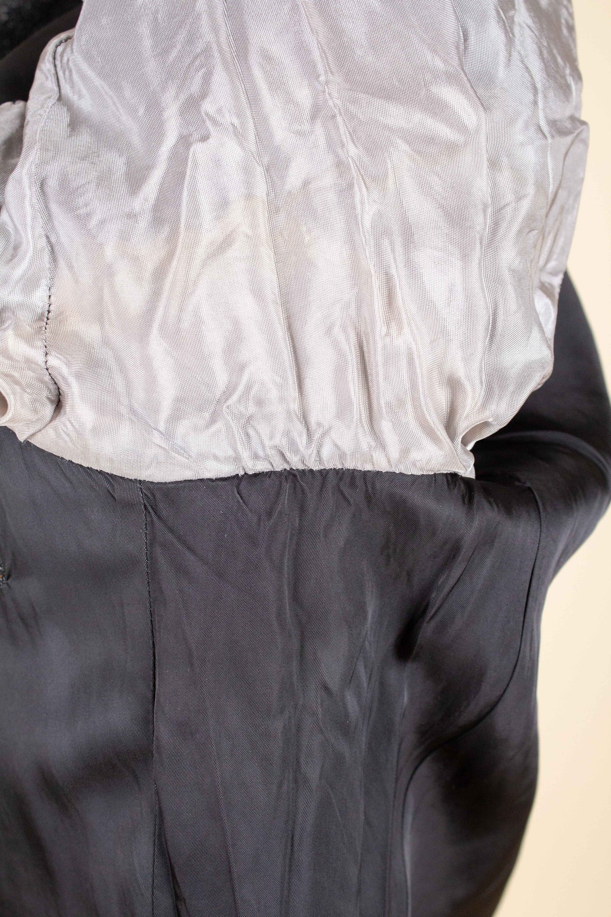 The jacket is single-breasted with a three-button closure. It features covered buttons, a very period-typical detail. The jacket has horizontal front pockets with flaps as well as a breast pocket. There is a buttonhole on the left lapel. The back is straight with a single vent. Inside, the jacket is fully lined and has four interior pockets: one large pocket on each side, plus two smaller pockets on the left side.