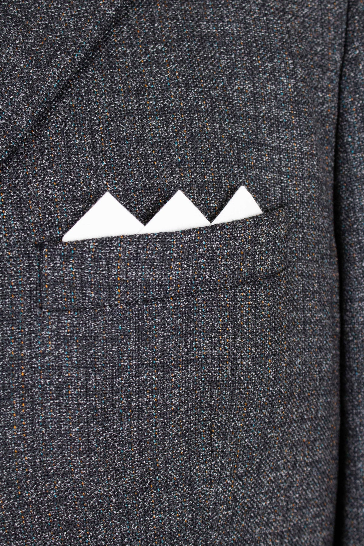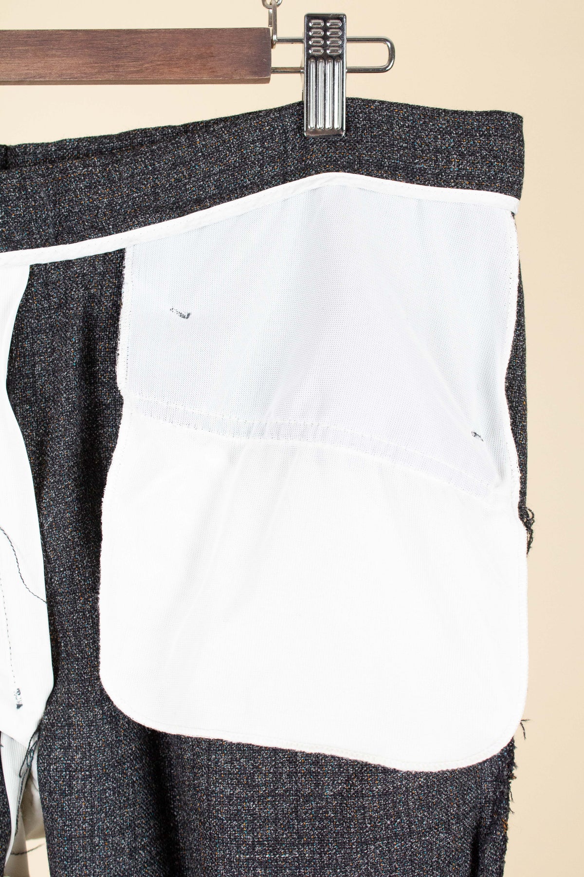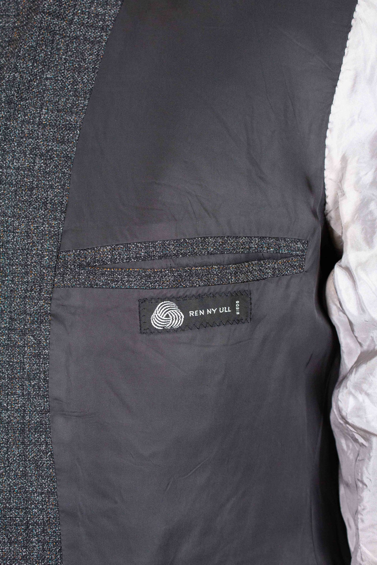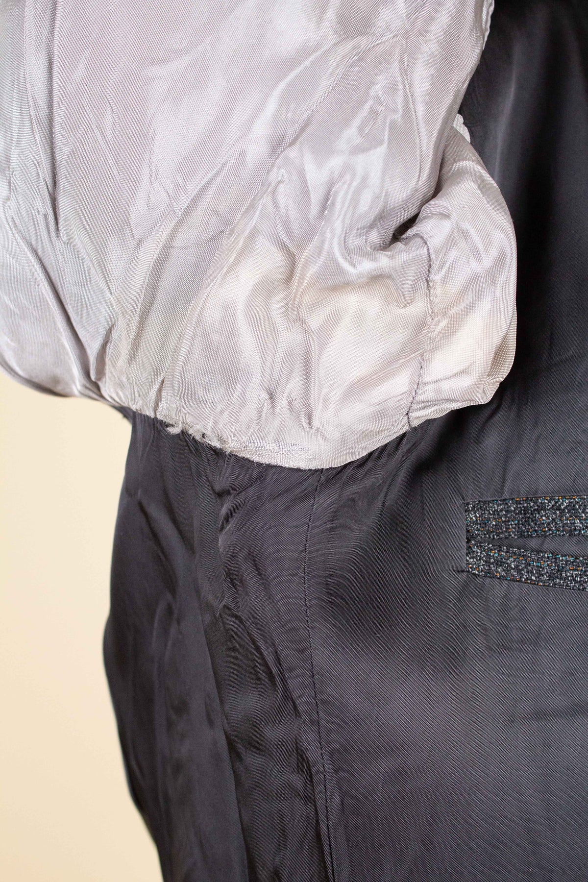 The jacket is single-breasted with a three-button closure. It features covered buttons, a very period-typical detail. The jacket has horizontal front pockets with flaps as well as a breast pocket. There is a buttonhole on the left lapel. The back is straight with a single vent. Inside, the jacket is fully lined and has four interior pockets: one large pocket on each side, plus two smaller pockets on the left side.