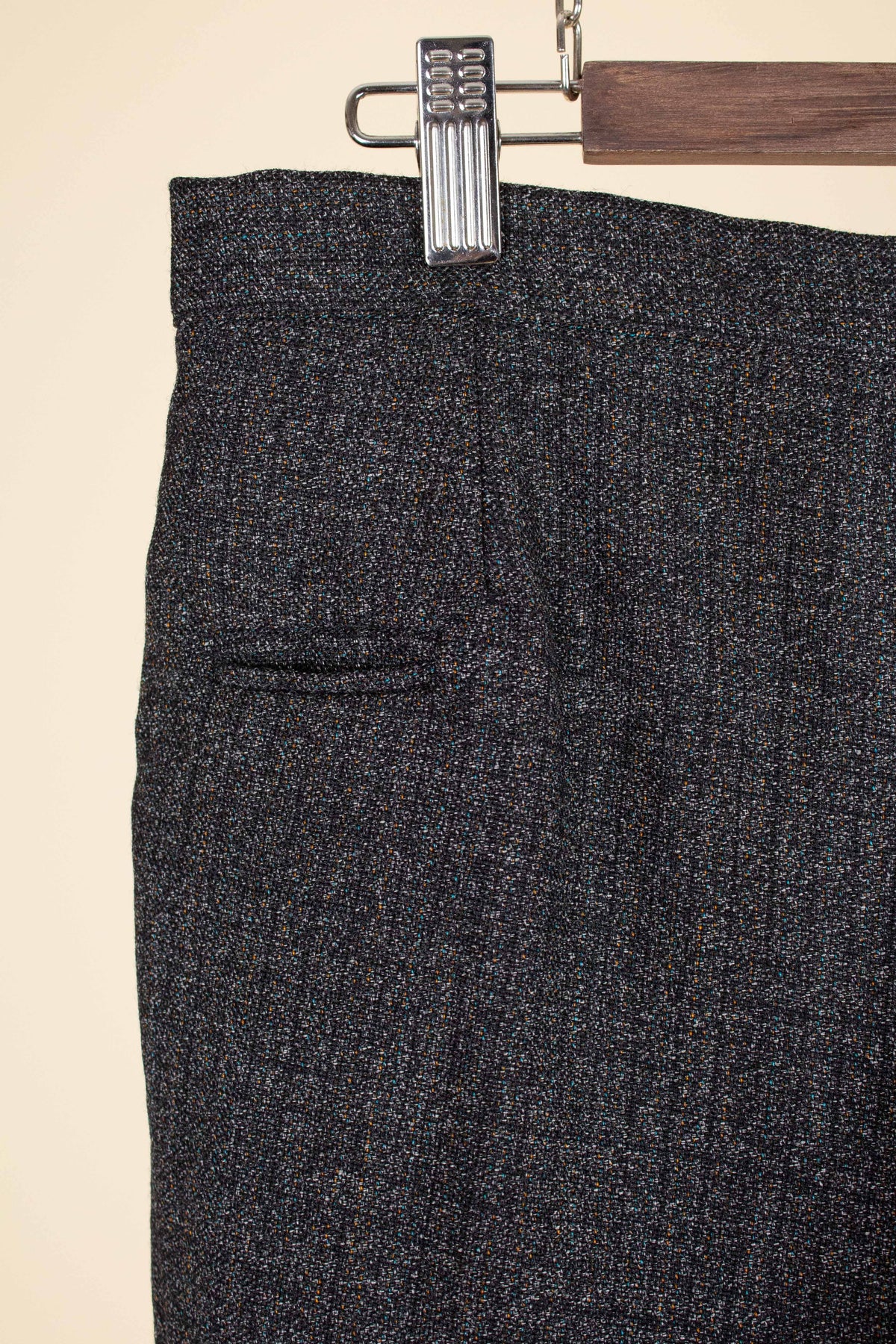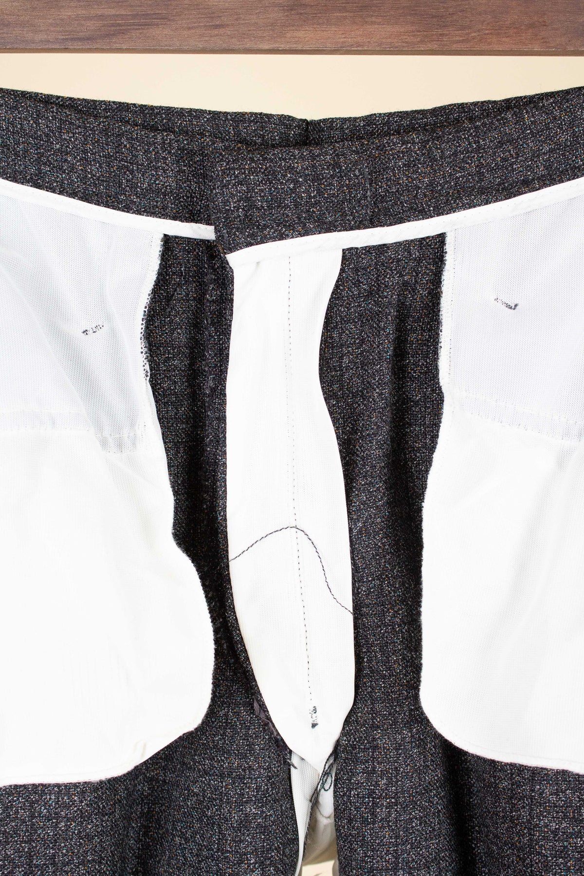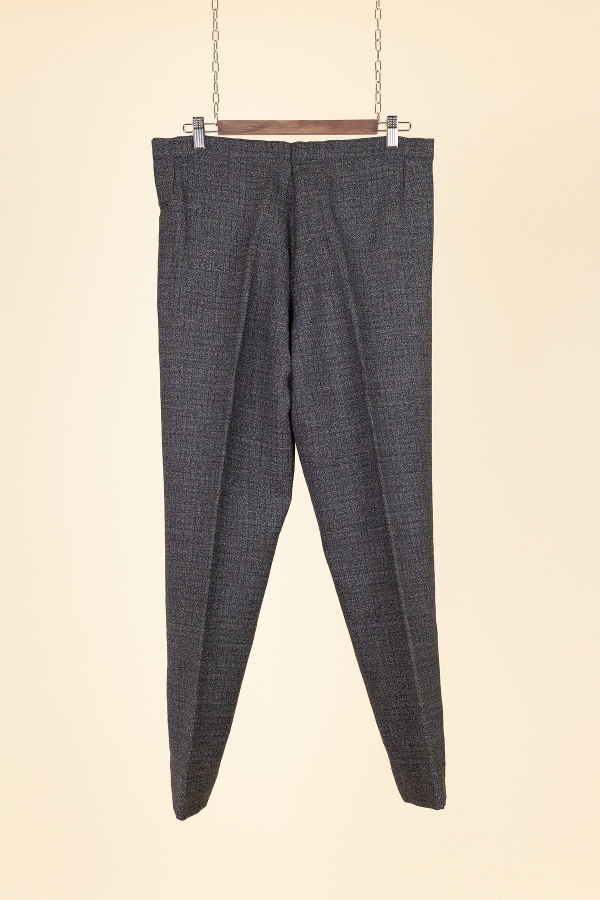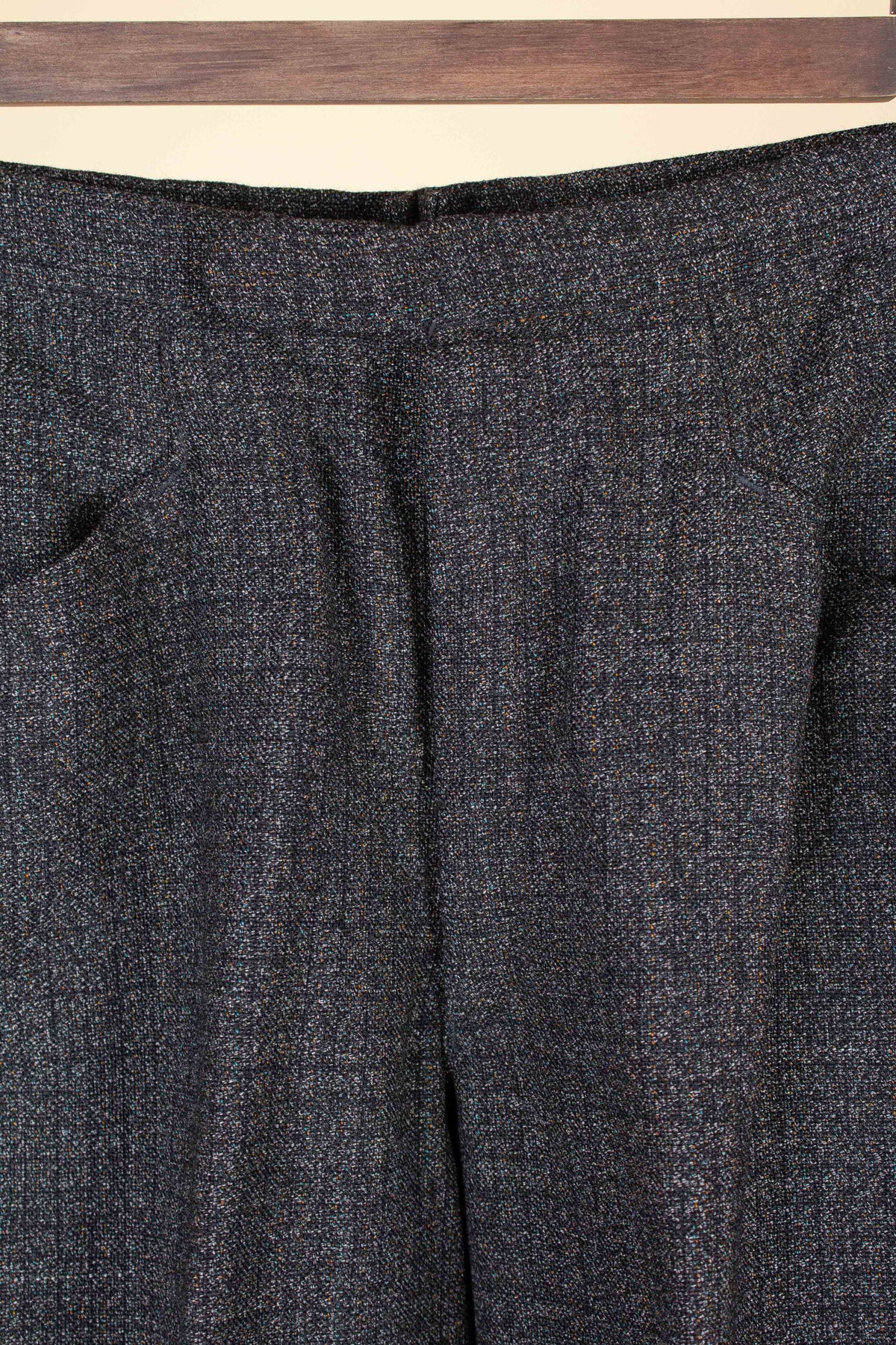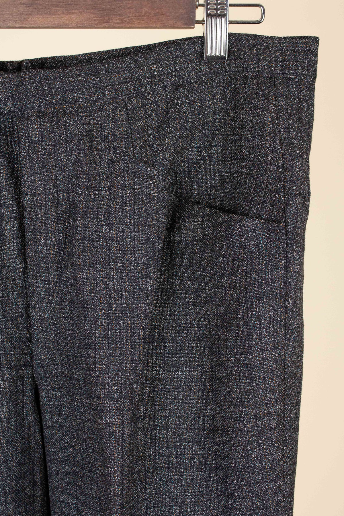 The trousers have rather distinctive front pockets, slightly angled and almost horizontal—a style often seen on riding breeches. They feature a zip fly, and the back is completely plain with no rear pockets.