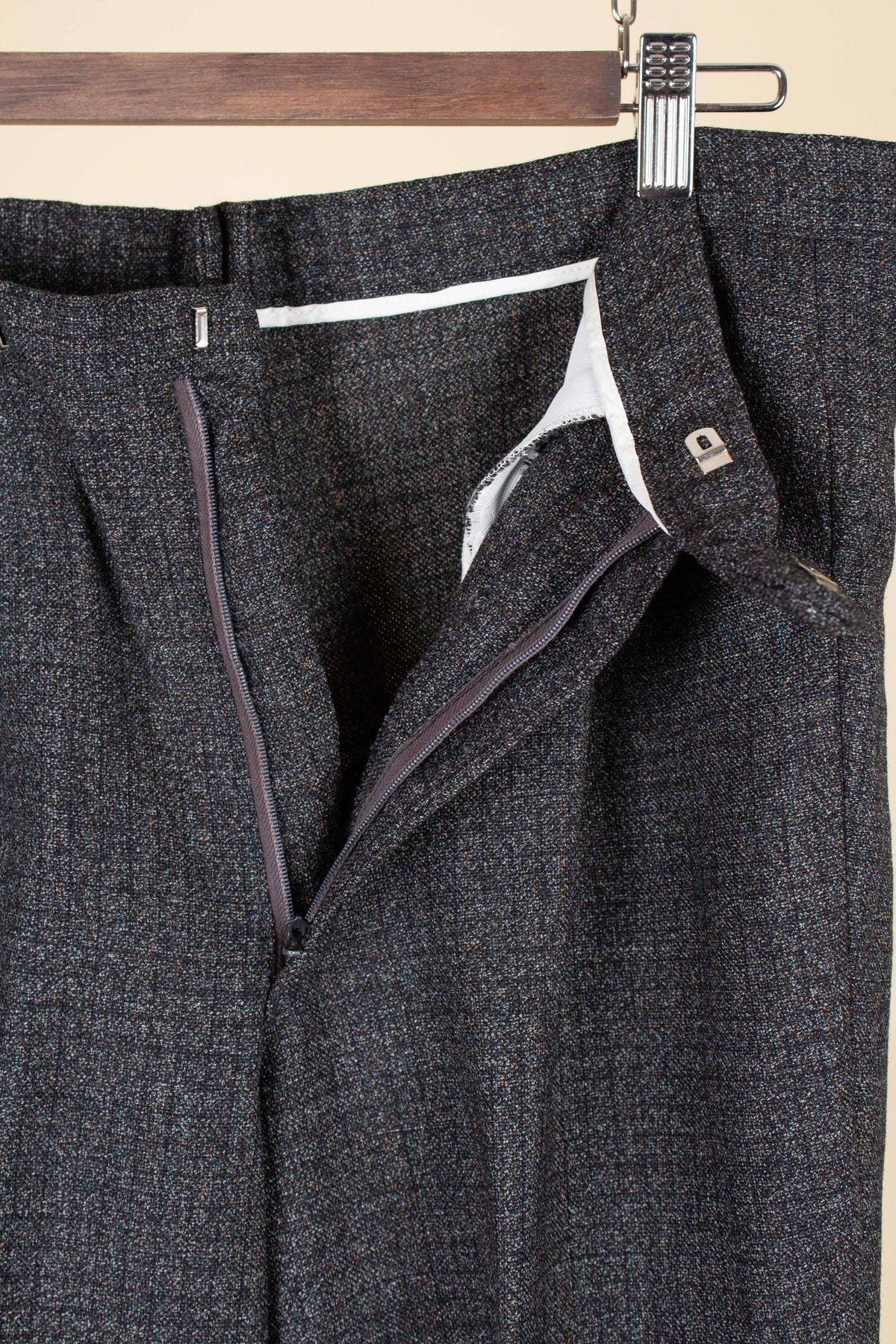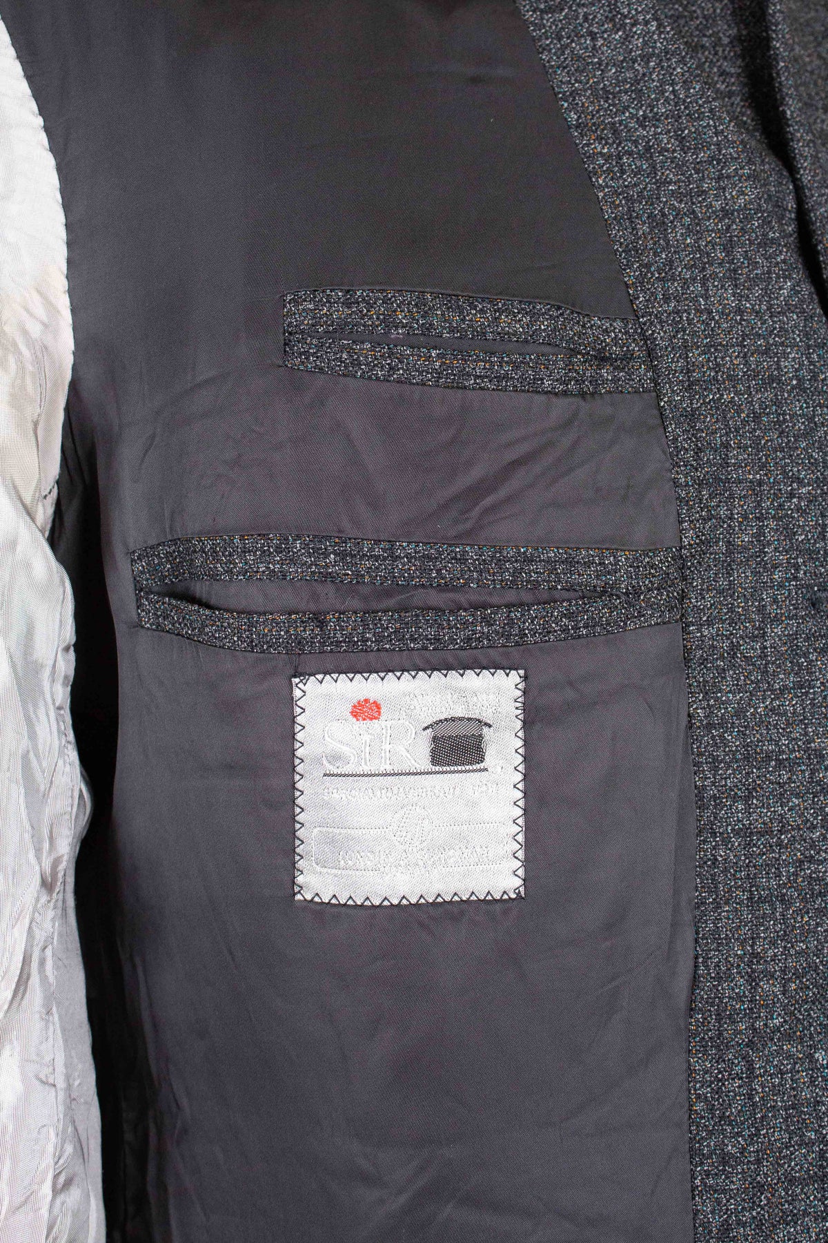 This suit is of Swedish origin and was made during the second half of the 1960s. It is from SIR, a well-known Swedish manufacturer of ready-to-wear garments. The suit is made from a subtly checkered grey mélange wool fabric that reveals multiple colours when examined up close. To the eye, however, it appears as a solid grey.