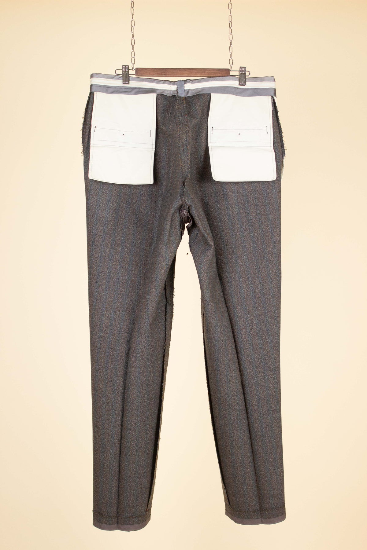 The trousers feature gently slanted front pockets and belt loops at the waistband. They are zip-fly, with one buttoned, piped pocket on each side at the back.