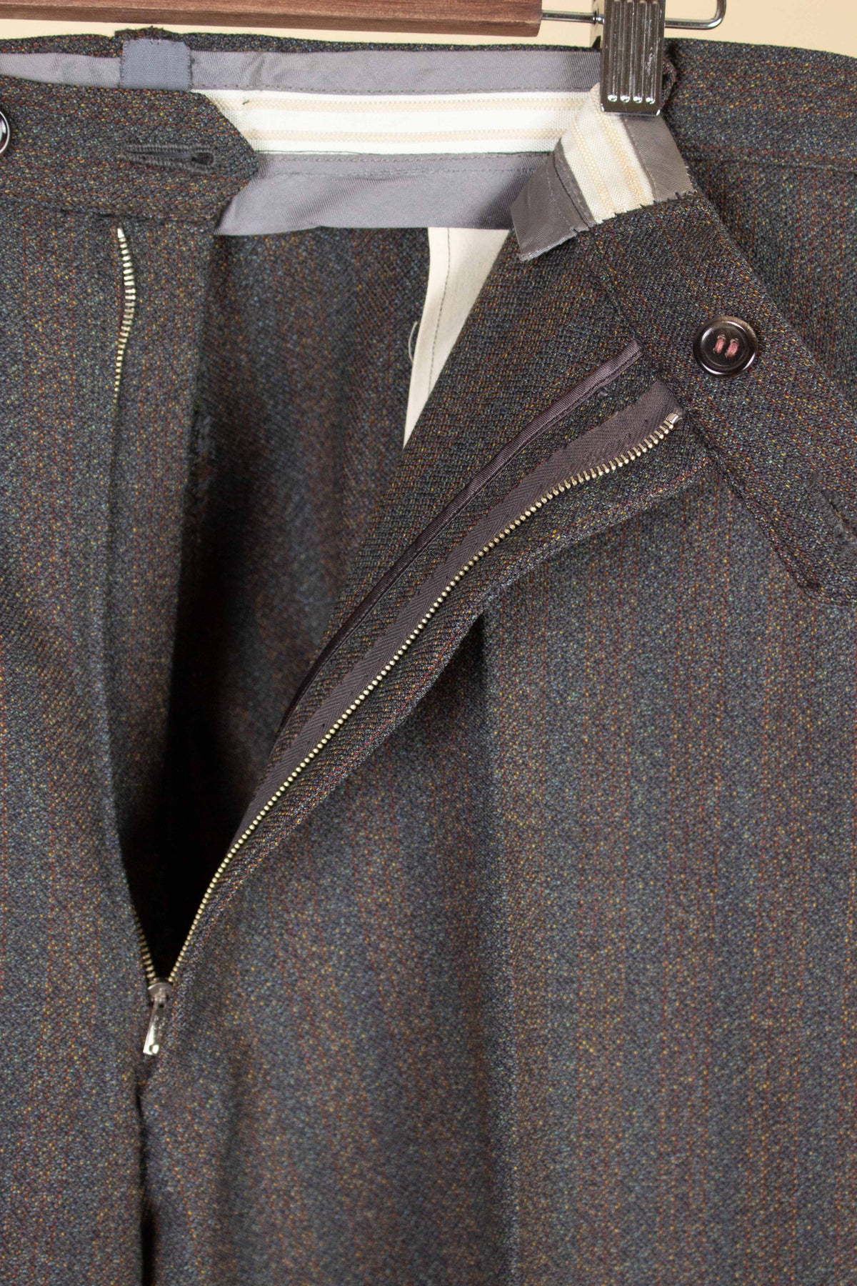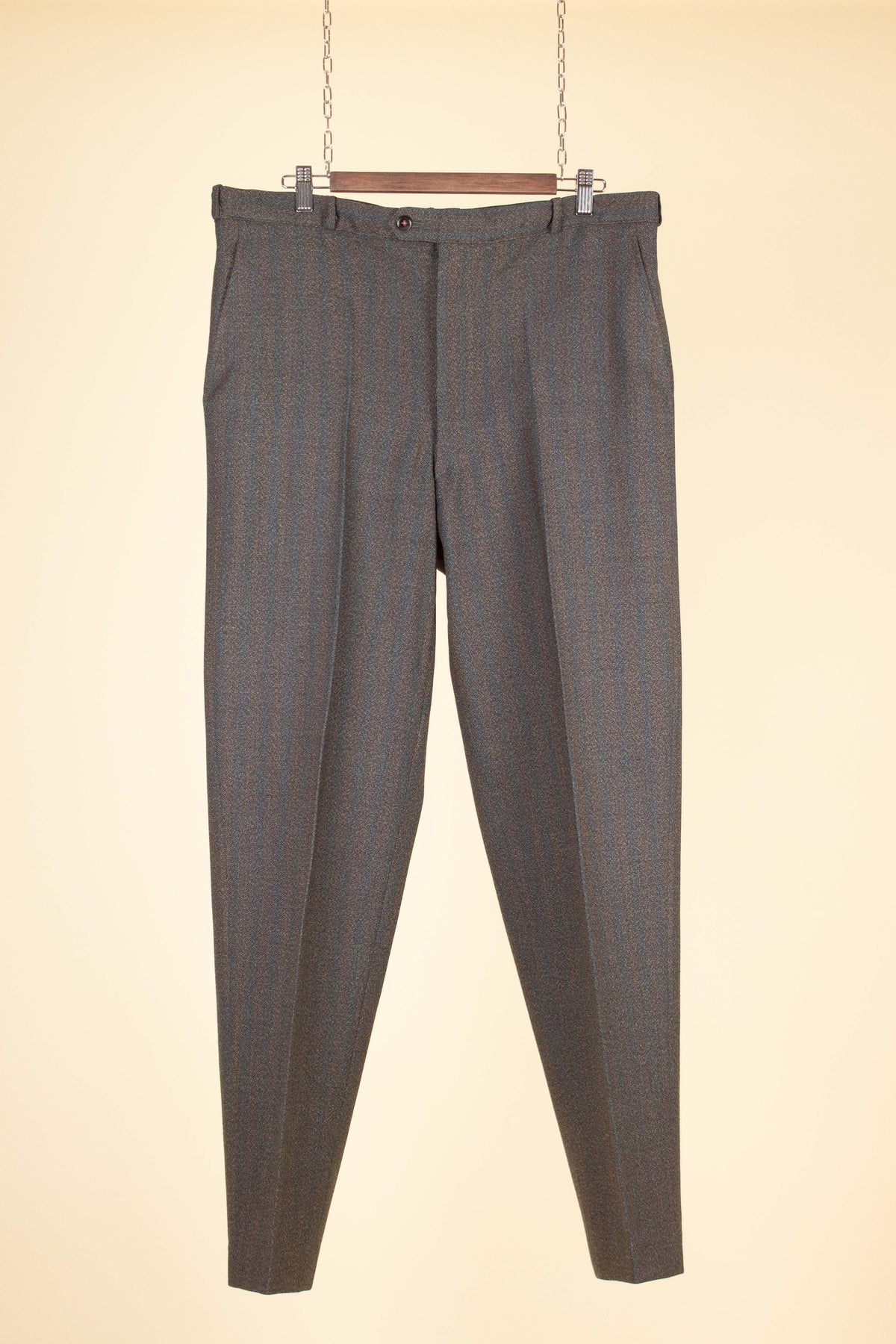 Converted to modern sizing, this suit falls between an EU 52 (UK/US 42) and EU 54 (UK/US 44). The trousers are relatively generous in fit, but there is no extra fabric to let out in either length or waist, so it's important to ensure the size is suitable as-is. Please scroll down for exact measurements and seam allowances.