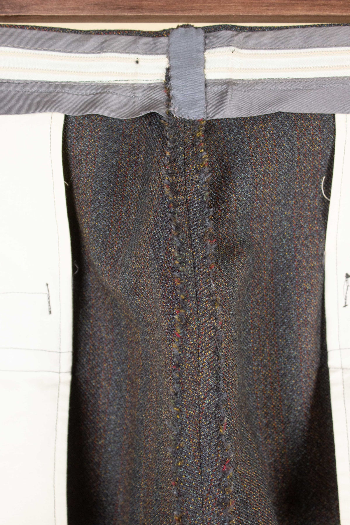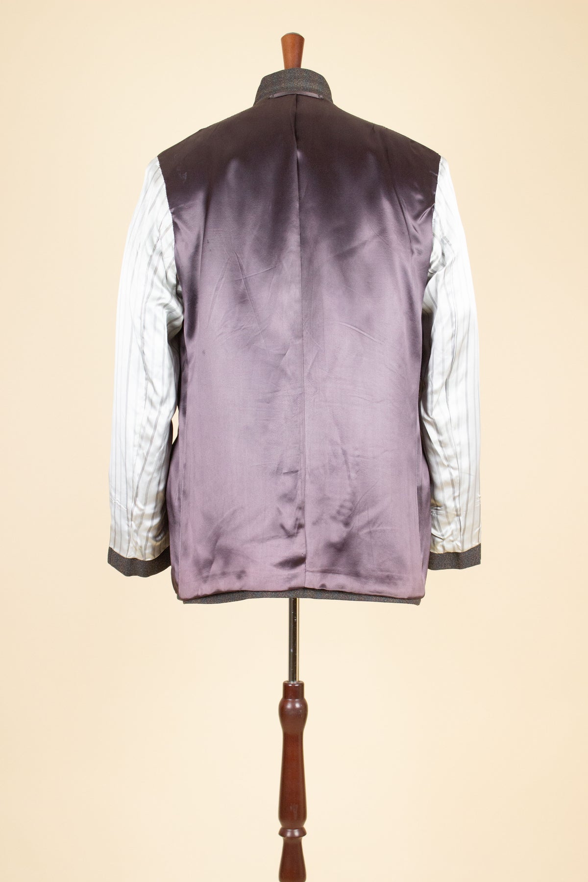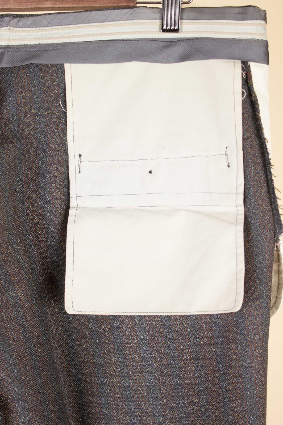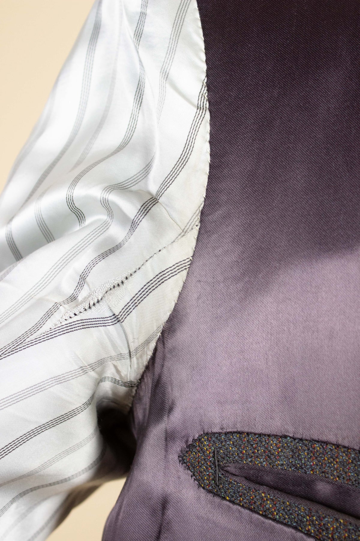 The jacket is single-breasted with a three-button fastening. It has horizontal front flap pockets and a breast pocket. There is a buttonhole on the left lapel. The back is straight and closed – it does not have a vent. The interior reveals fine craftsmanship; in fact, it's primarily the inside that leads us to believe the suit is bespoke. It is fully lined, with well-constructed piped interior pockets on both sides.