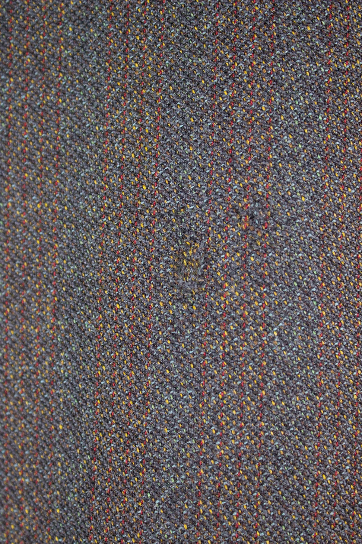 The fabric features threads of red, yellow, blue, and brown – but the overall impression is a brownish-green. It has a subtle wide striping that remains visible even from a distance.