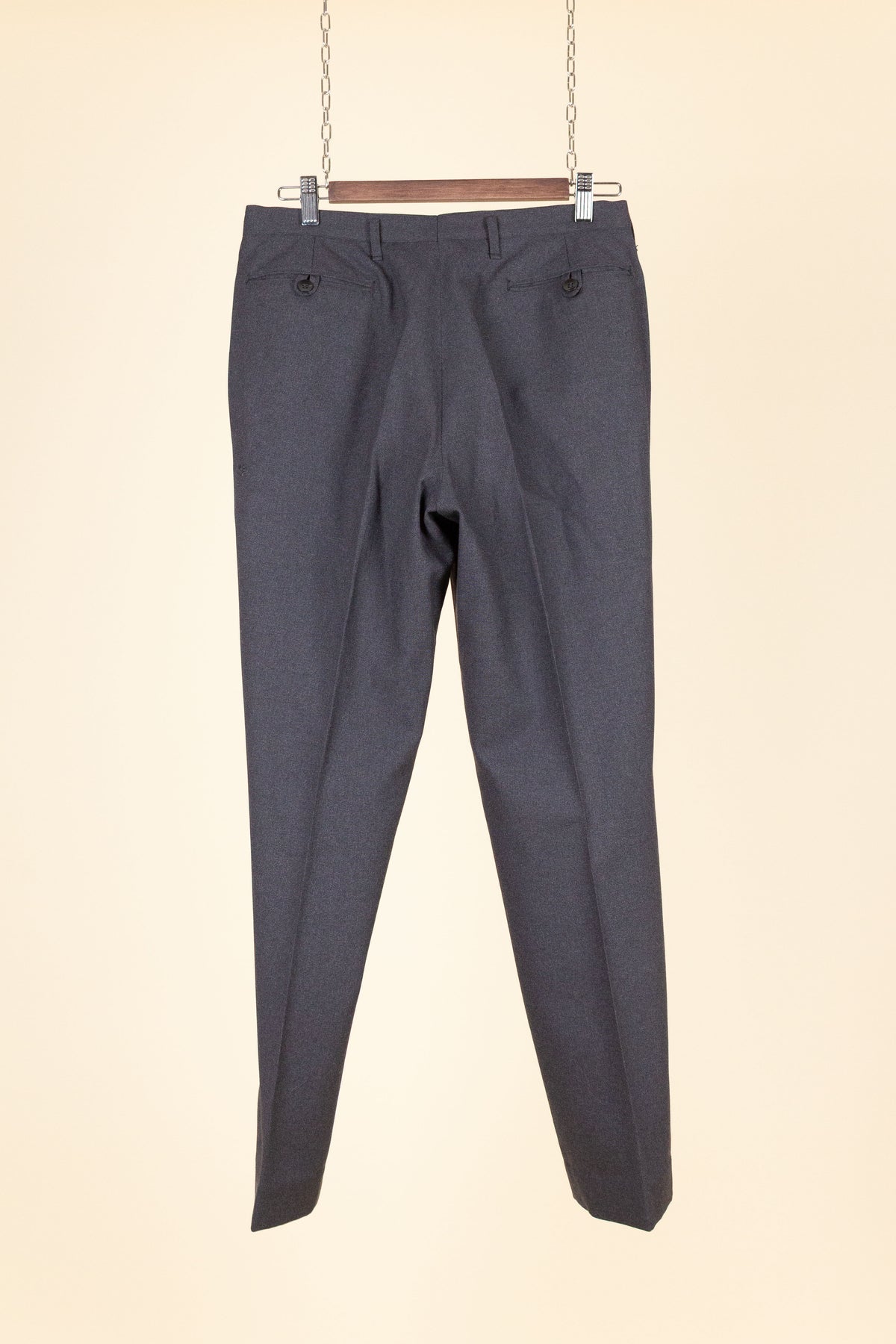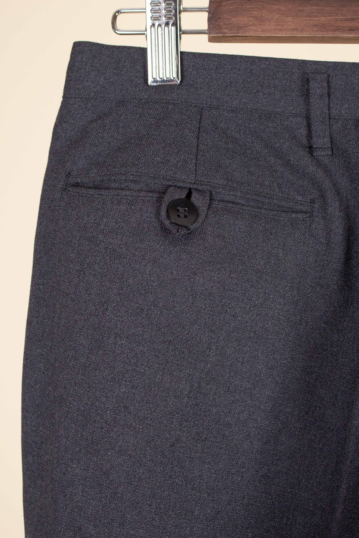 The trousers have a crease down the front, slightly angled front pockets, a zip fly, and belt loops. At the back, there are two welted pockets, both secured with buttons.