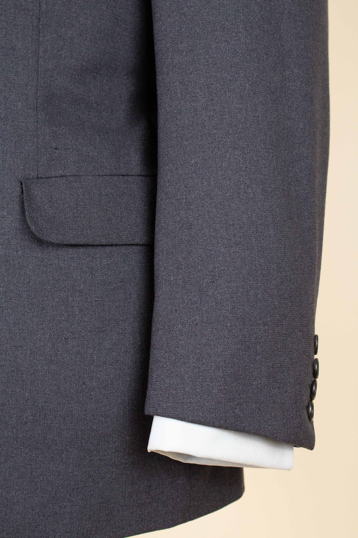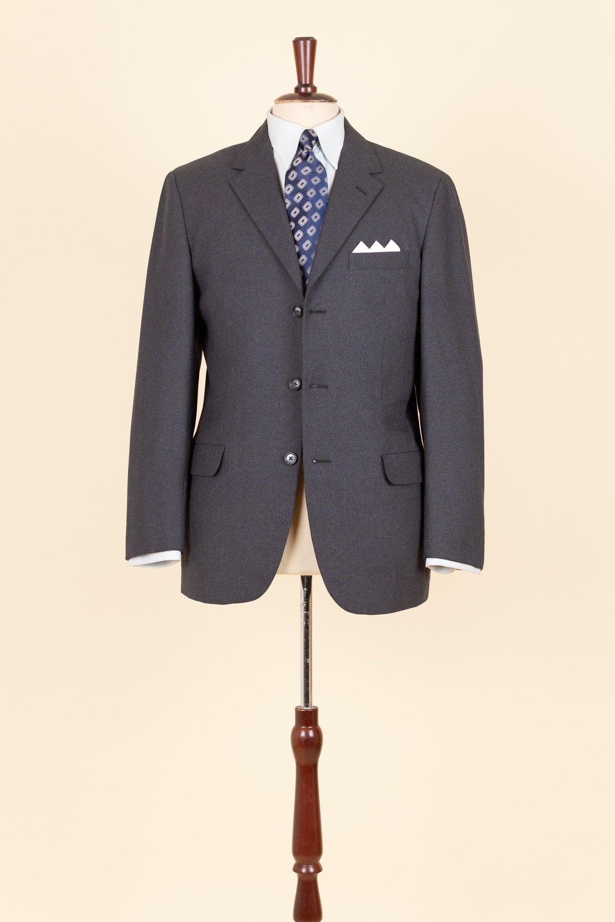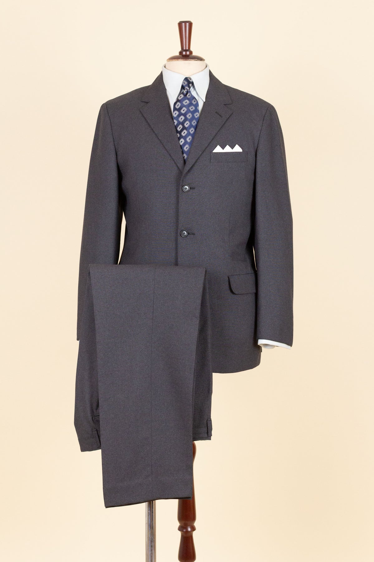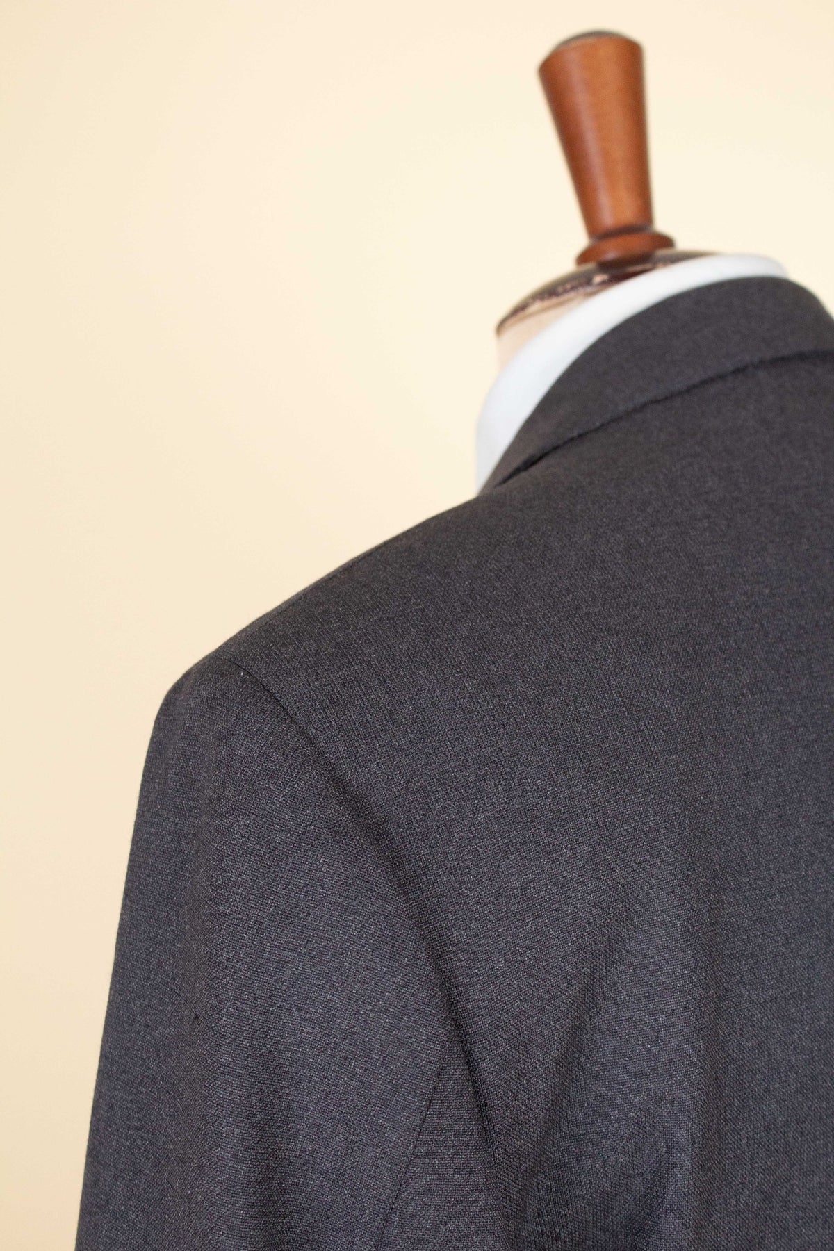 This suit is of Swedish origin, tailored sometime during the latter half of the 1960s by Pingvin, a Swedish ready-to-wear brand. It was originally sold at NK (Nordiska Kompaniet), a well-known department store in Stockholm that still exists today. The suit is made from a medium-grey fabric with a subtle heathered texture.