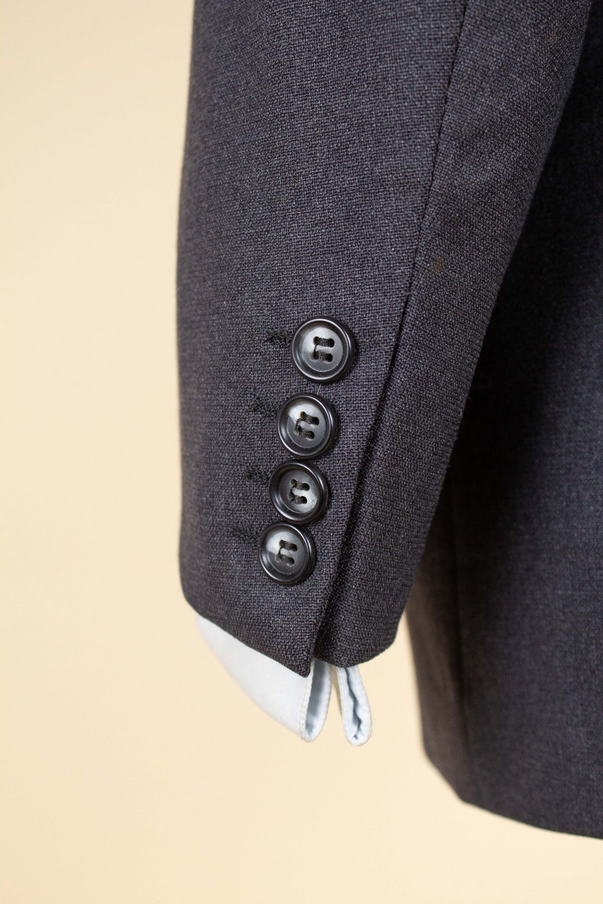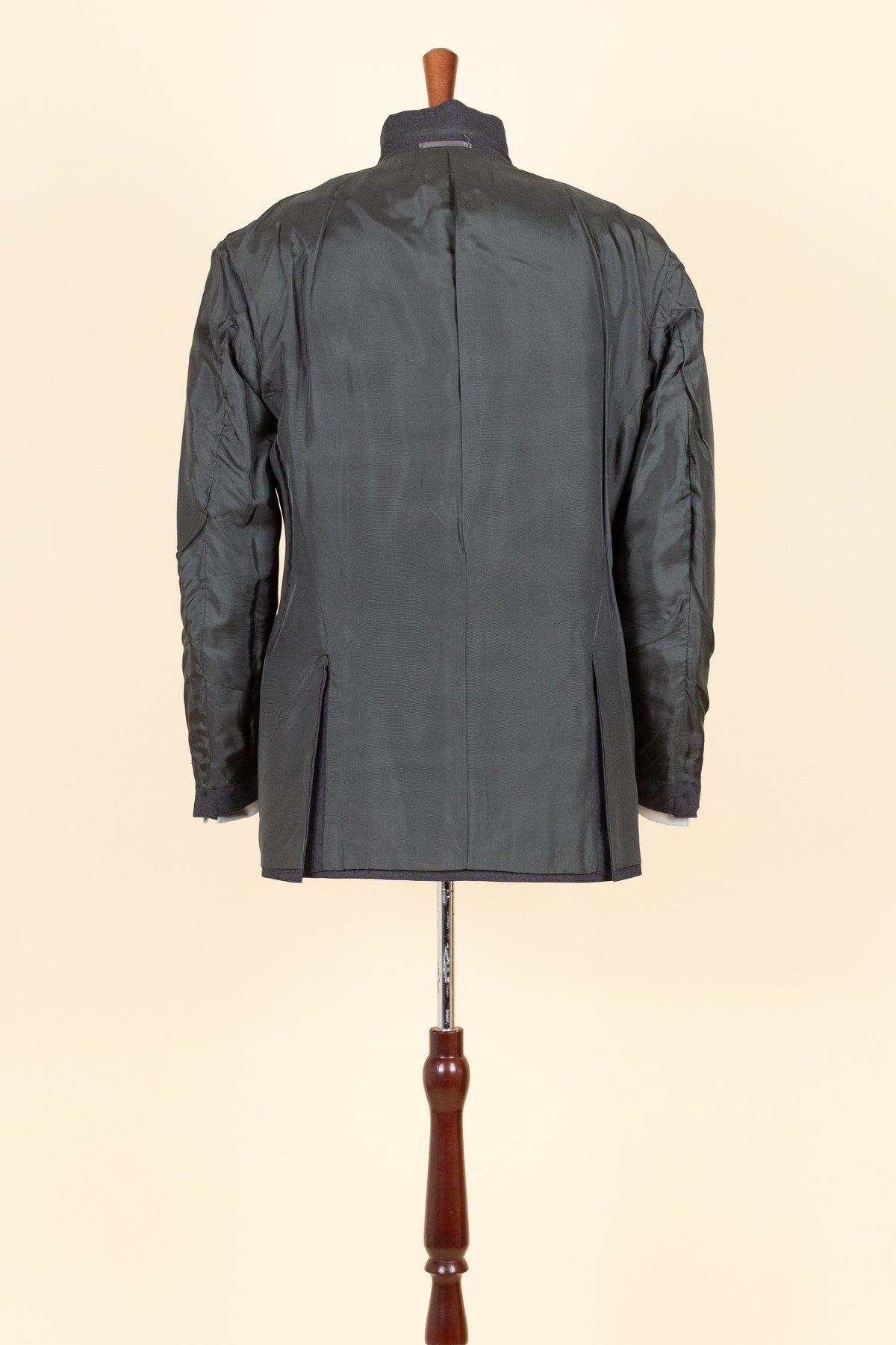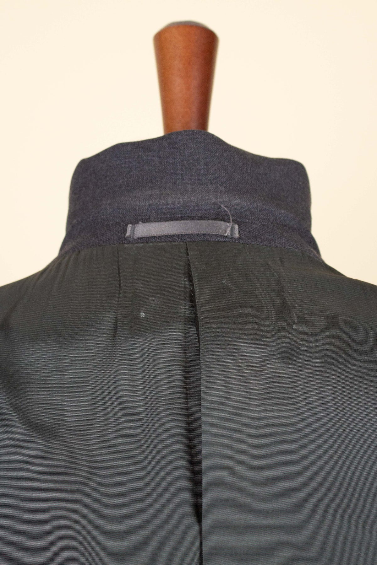 The jacket is single-breasted with three buttons. It features horizontal front pockets with flaps and a breast pocket. There is a buttonhole on the left lapel. The back is straight with double vents, which is typical of the period. The interior is fully lined with a total of four inner pockets: one large pocket on each side, plus two smaller pockets on the left side.