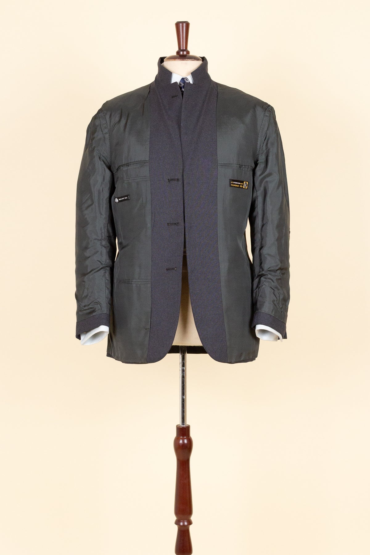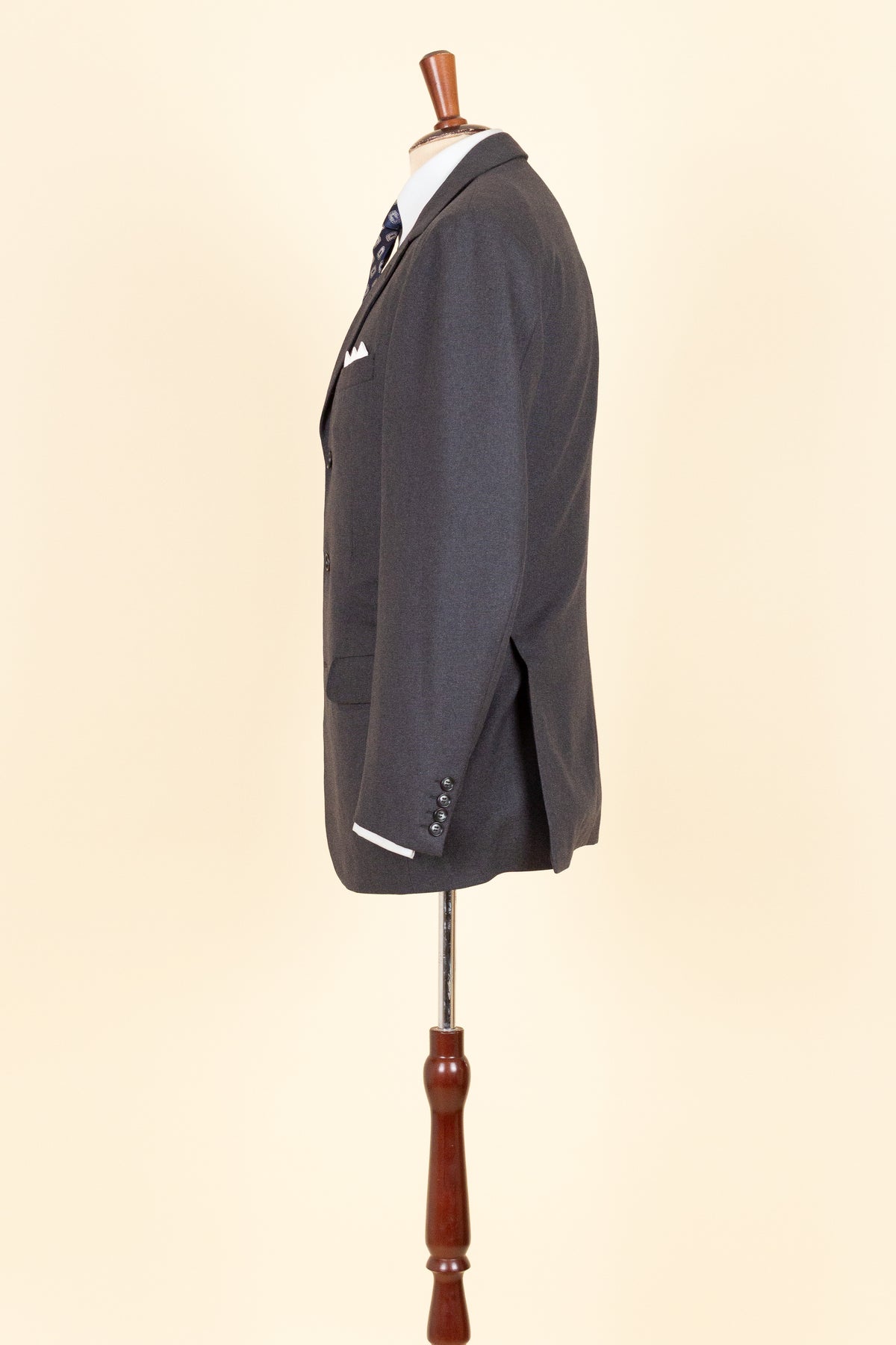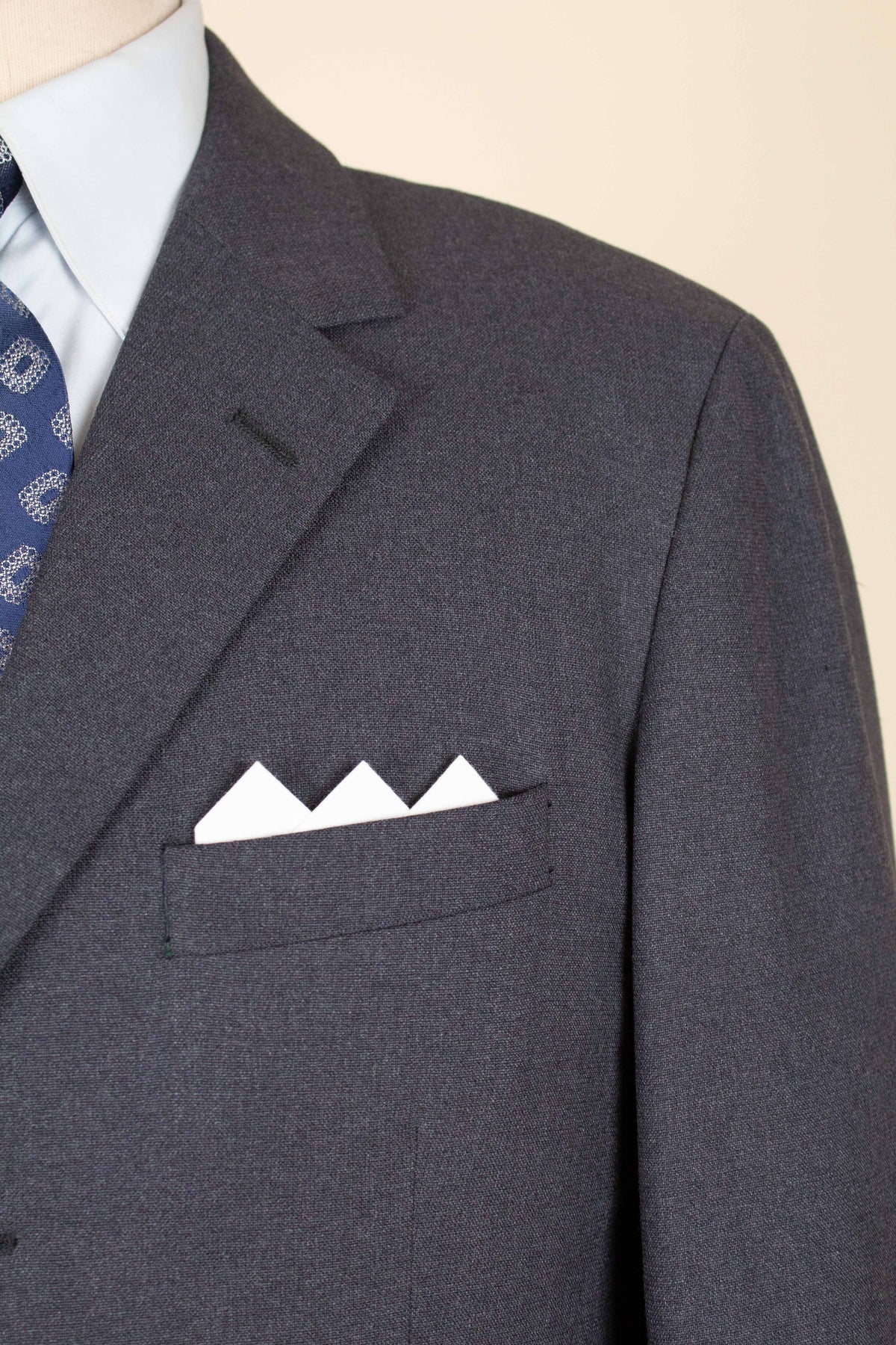 The jacket is single-breasted with three buttons. It features horizontal front pockets with flaps and a breast pocket. There is a buttonhole on the left lapel. The back is straight with double vents, which is typical of the period. The interior is fully lined with a total of four inner pockets: one large pocket on each side, plus two smaller pockets on the left side.
