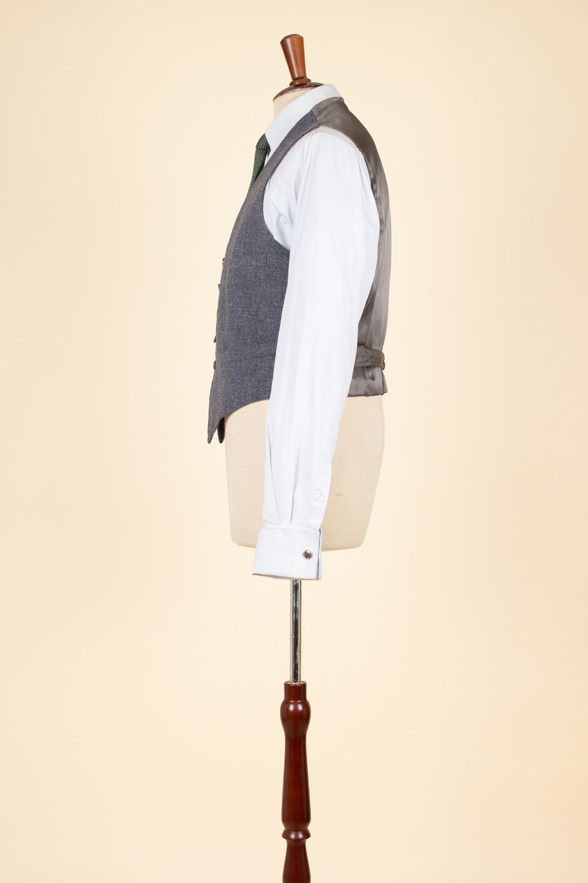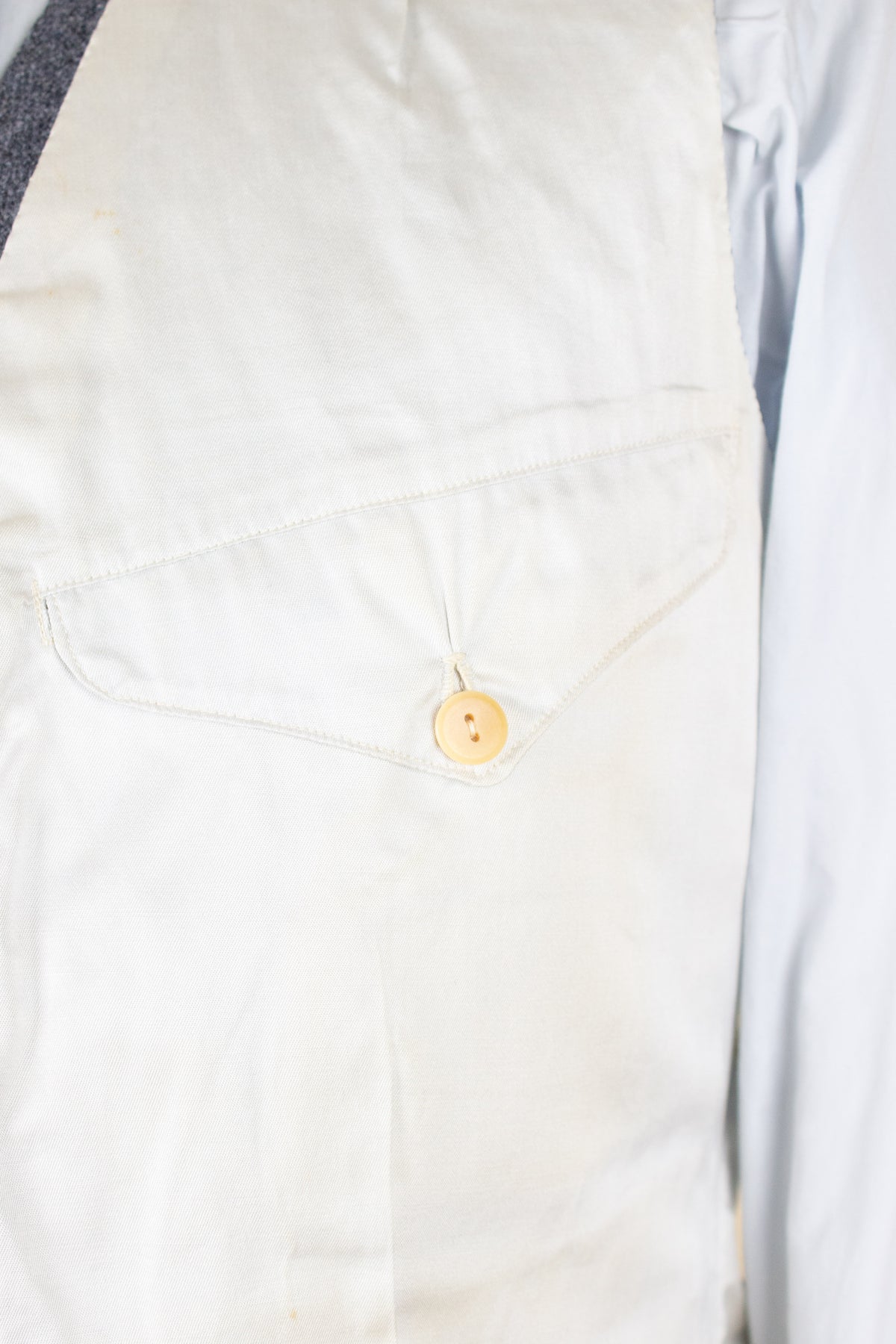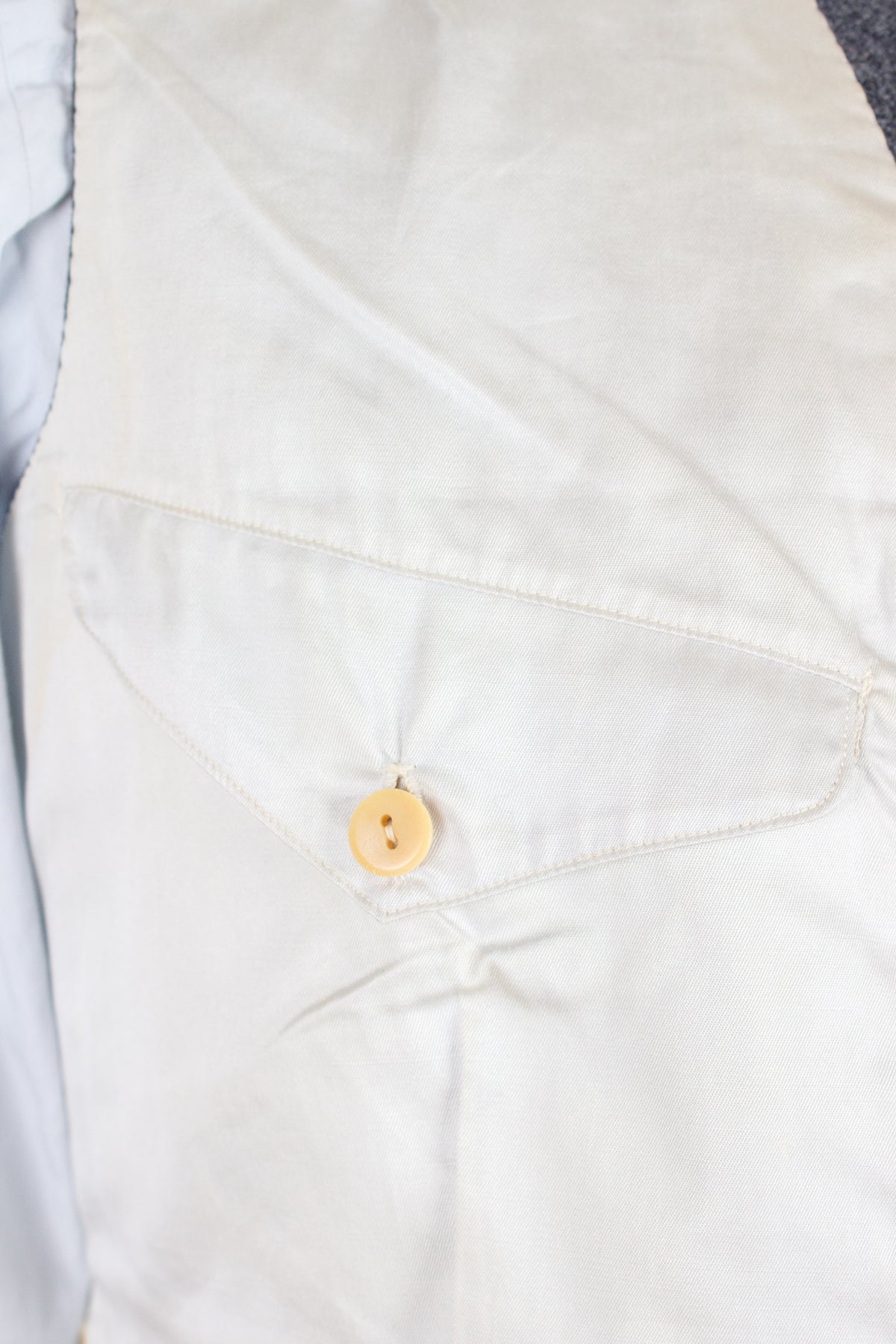 The waistcoat is single-breasted with six buttons and four front pockets – two at chest height and two lower ones. On the back, it has an adjustable strap, and inside it is lined with light cotton twill. It also features two internal pockets with flaps and button closures – a detail almost exclusively found in bespoke tailoring.