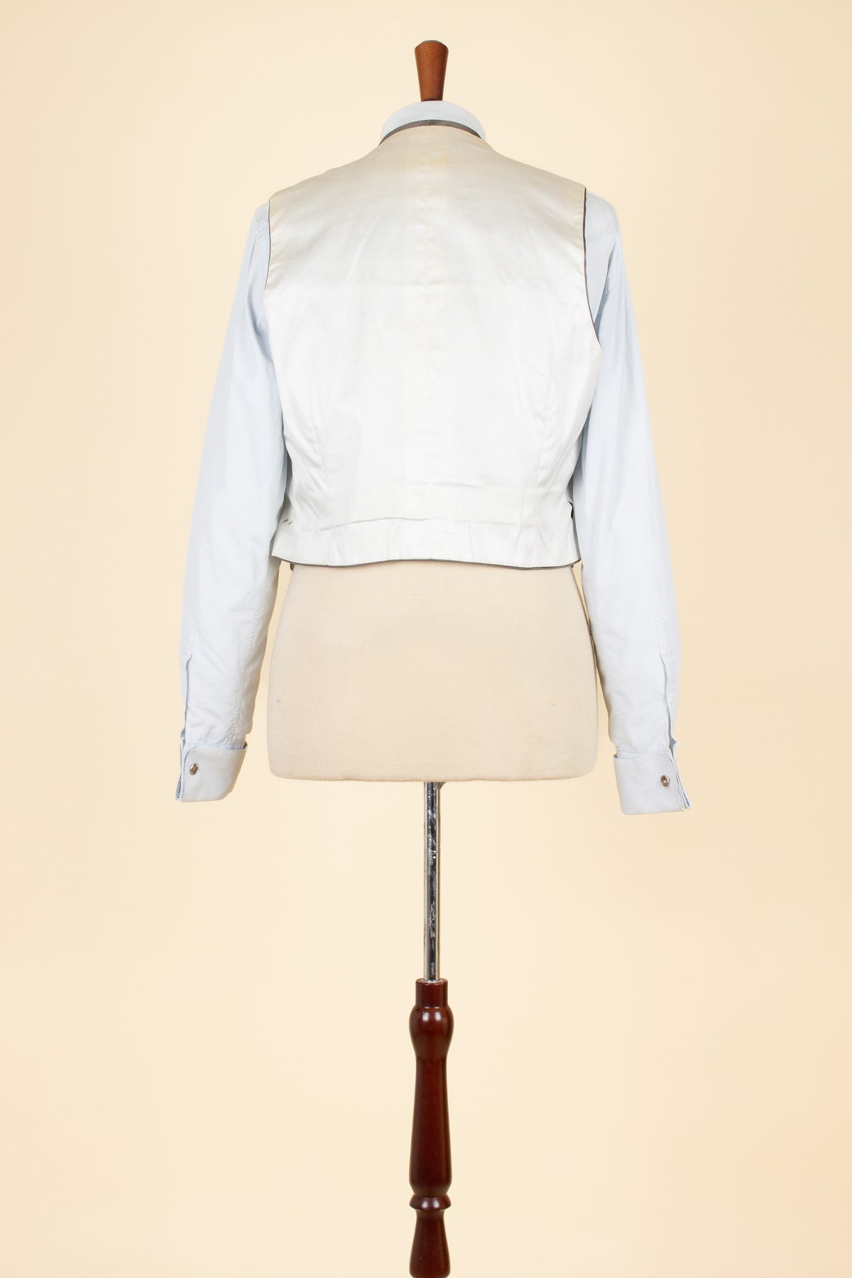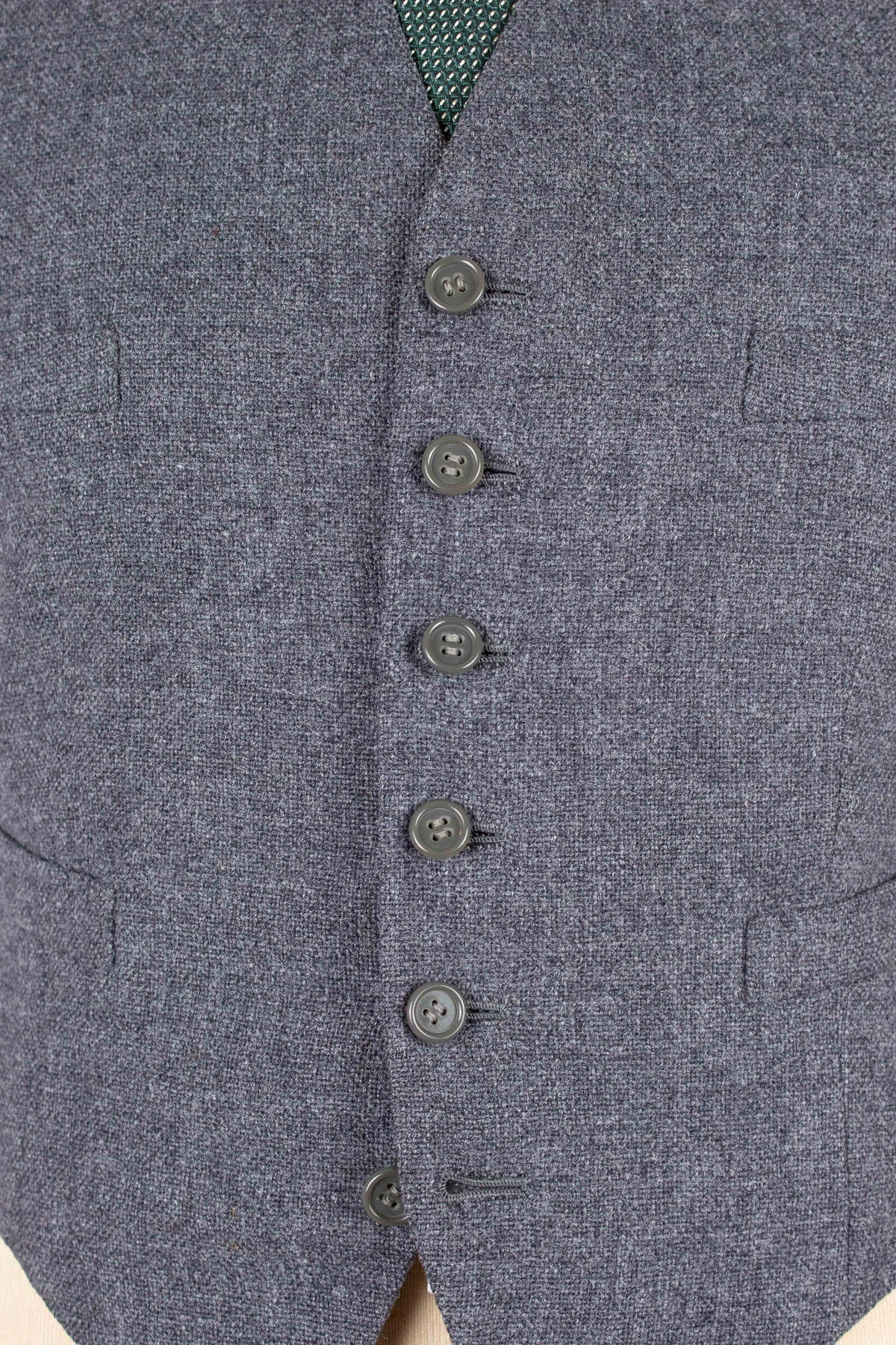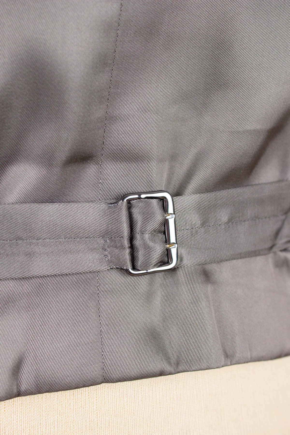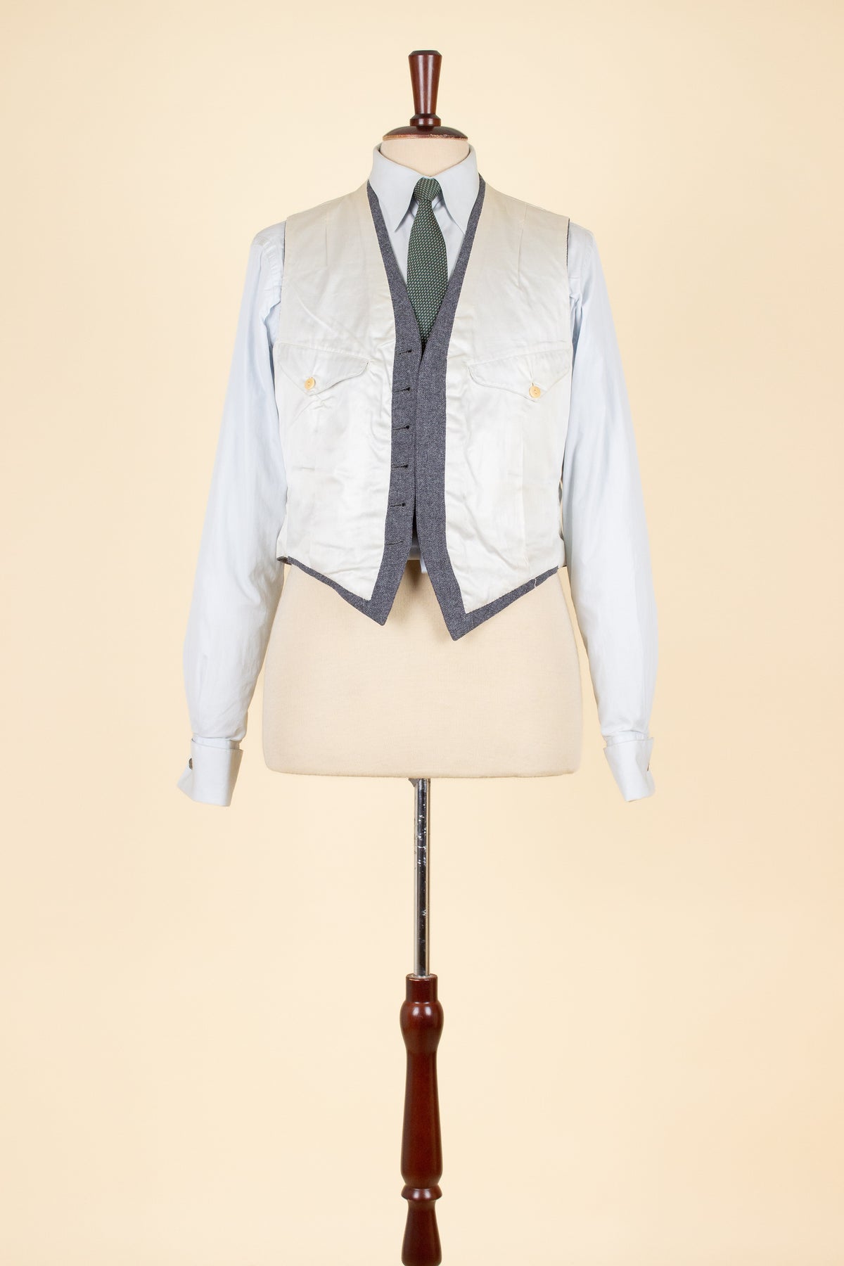 The waistcoat is single-breasted with six buttons and four front pockets – two at chest height and two lower ones. On the back, it has an adjustable strap, and inside it is lined with light cotton twill. It also features two internal pockets with flaps and button closures – a detail almost exclusively found in bespoke tailoring.